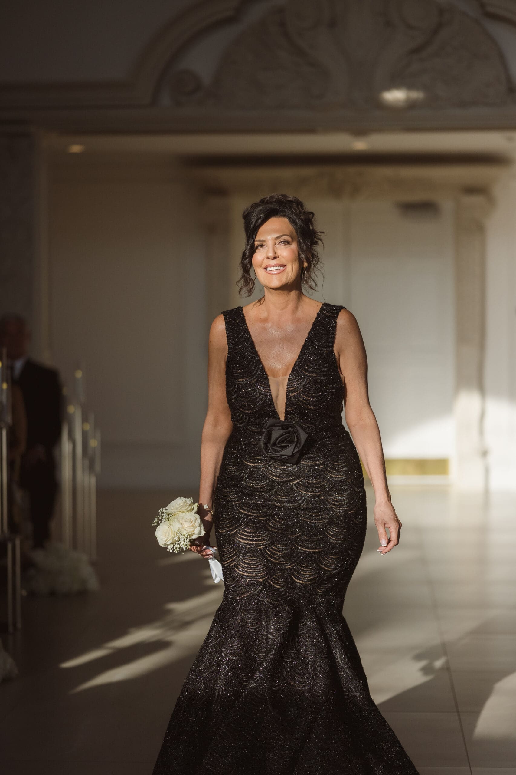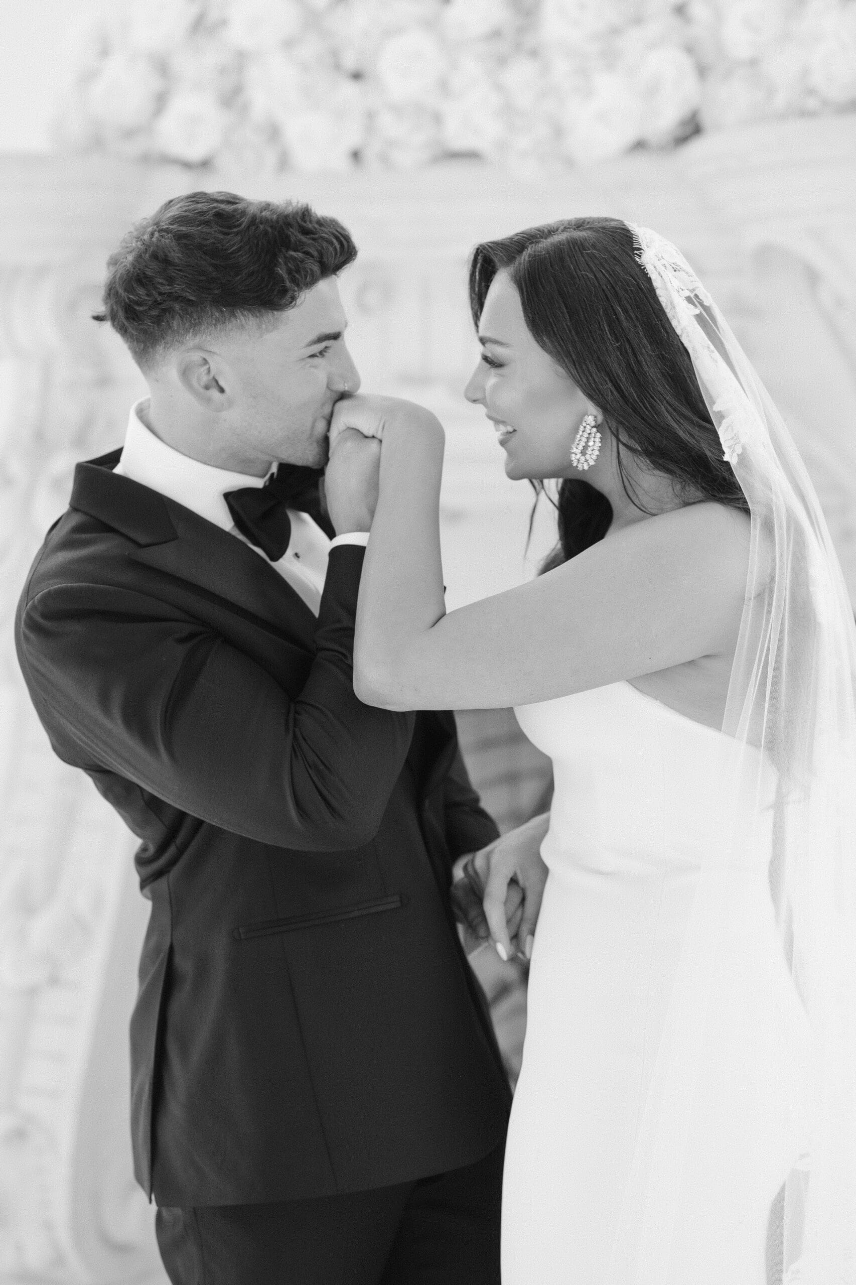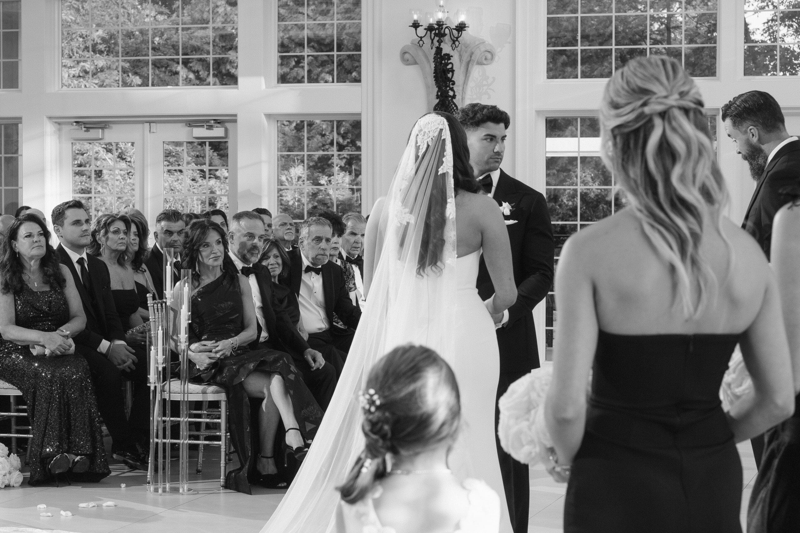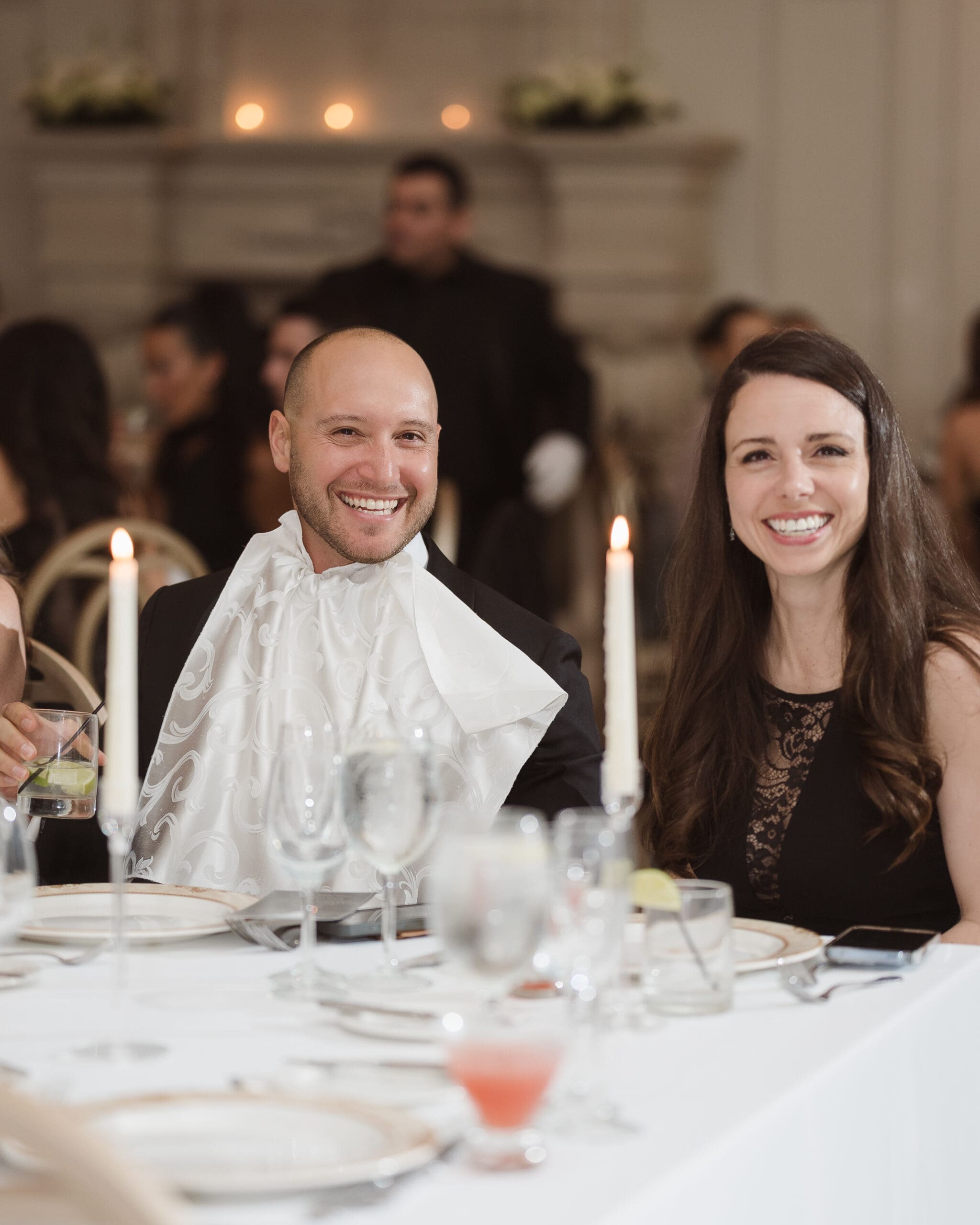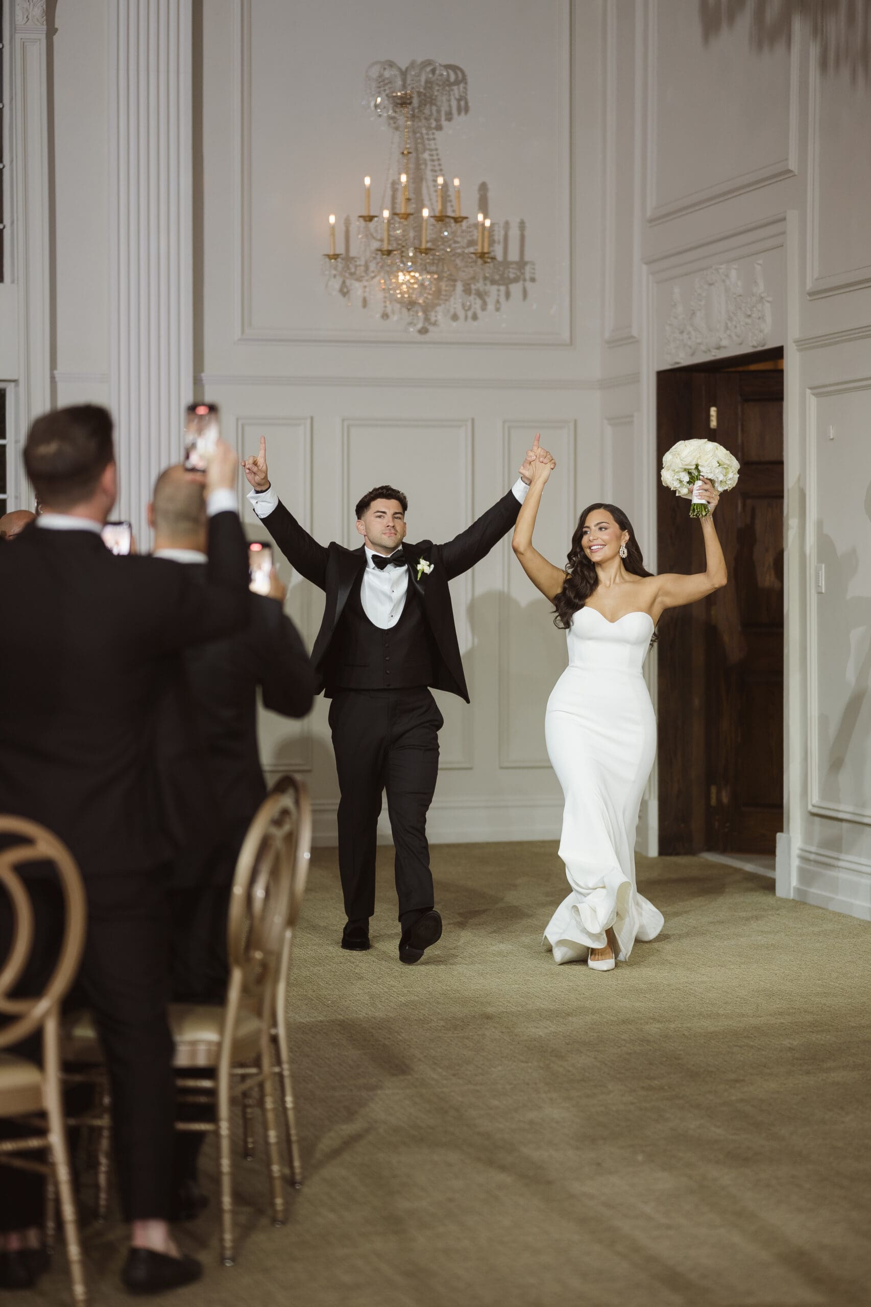 The couple requested a formal dress code in all black. The floral arrangements featured a mix of white and ivory, with minimal greenery.