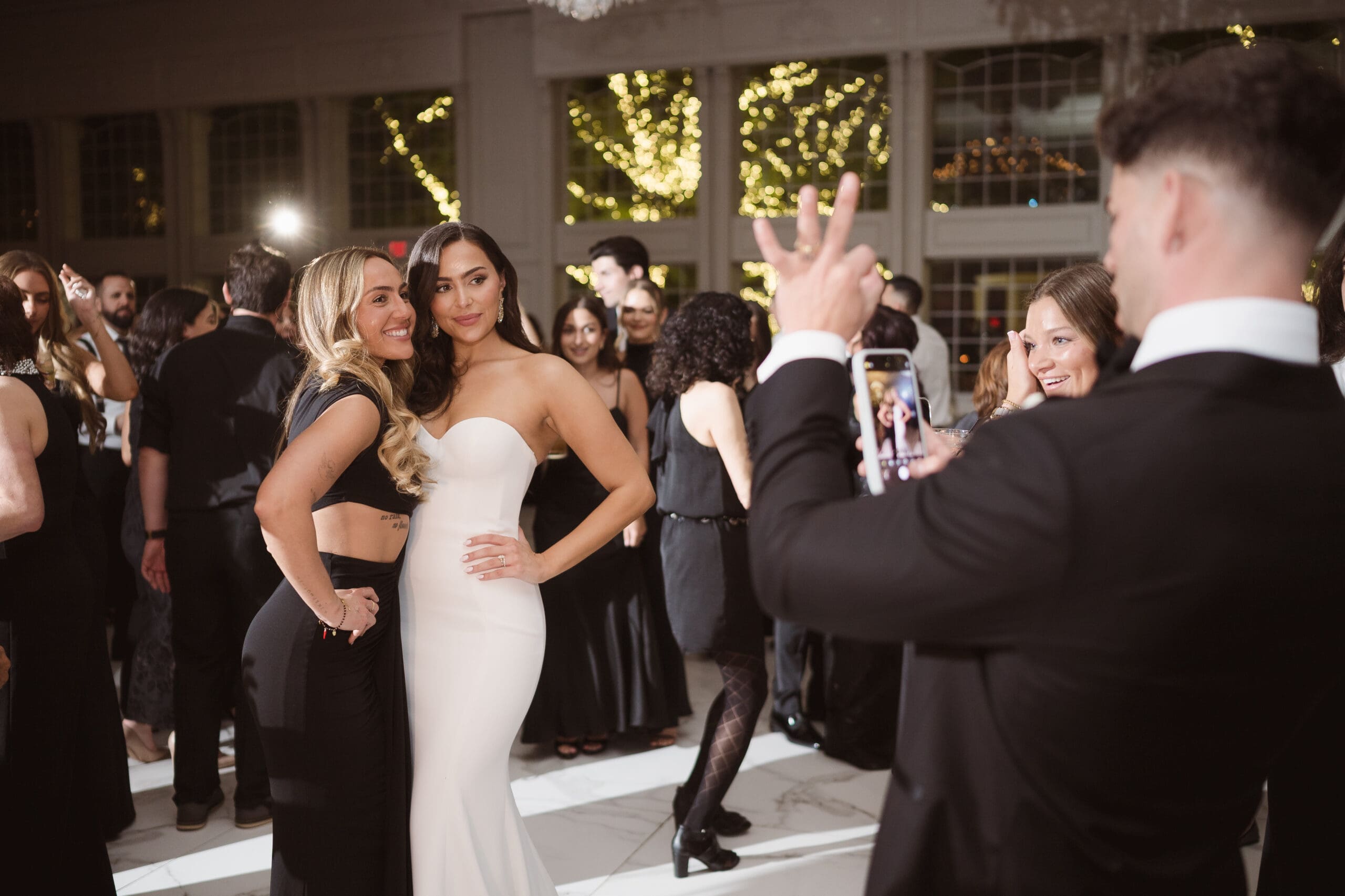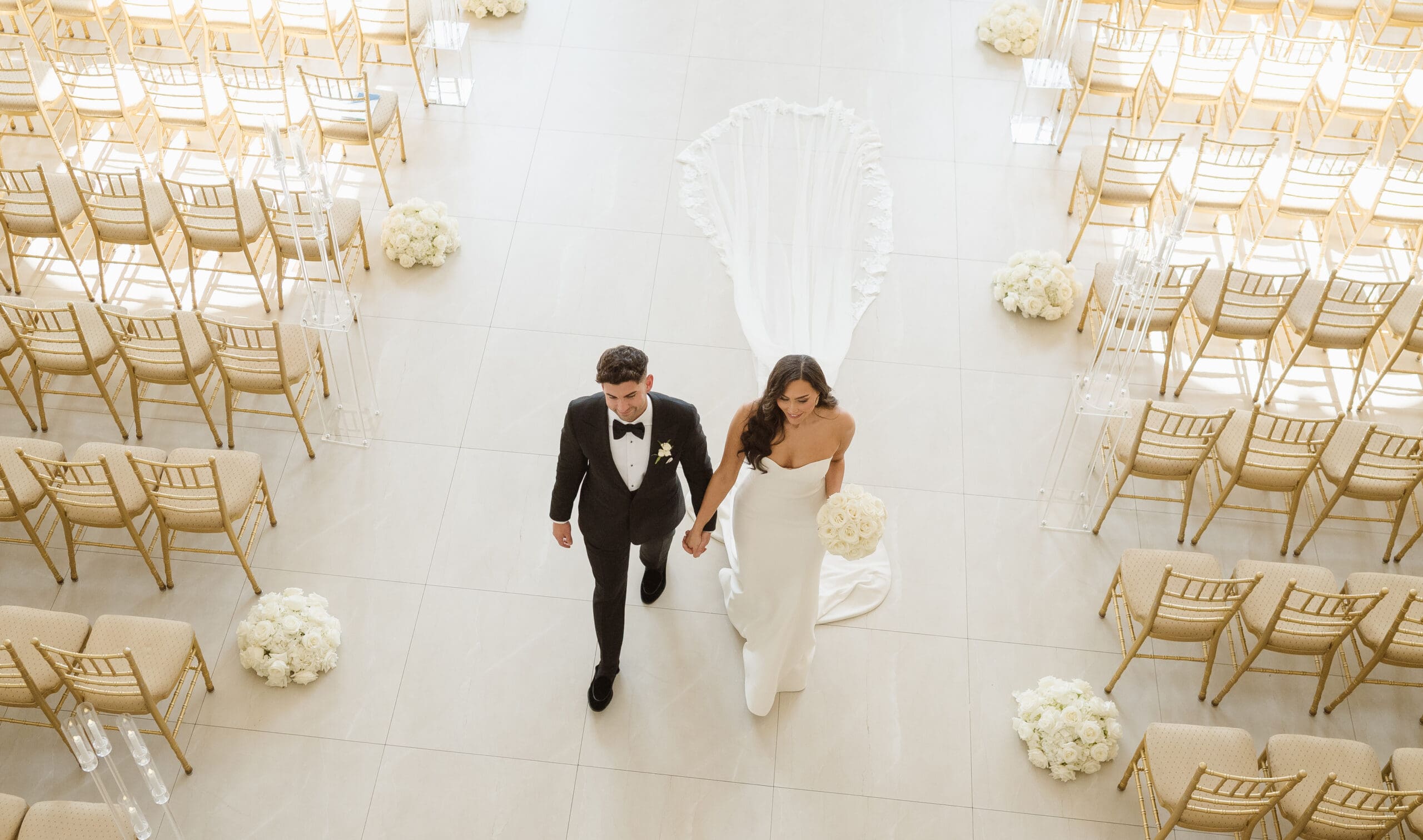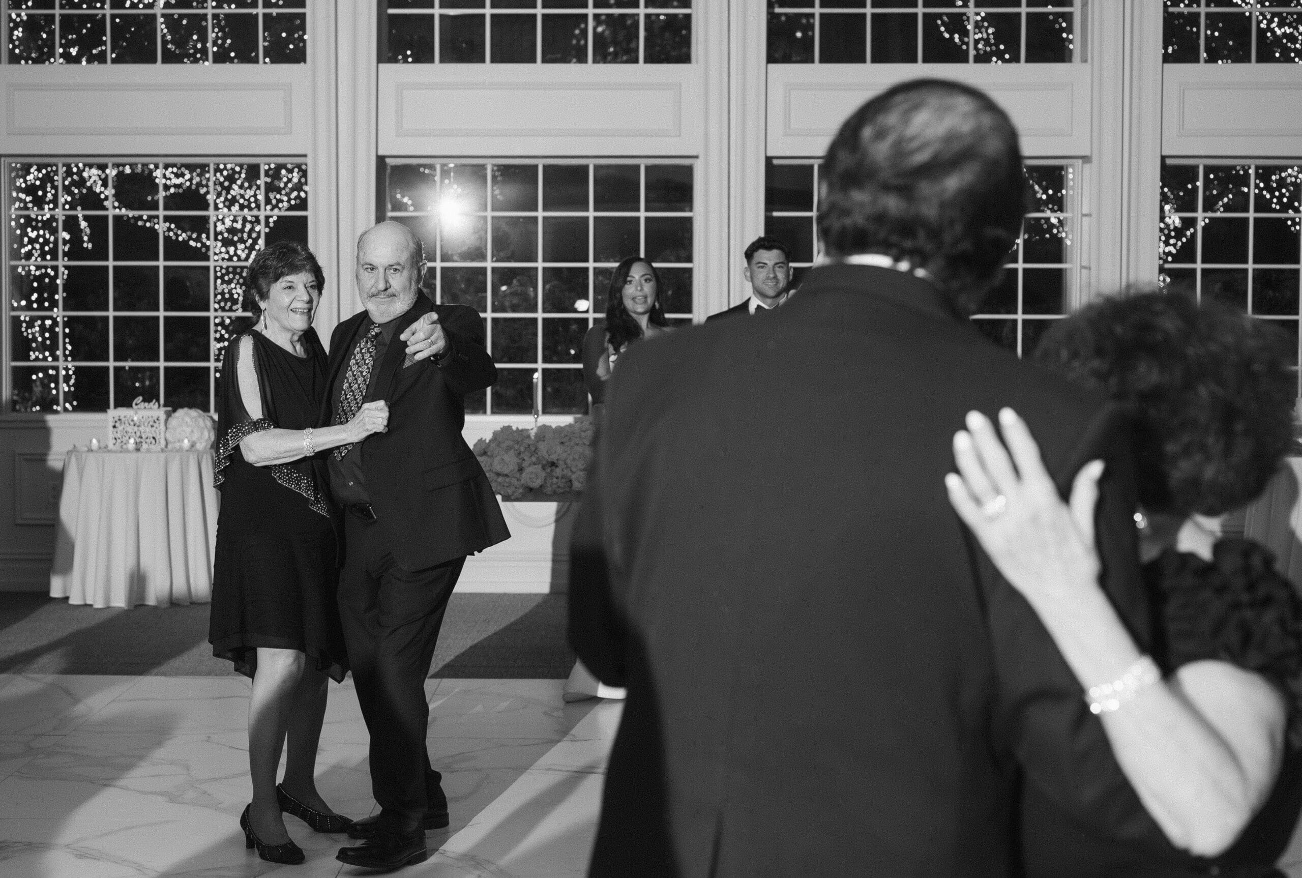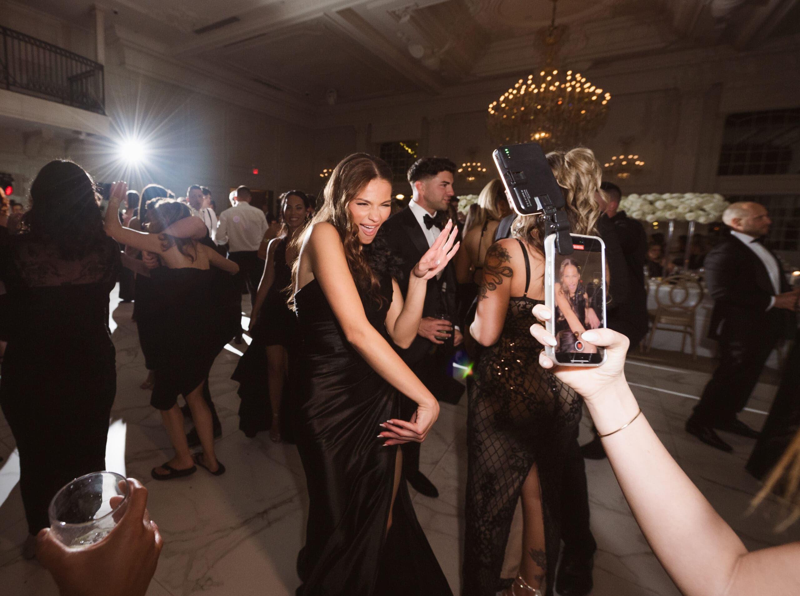 The couple requested a formal dress code in all black. The floral arrangements featured a mix of white and ivory, with minimal greenery.