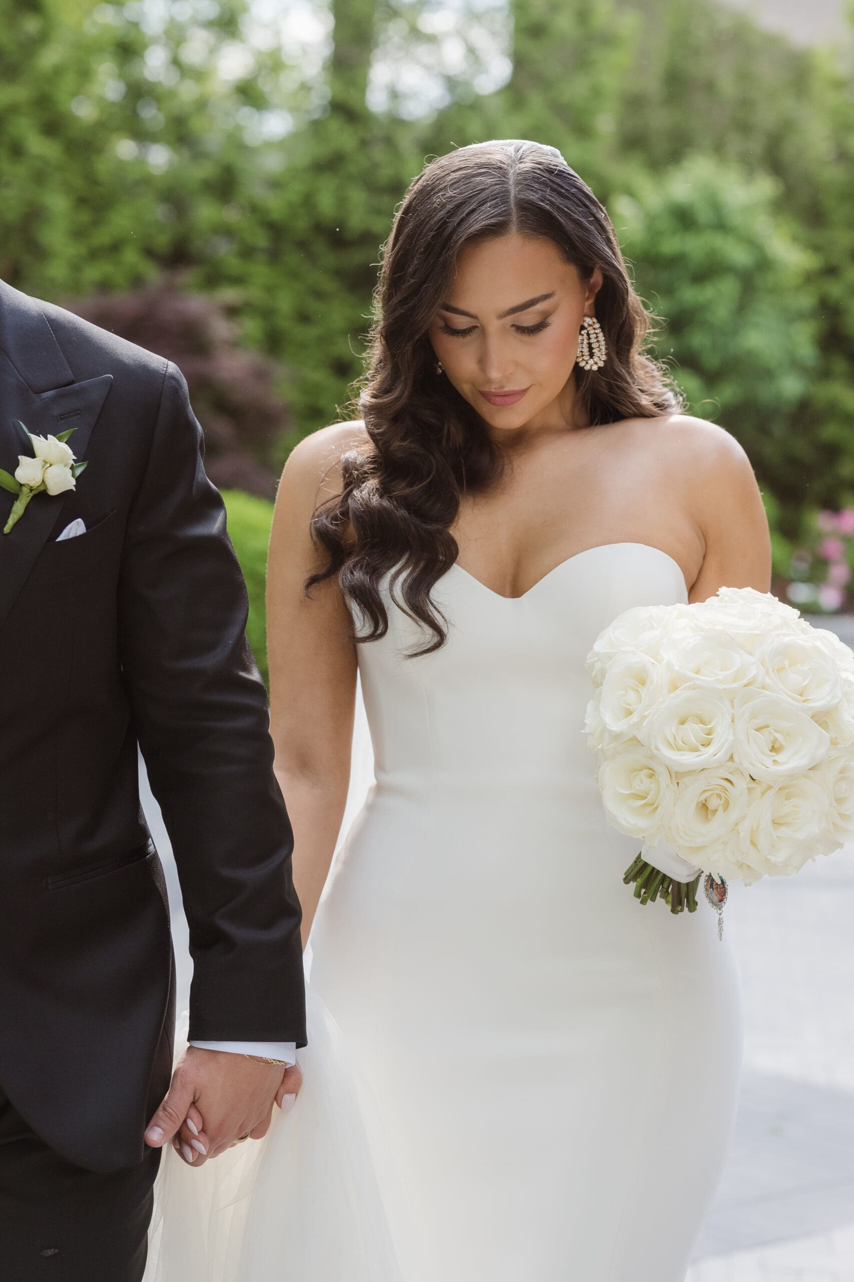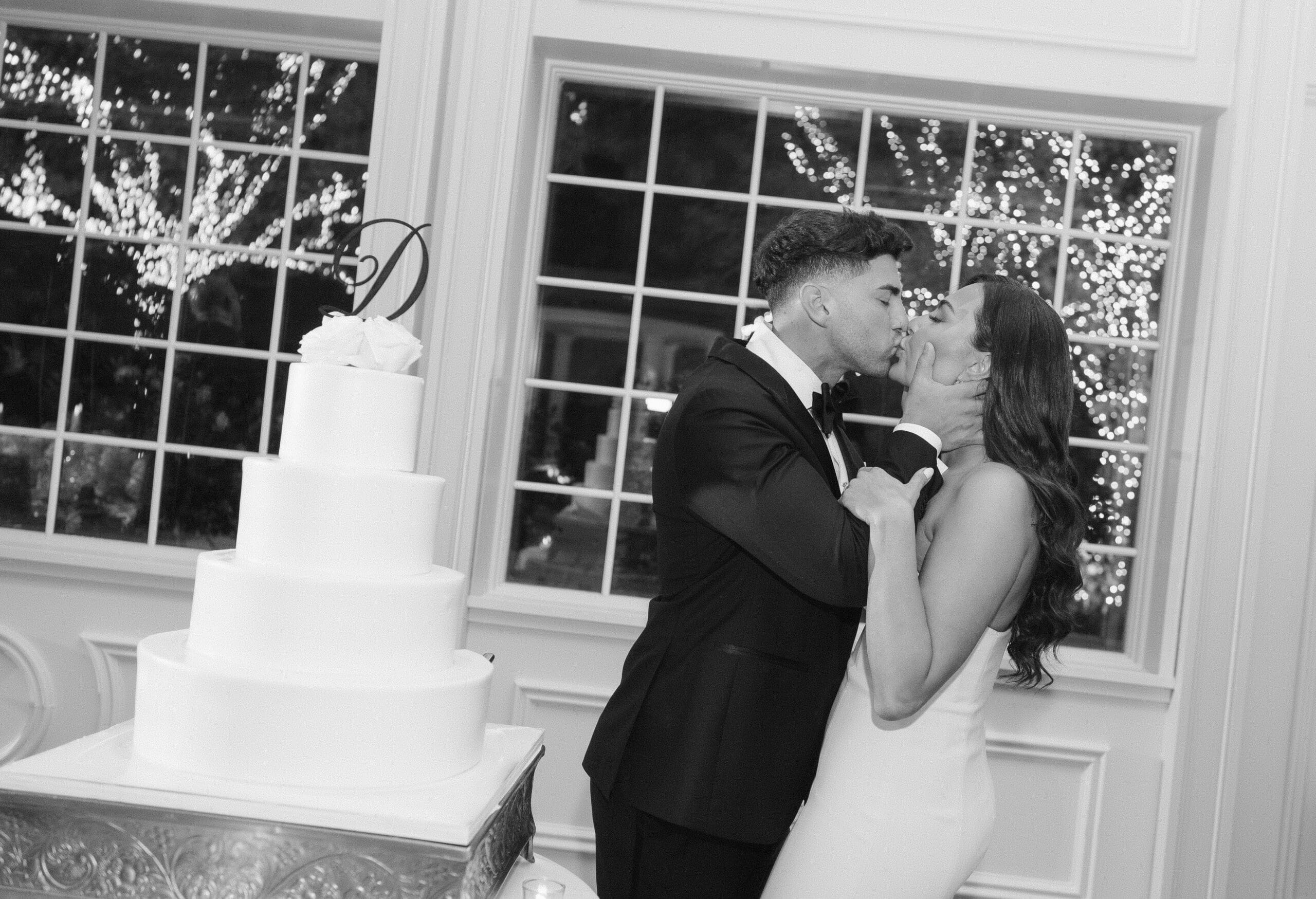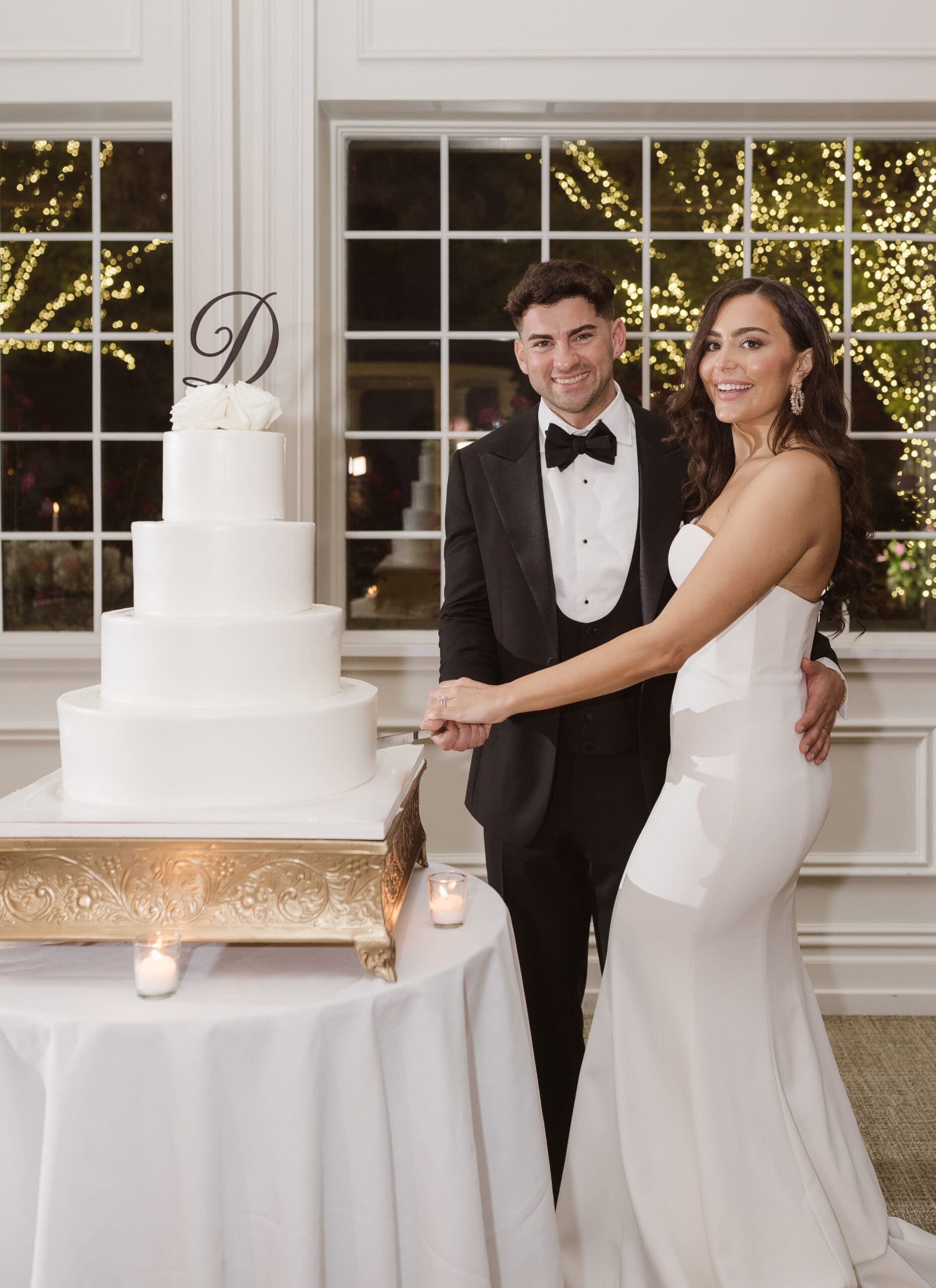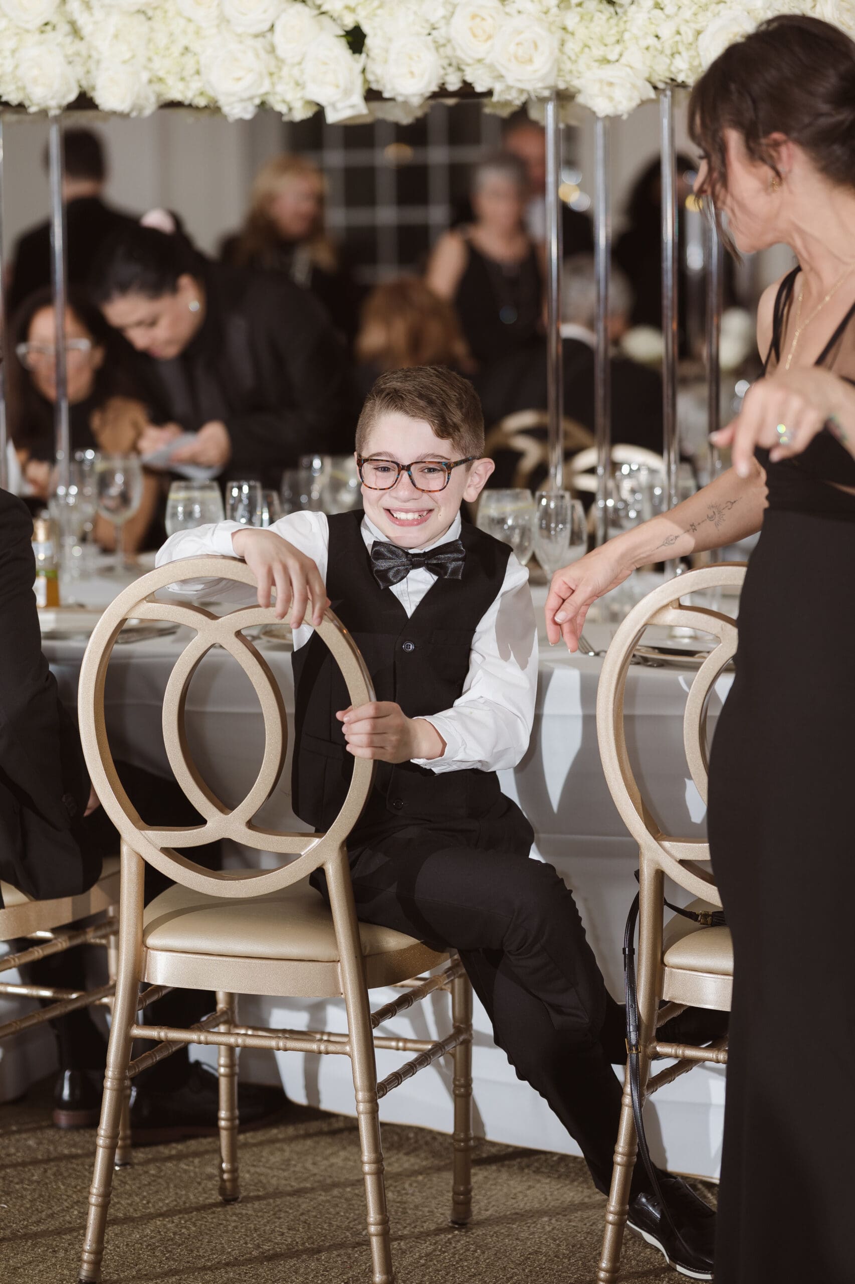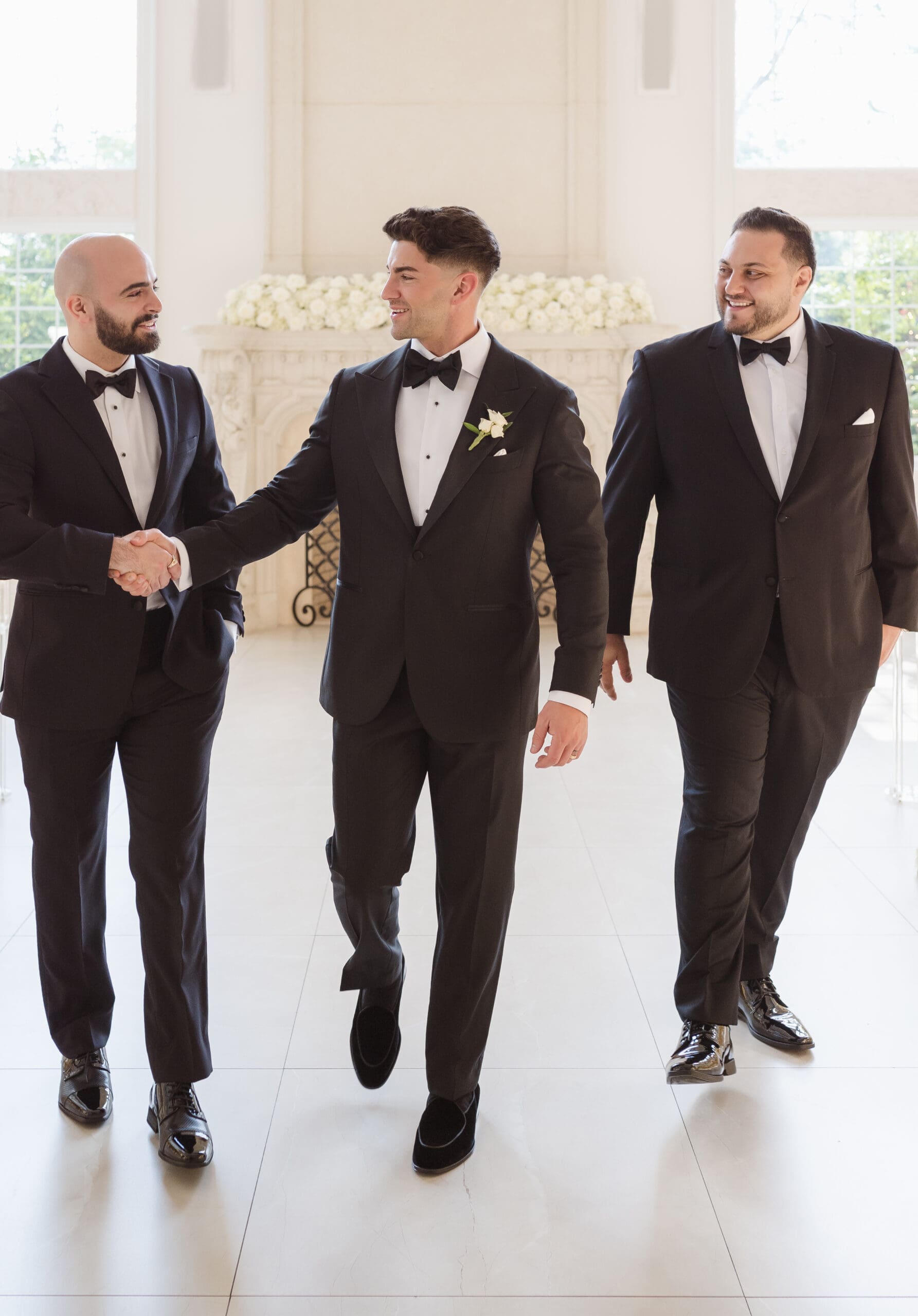 The couple requested a formal dress code in all black. The floral arrangements featured a mix of white and ivory, with minimal greenery.