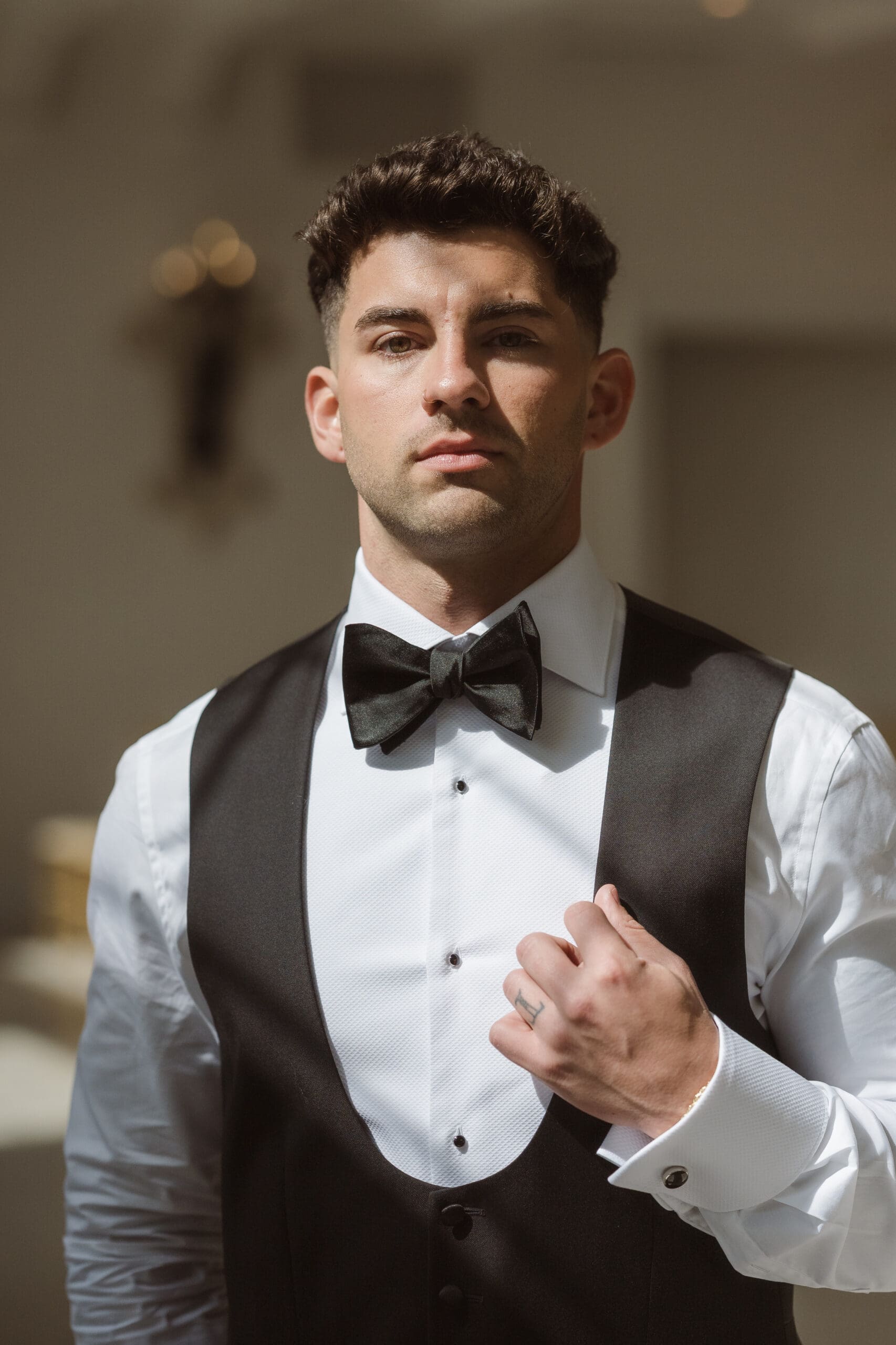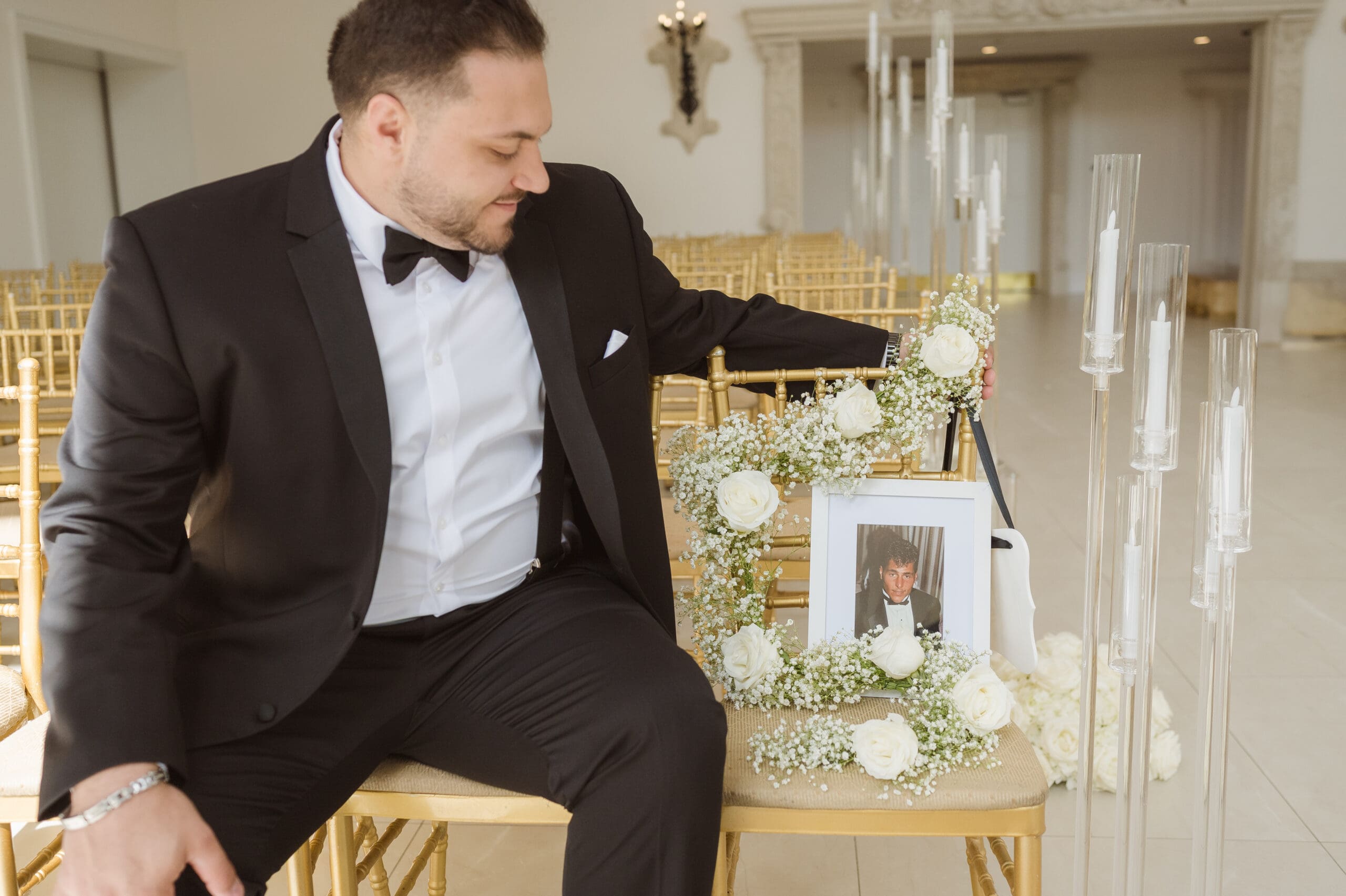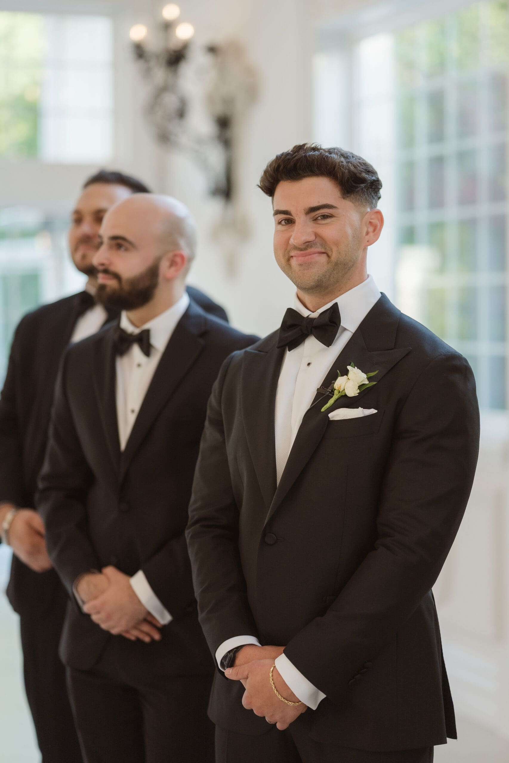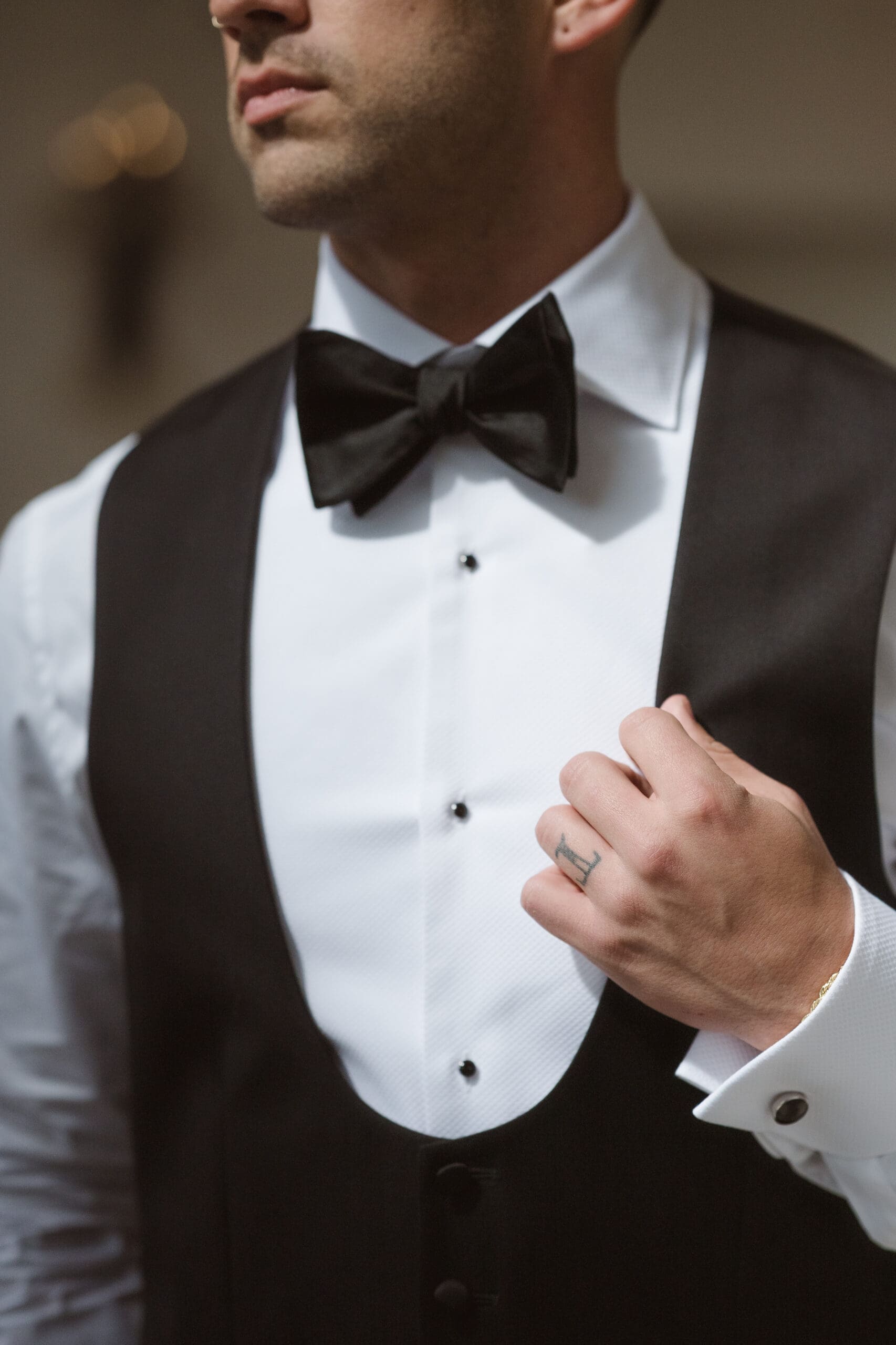 Instead of preparing in the bride and groom suites, we chose to take photos in the ceremony space, as it offered the best lighting while still allowing privacy for each couple’s portrait session. The groom got ready in the lower basement level, near the cocktail hour area, while the bride prepared in the suite on the second level, above the ceremony space.