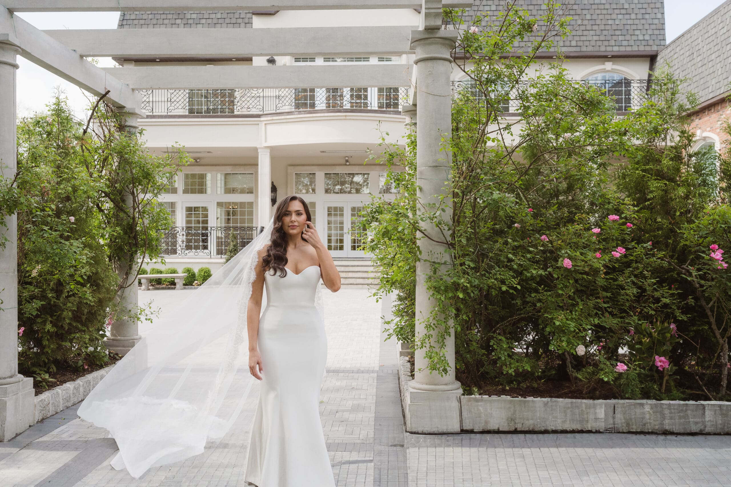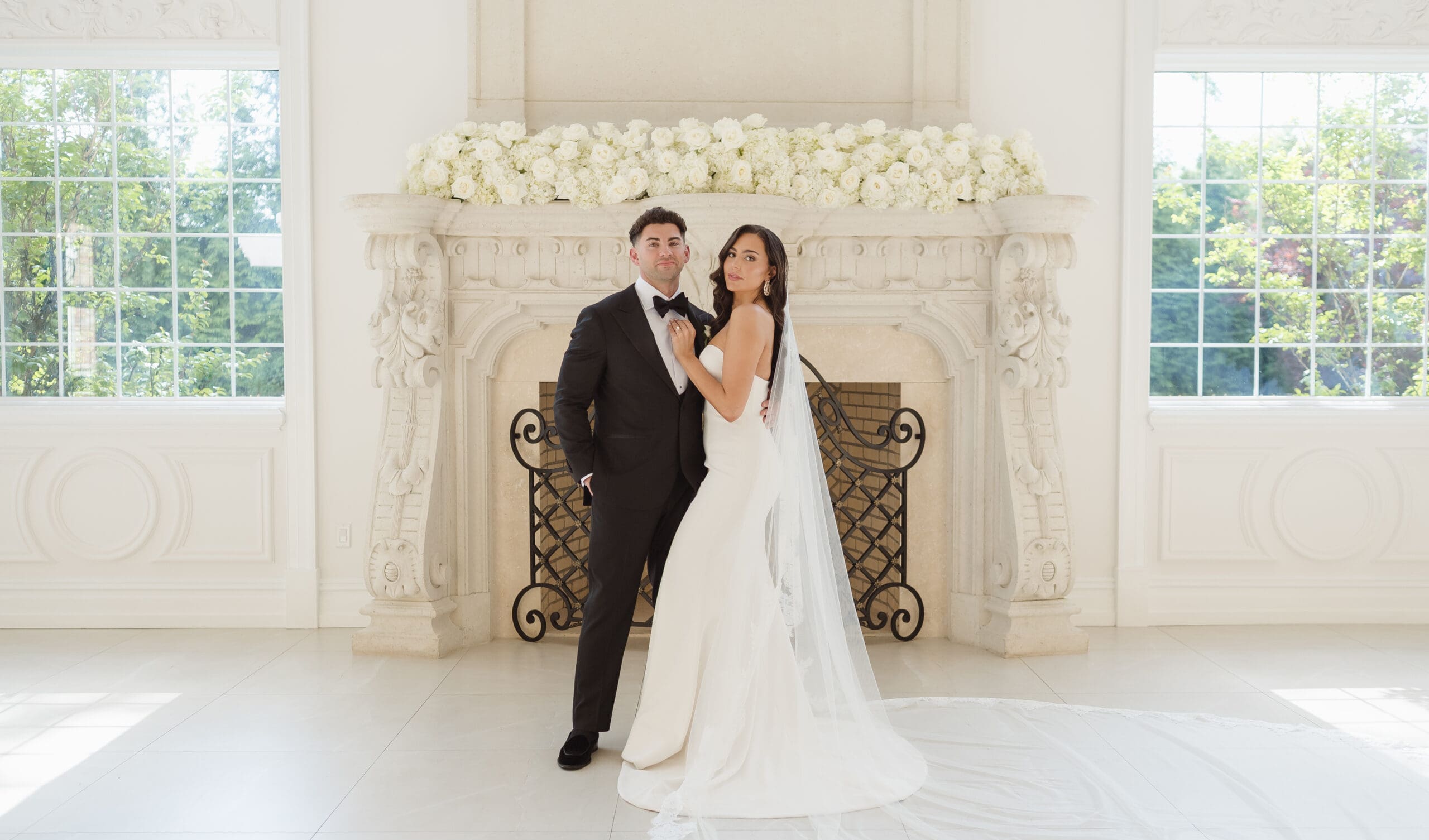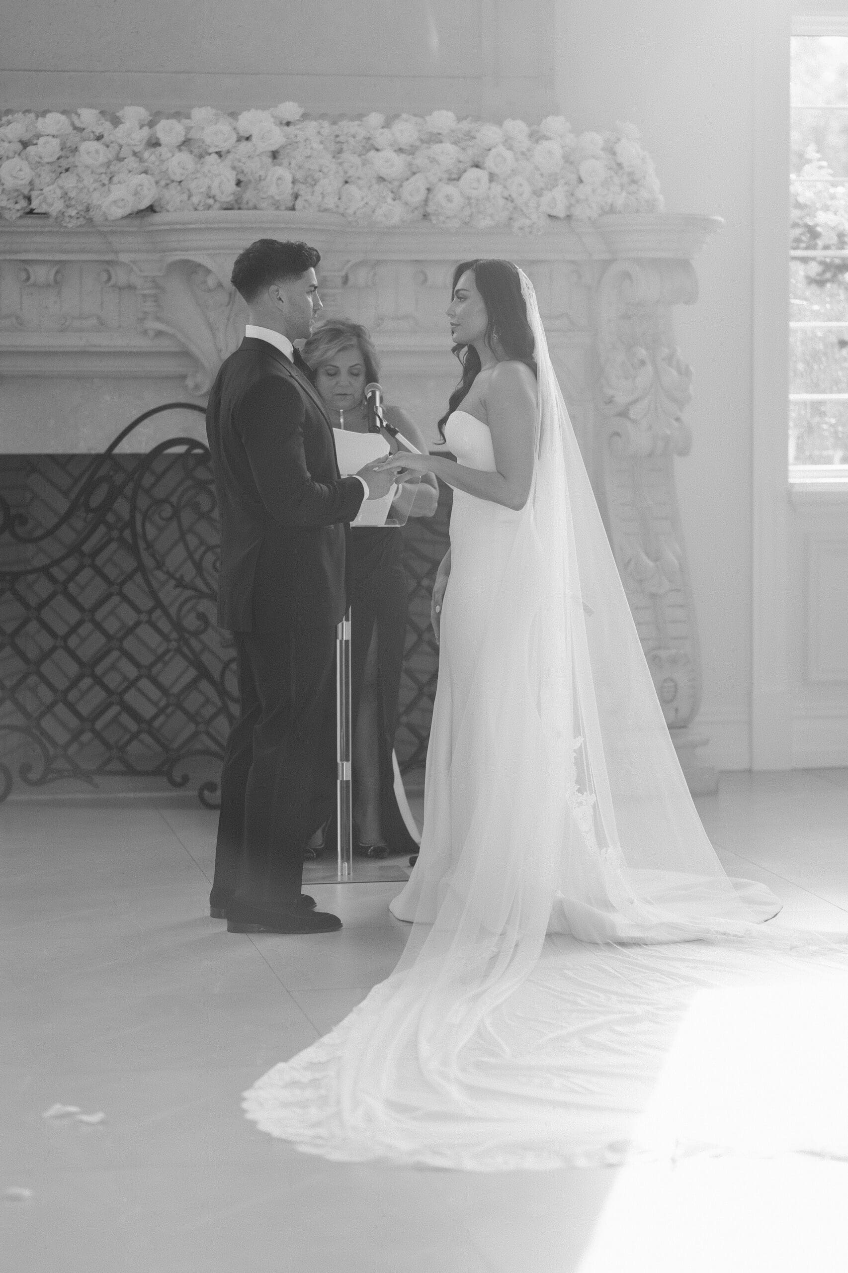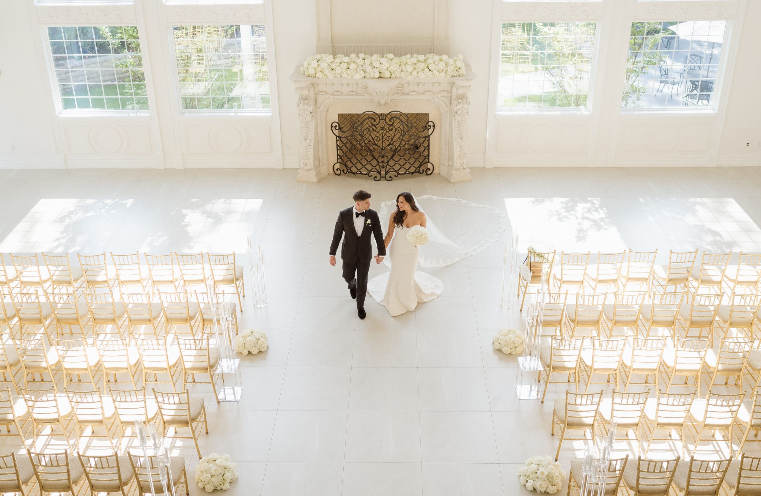 If rain should grace your wedding day, fear not—the ceremony room serves as an ideal location for beautiful portraits. When the weather is on your side, the manicured gardens and surrounding areas turn into breathtaking spots for photos. While some couples may opt for an outdoor ceremony, this couple chose the indoor option, knowing the outdoor space can still create magical photo opportunities with its gorgeous gazebo and columns. The venue itself is a captivating backdrop, ensuring that wedding photographs at the Estate at Florentine Gardens are nothing short of extraordinary.