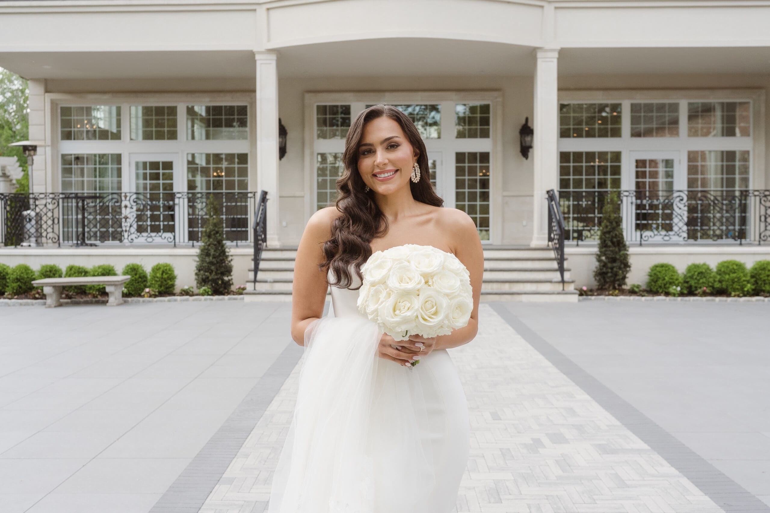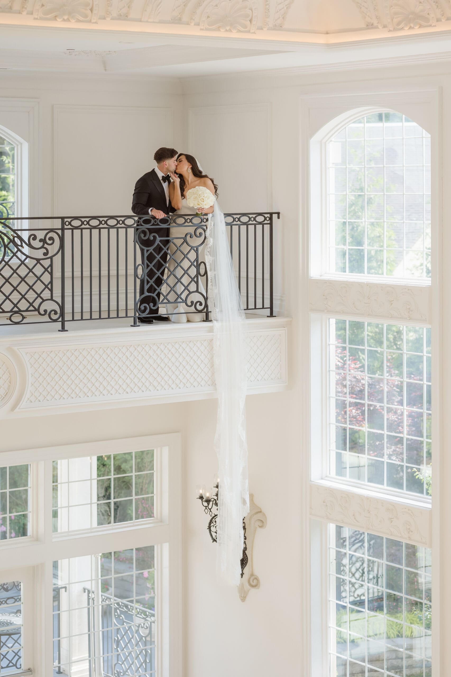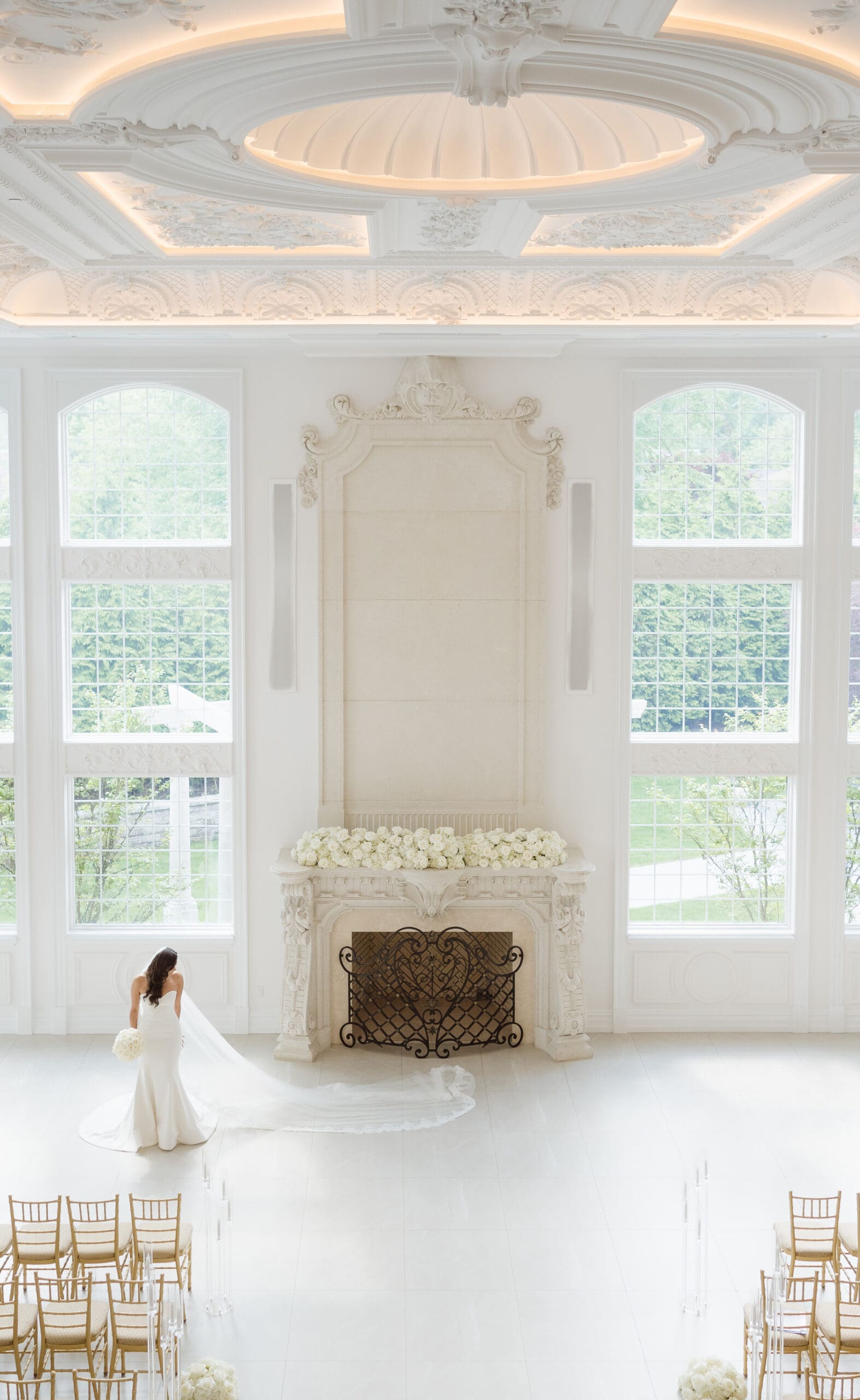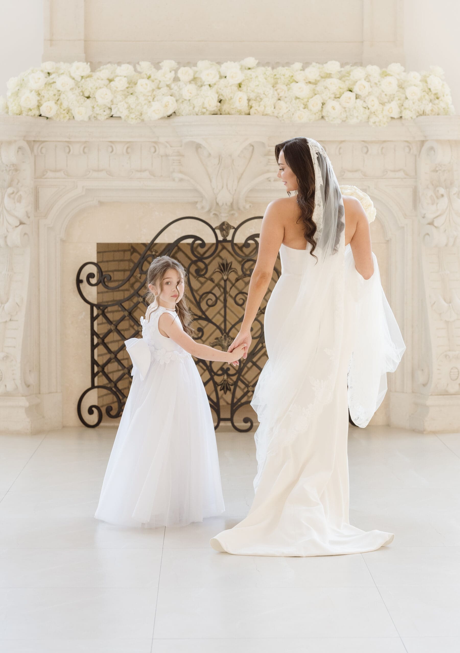 If rain should grace your wedding day, fear not—the ceremony room serves as an ideal location for beautiful portraits. When the weather is on your side, the manicured gardens and surrounding areas turn into breathtaking spots for photos. While some couples may opt for an outdoor ceremony, this couple chose the indoor option, knowing the outdoor space can still create magical photo opportunities with its gorgeous gazebo and columns. The venue itself is a captivating backdrop, ensuring that wedding photographs at the Estate at Florentine Gardens are nothing short of extraordinary.