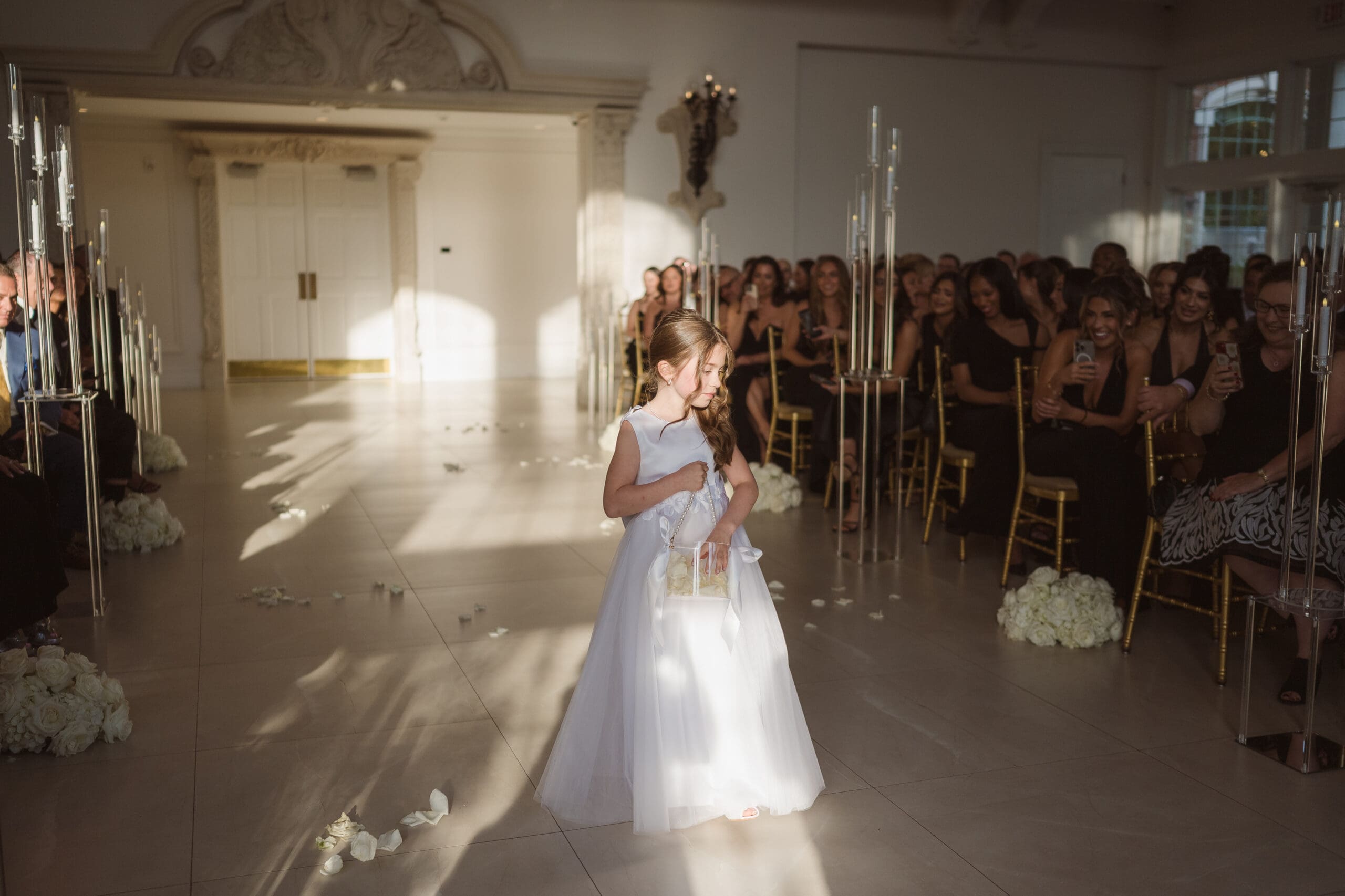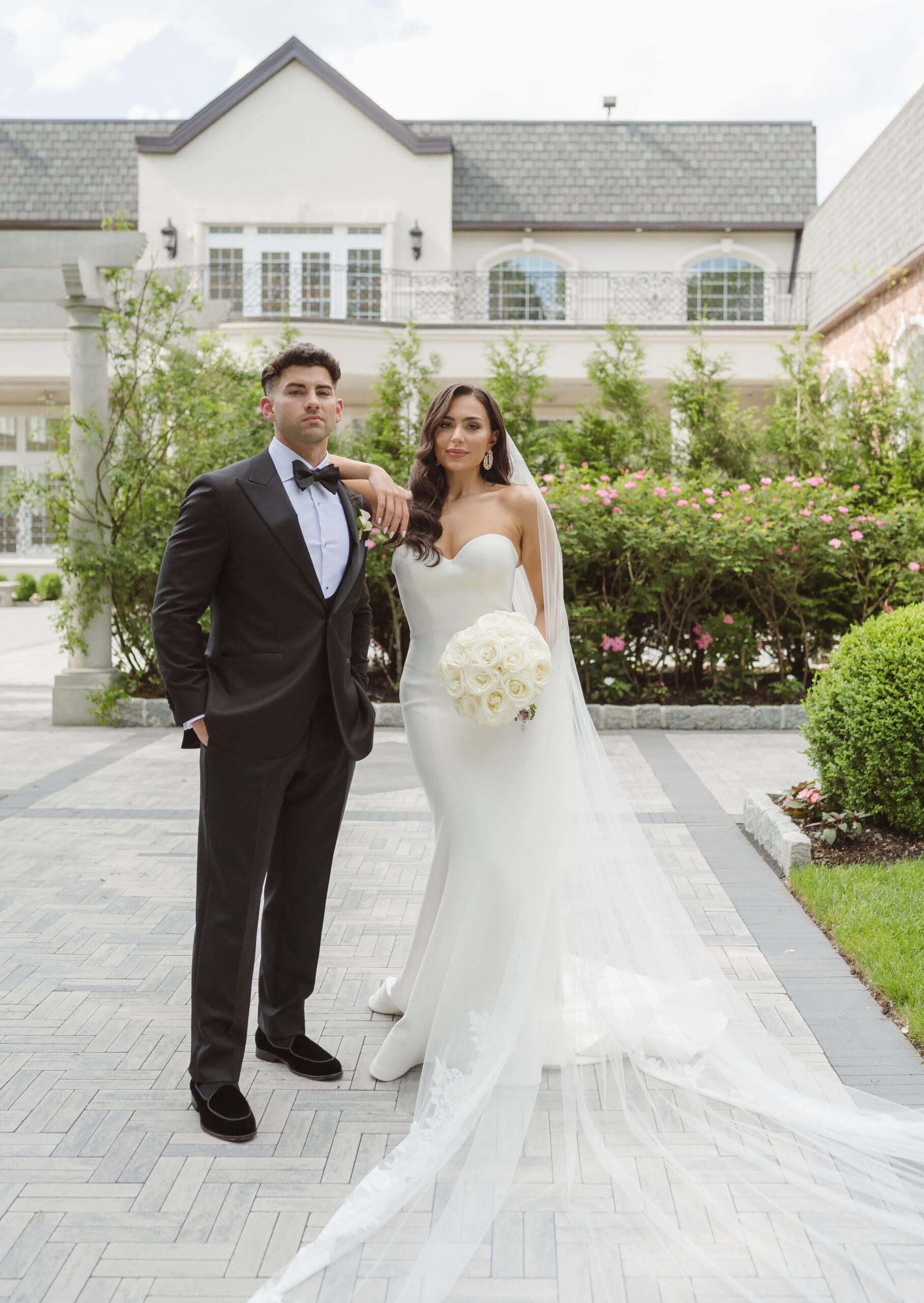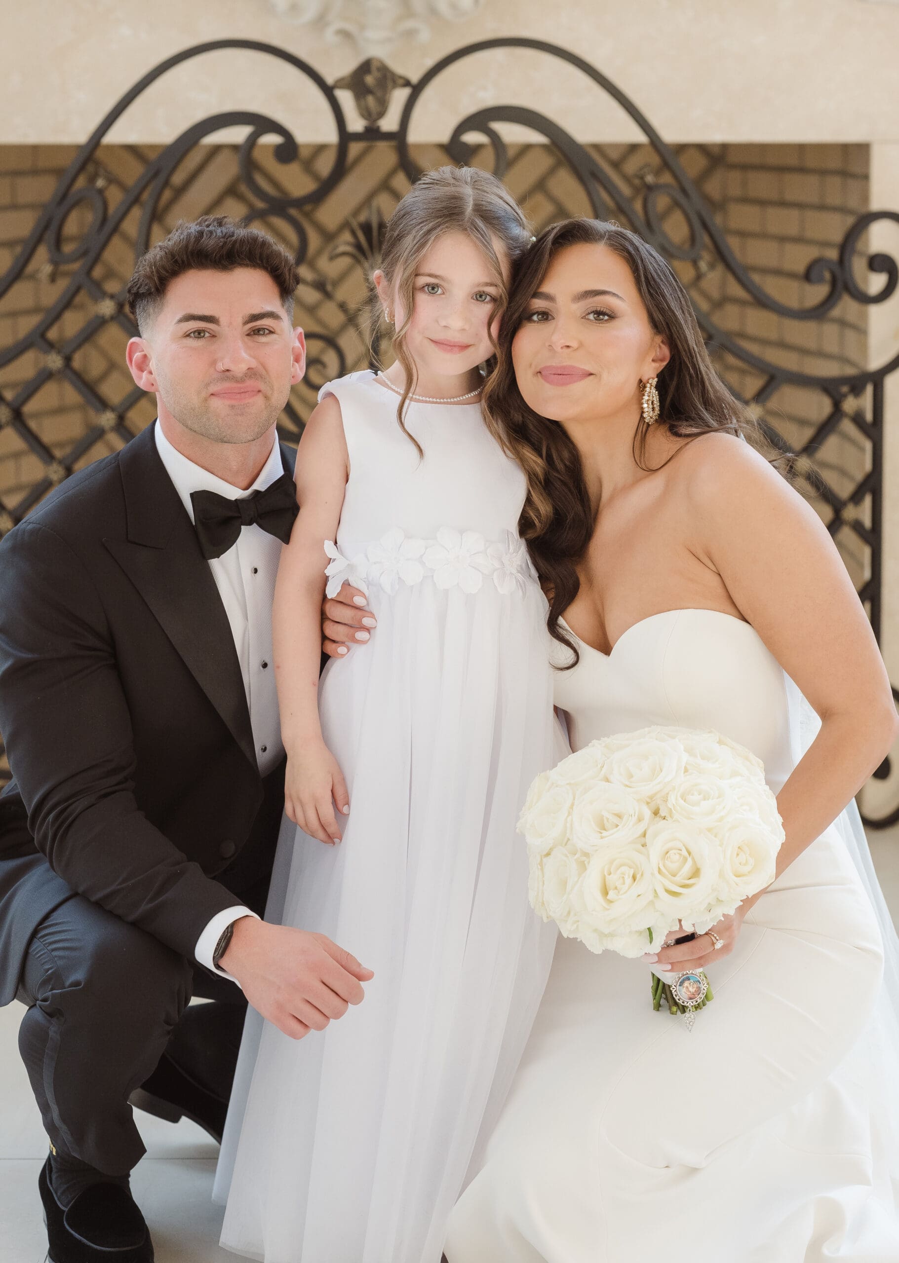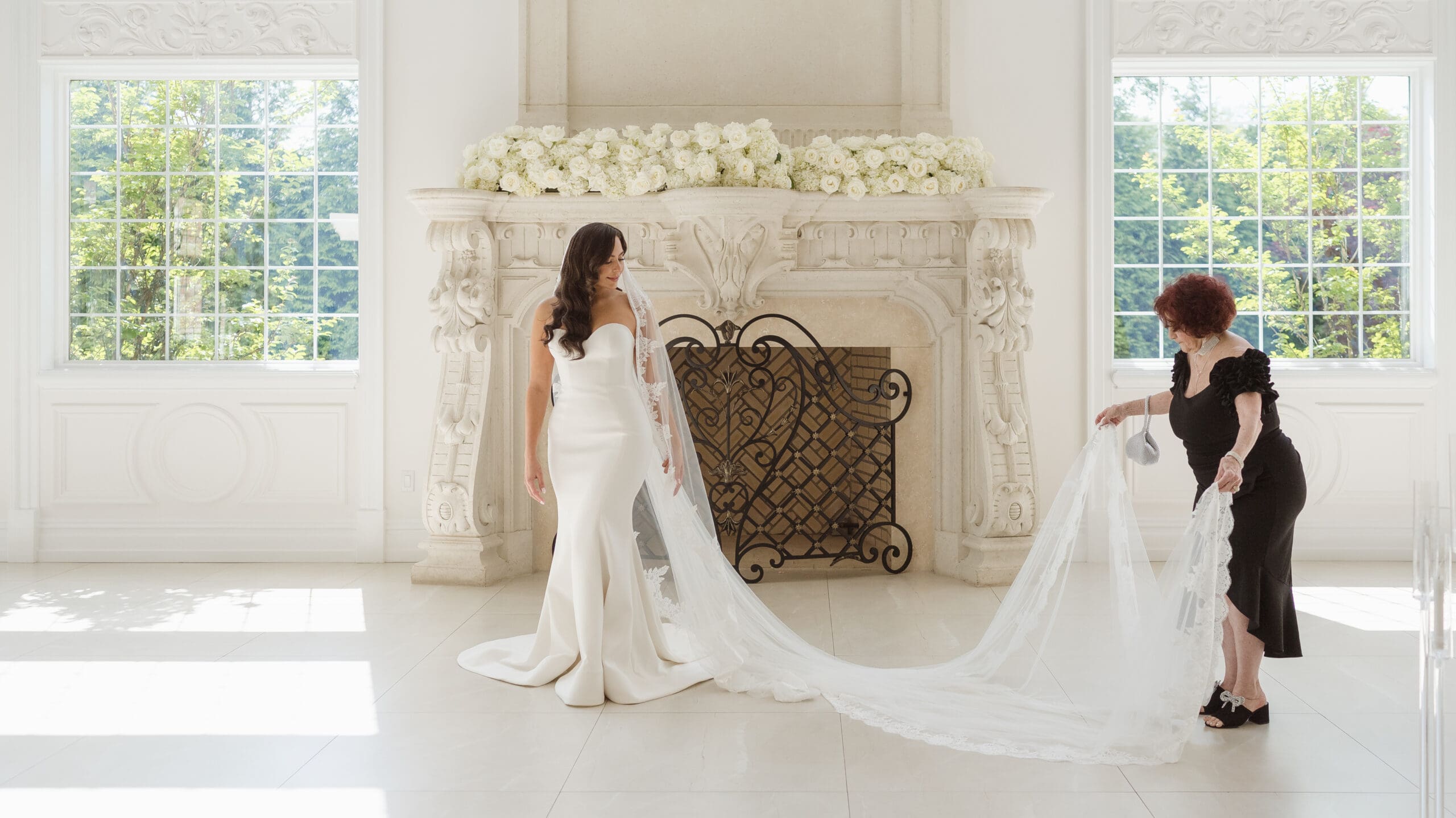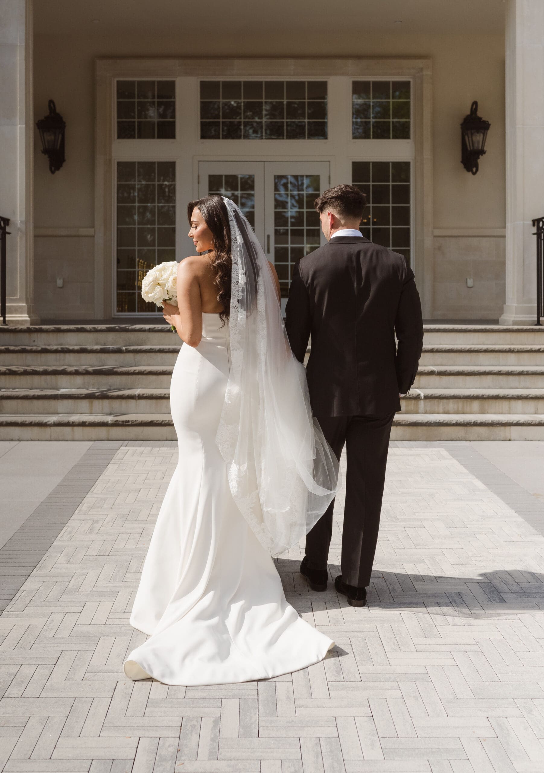 If rain should grace your wedding day, fear not—the ceremony room serves as an ideal location for beautiful portraits. When the weather is on your side, the manicured gardens and surrounding areas turn into breathtaking spots for photos. While some couples may opt for an outdoor ceremony, this couple chose the indoor option, knowing the outdoor space can still create magical photo opportunities with its gorgeous gazebo and columns. The venue itself is a captivating backdrop, ensuring that wedding photographs at the Estate at Florentine Gardens are nothing short of extraordinary.