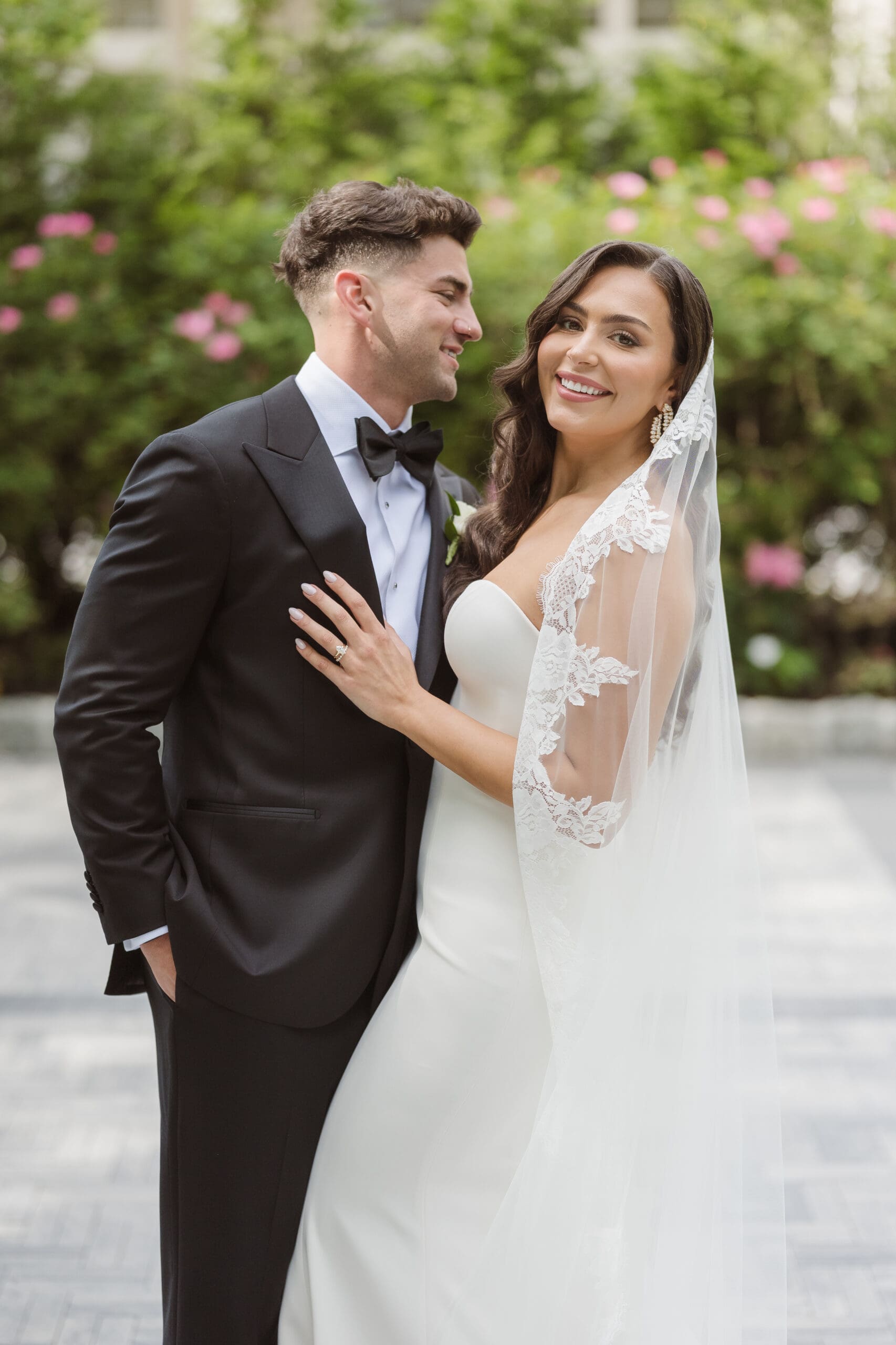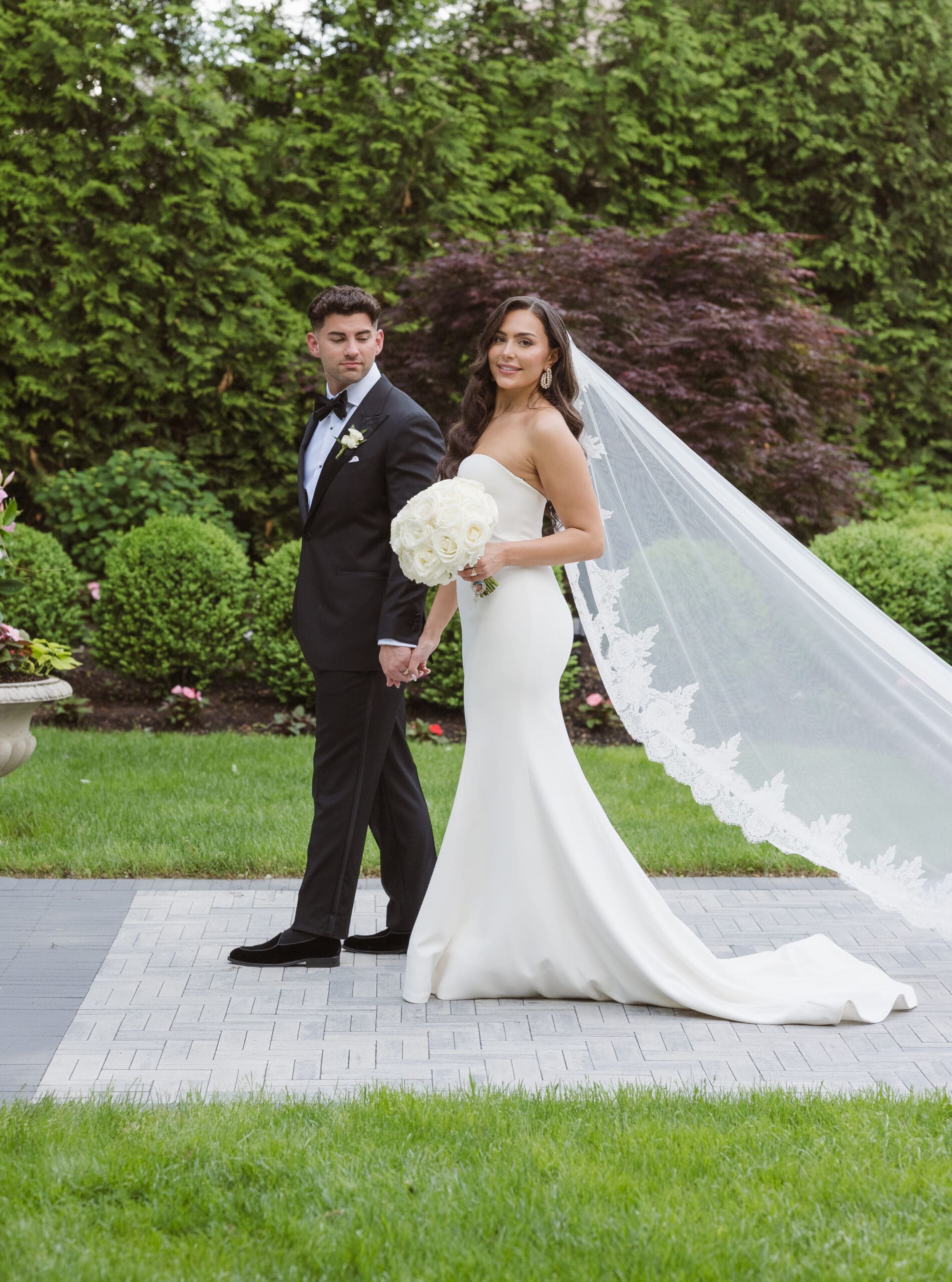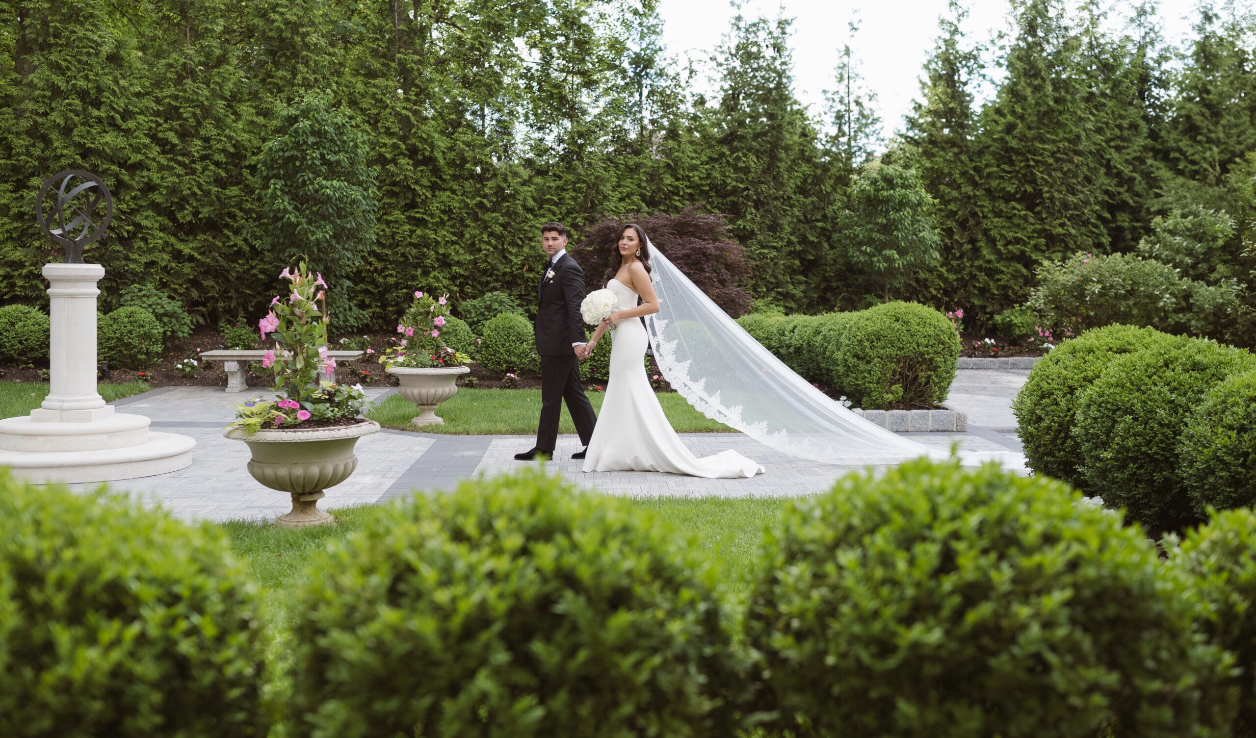 Once we received the okay to use the gardens, I set up the groom for his portraits first, followed by the bride. She expressed how much she loved the gardens and the venue as a backdrop, preferring to avoid the columns. Following her request, we focused on capturing the beauty of the gardens and not the columns or gazebo. I believe we successfully created some beautiful, romantic, and elegant wedding portraits of the couple.