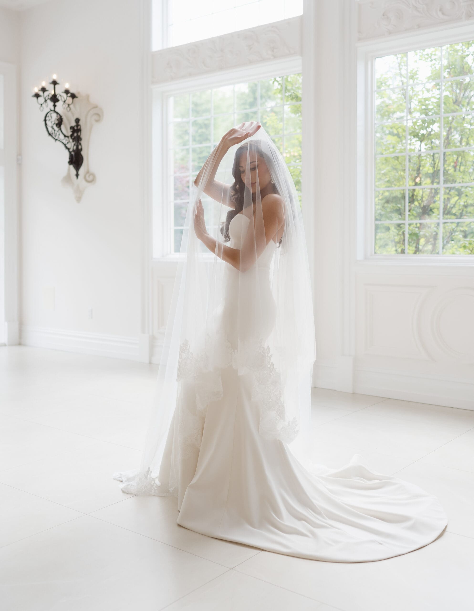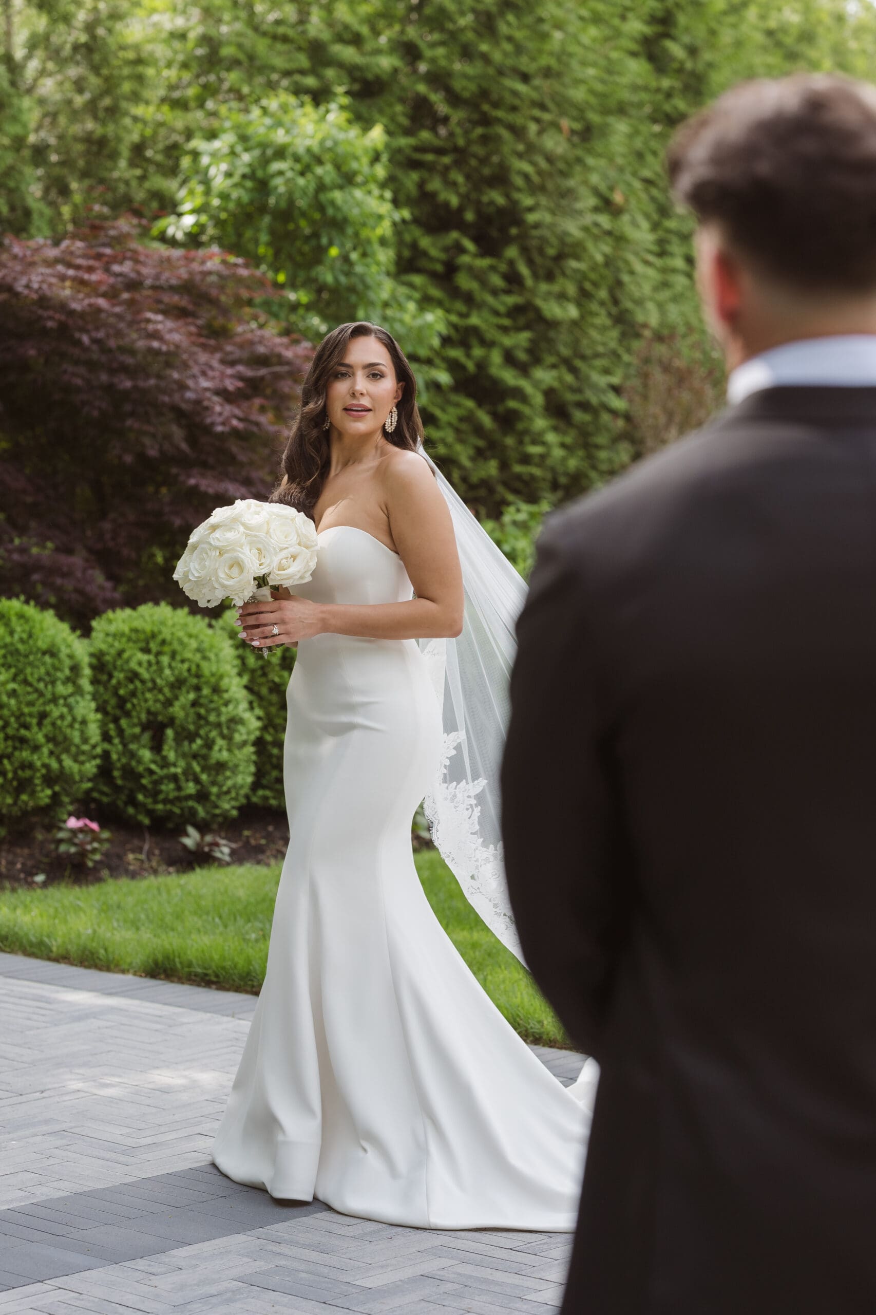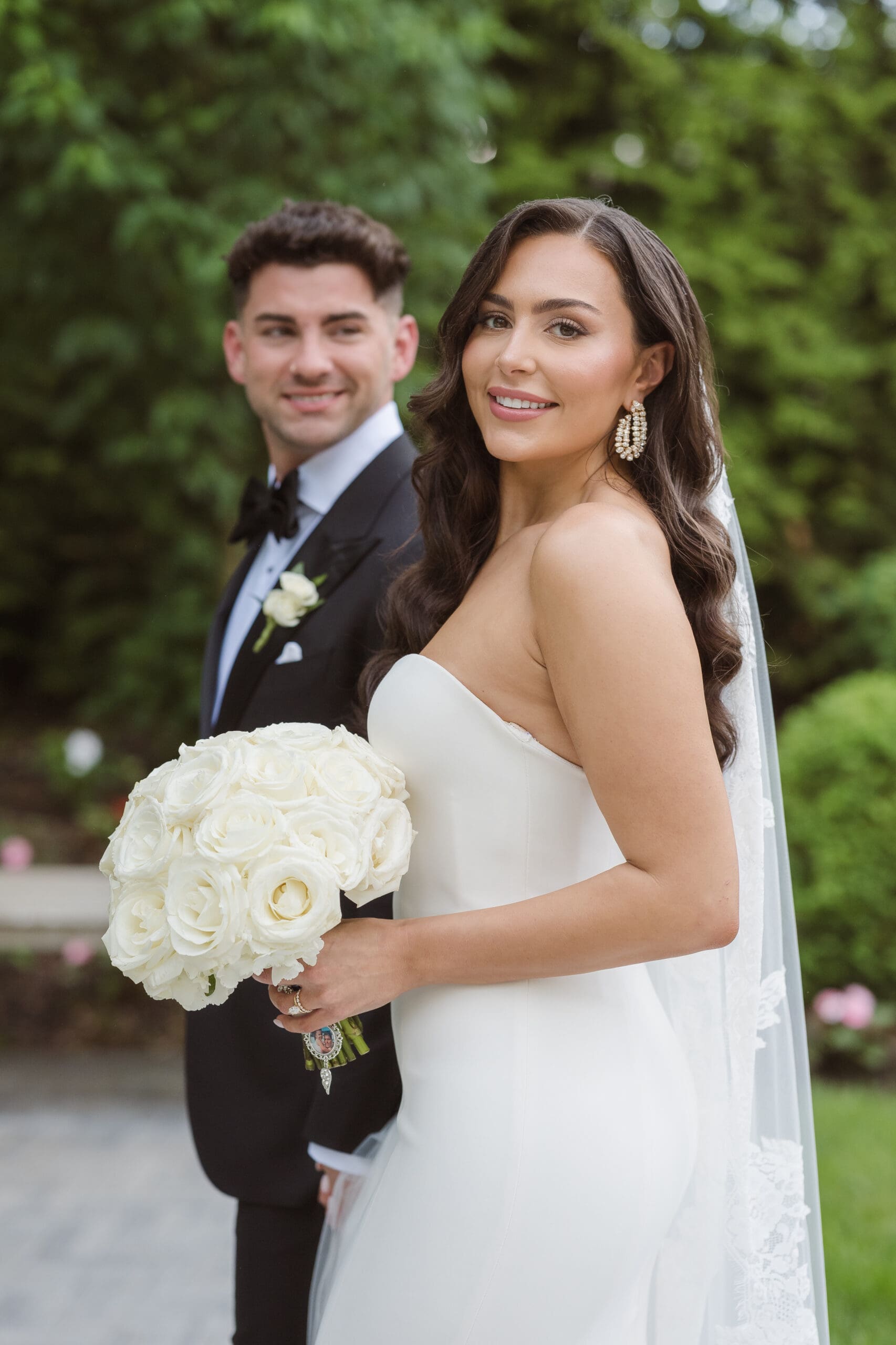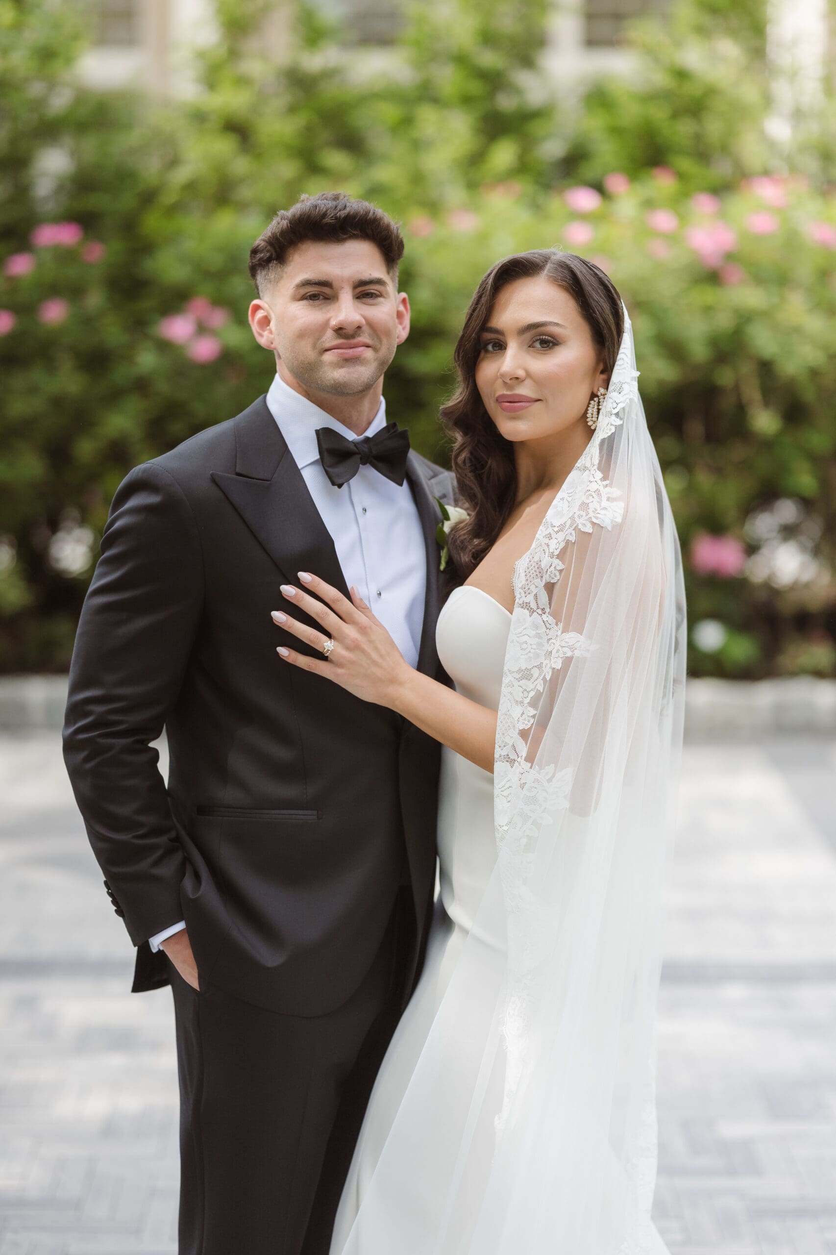 Once we received the okay to use the gardens, I set up the groom for his portraits first, followed by the bride. She expressed how much she loved the gardens and the venue as a backdrop, preferring to avoid the columns. Following her request, we focused on capturing the beauty of the gardens and not the columns or gazebo. I believe we successfully created some beautiful, romantic, and elegant wedding portraits of the couple.