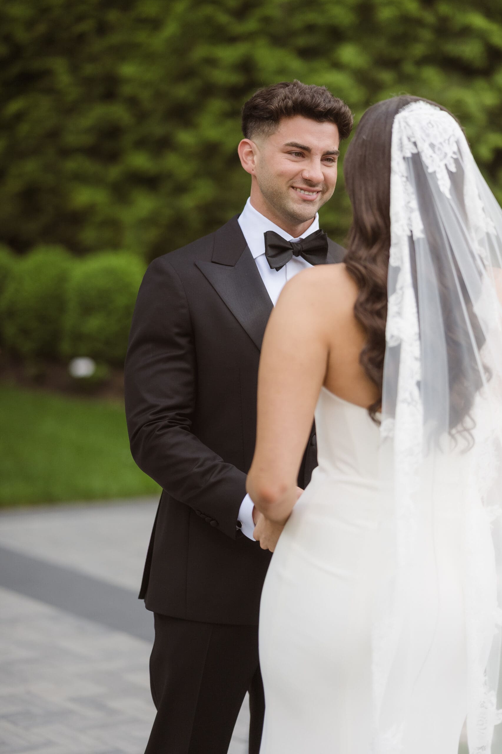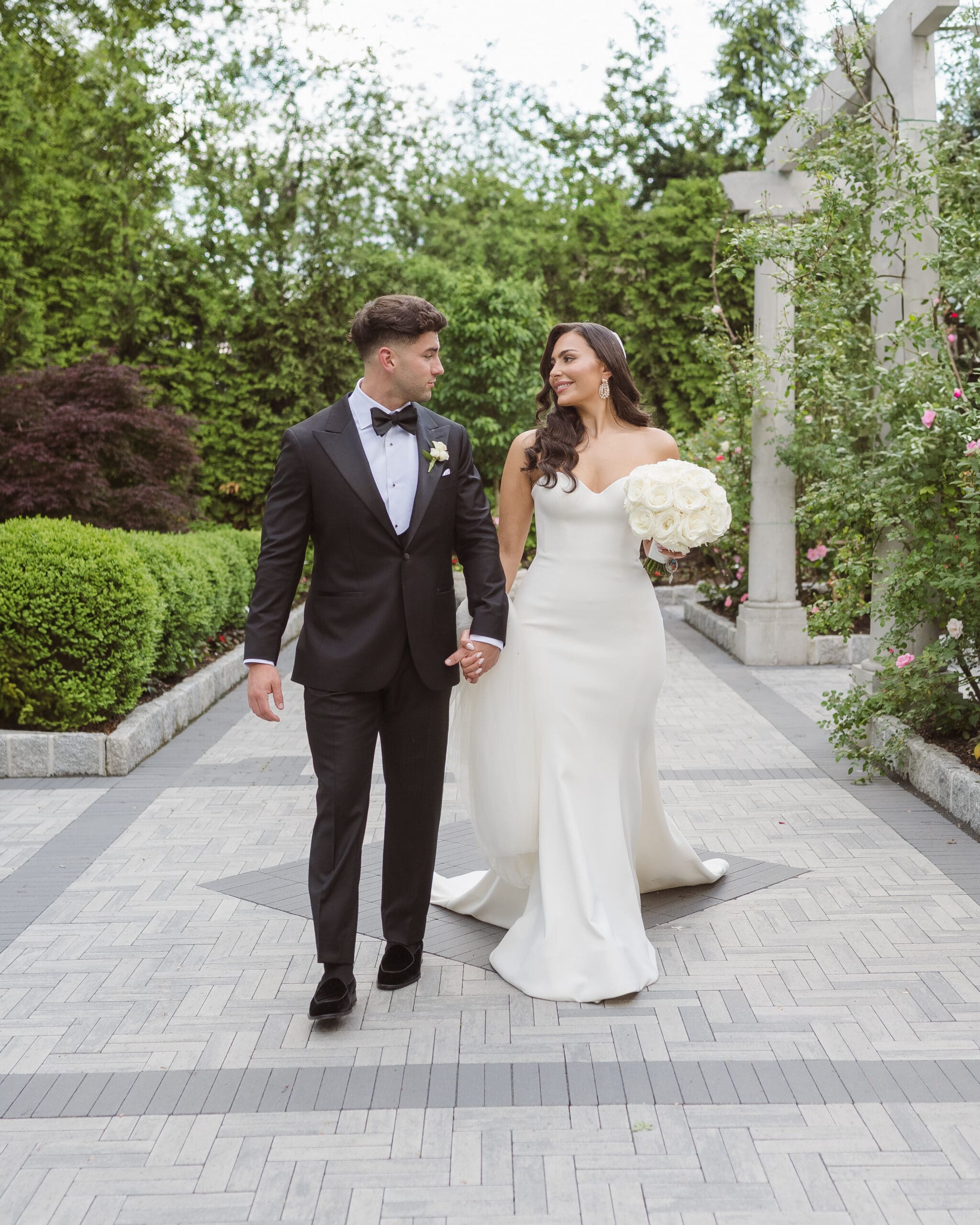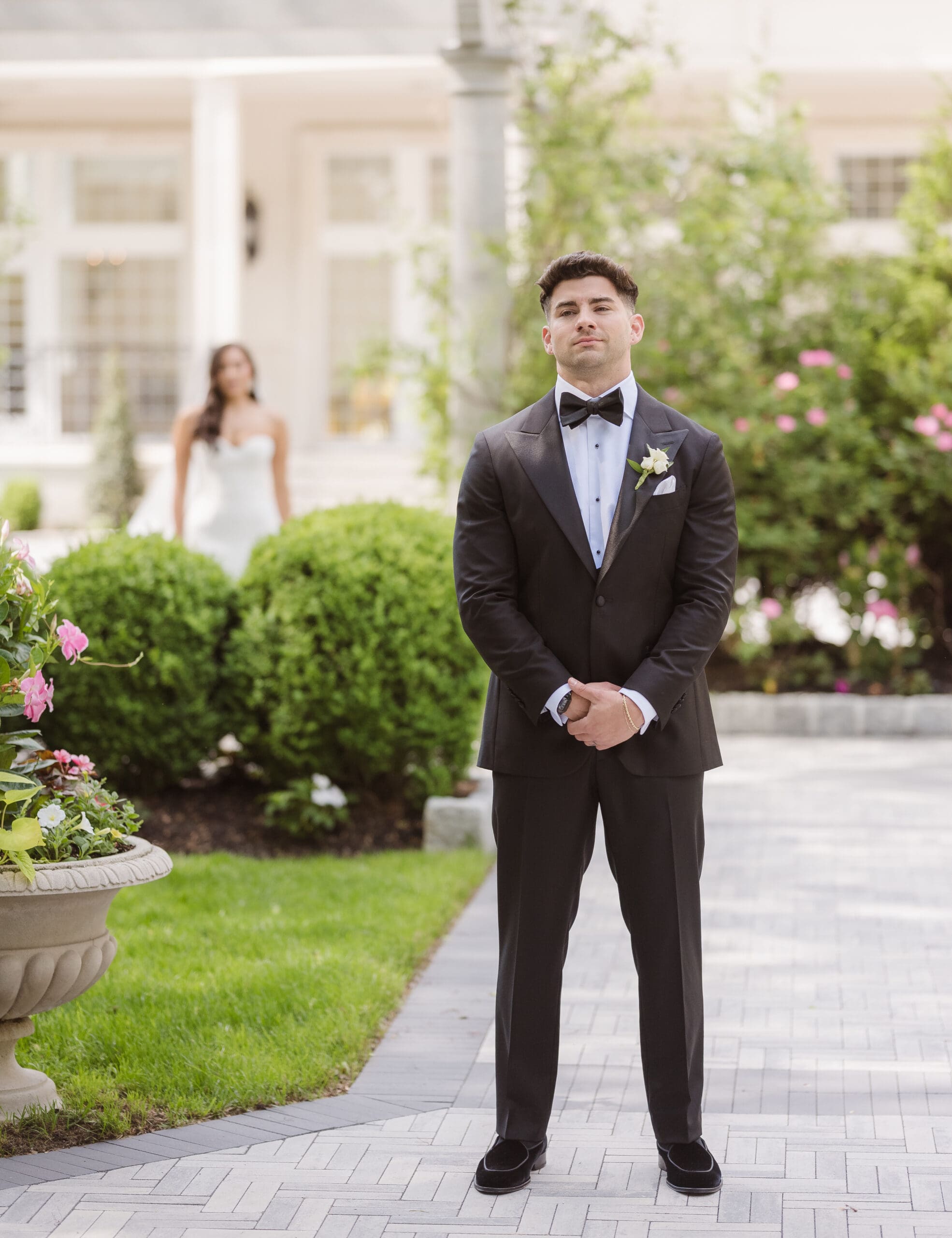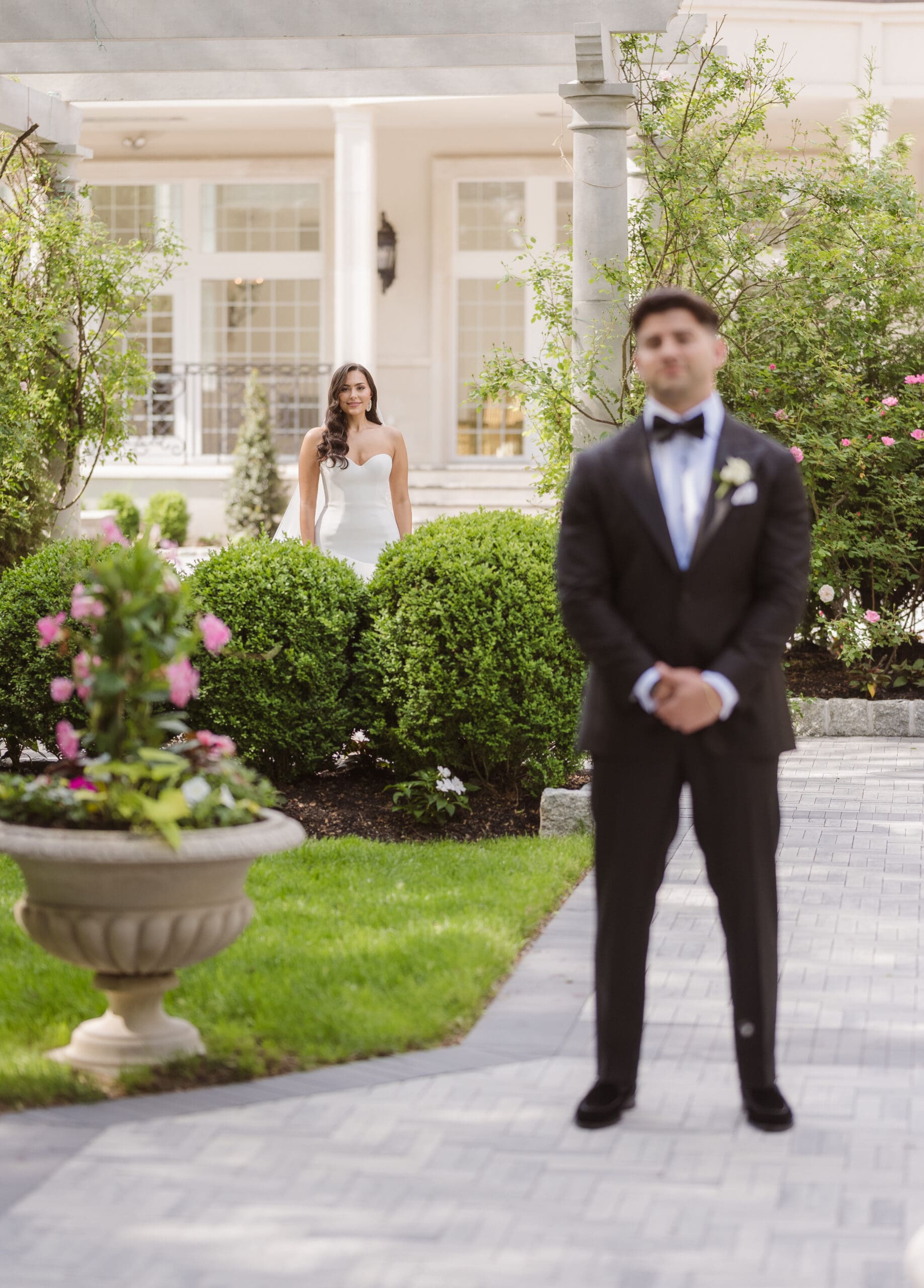 A collection of wedding portraits featuring the bride and groom (newlyweds) was captured after their first look in the gardens at the Estate at Florentine Gardens in NJ. Since there was another wedding earlier that day, we had to obtain permission to take photos outside in the gardens, starting with the first look followed by the newlywed photos, all before the ceremony.