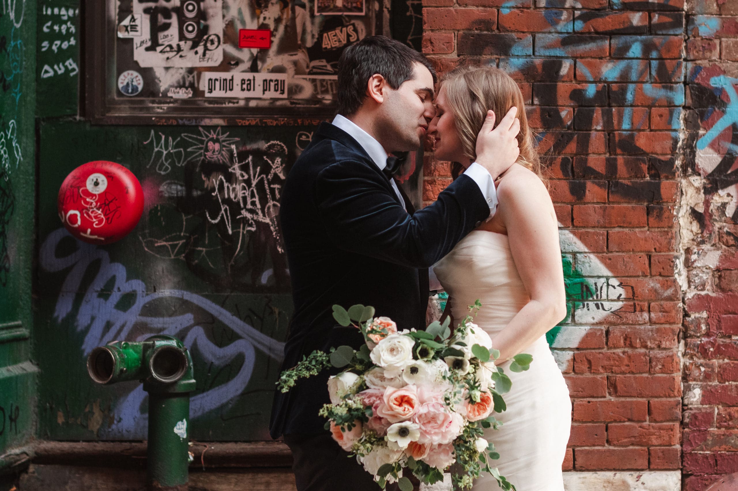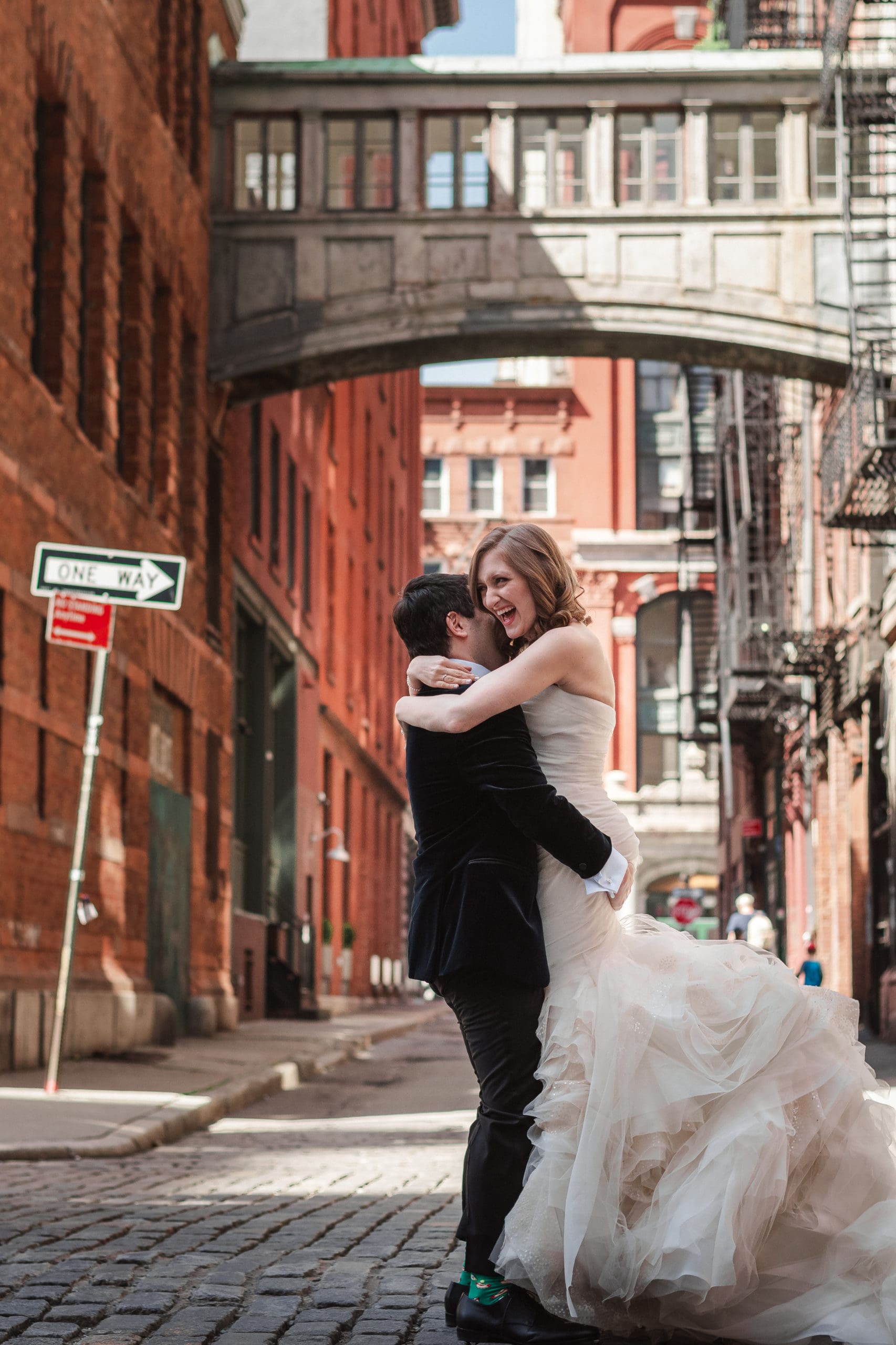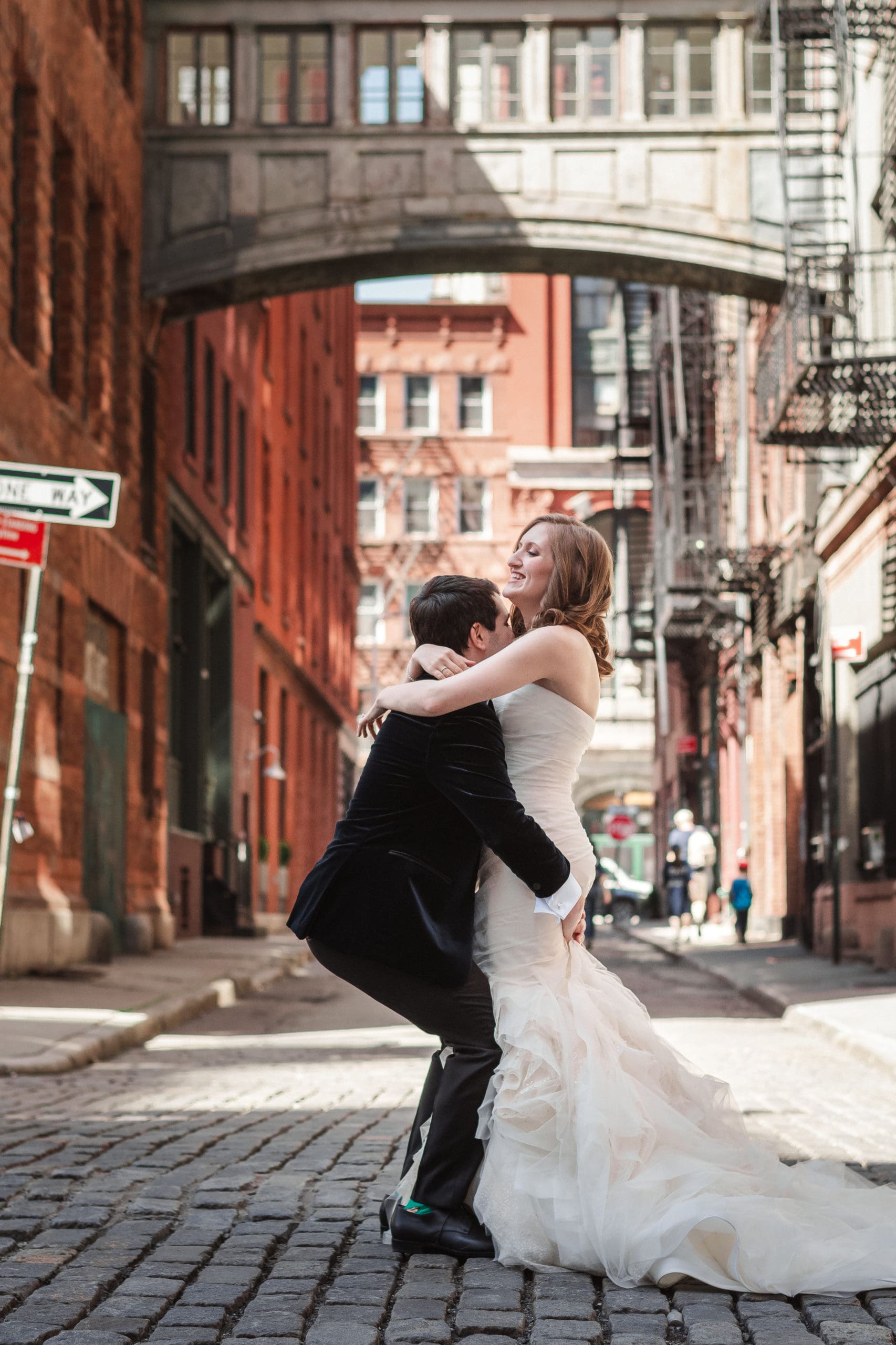 On a busy wedding weekend, a couple can expect traffic between The High Line Hotel to NYC iconic photo spots for the wedding day couples’ formal portraits. On this wedding day, we did the formal portraits of the bride and groom at the iconic Staple Street Bridge alleyway.