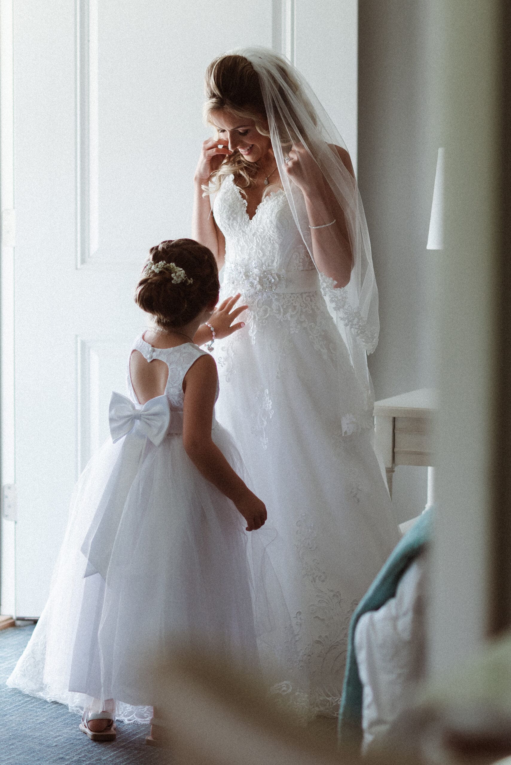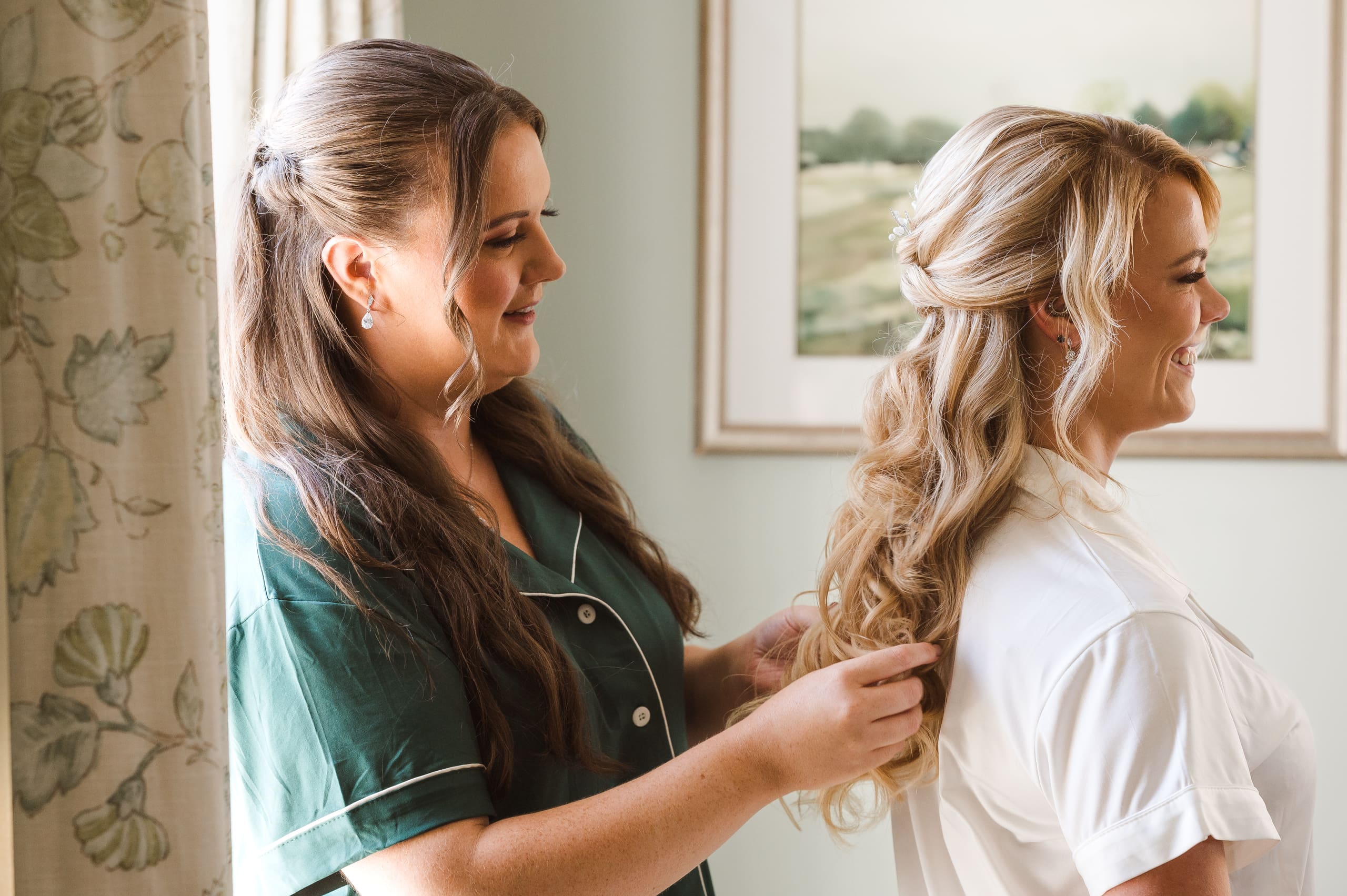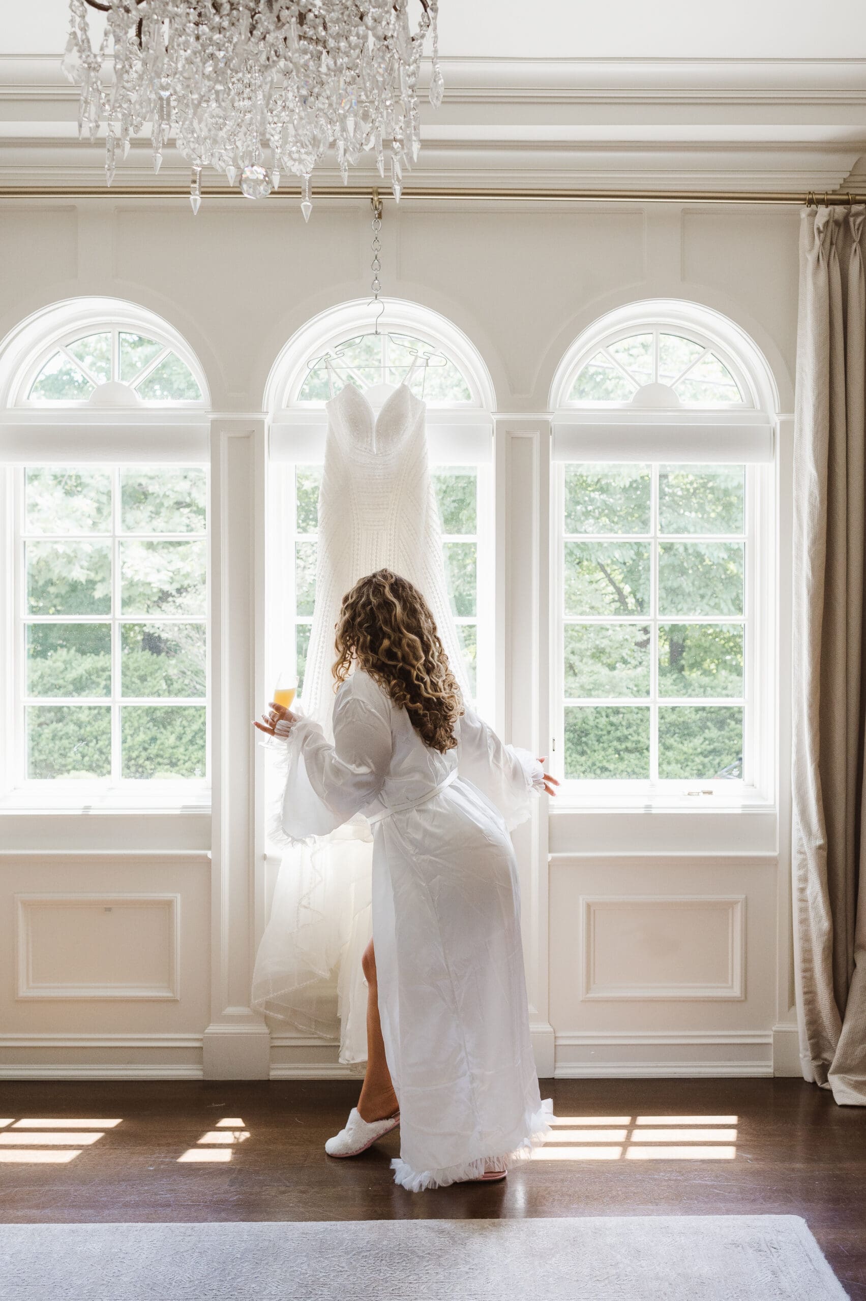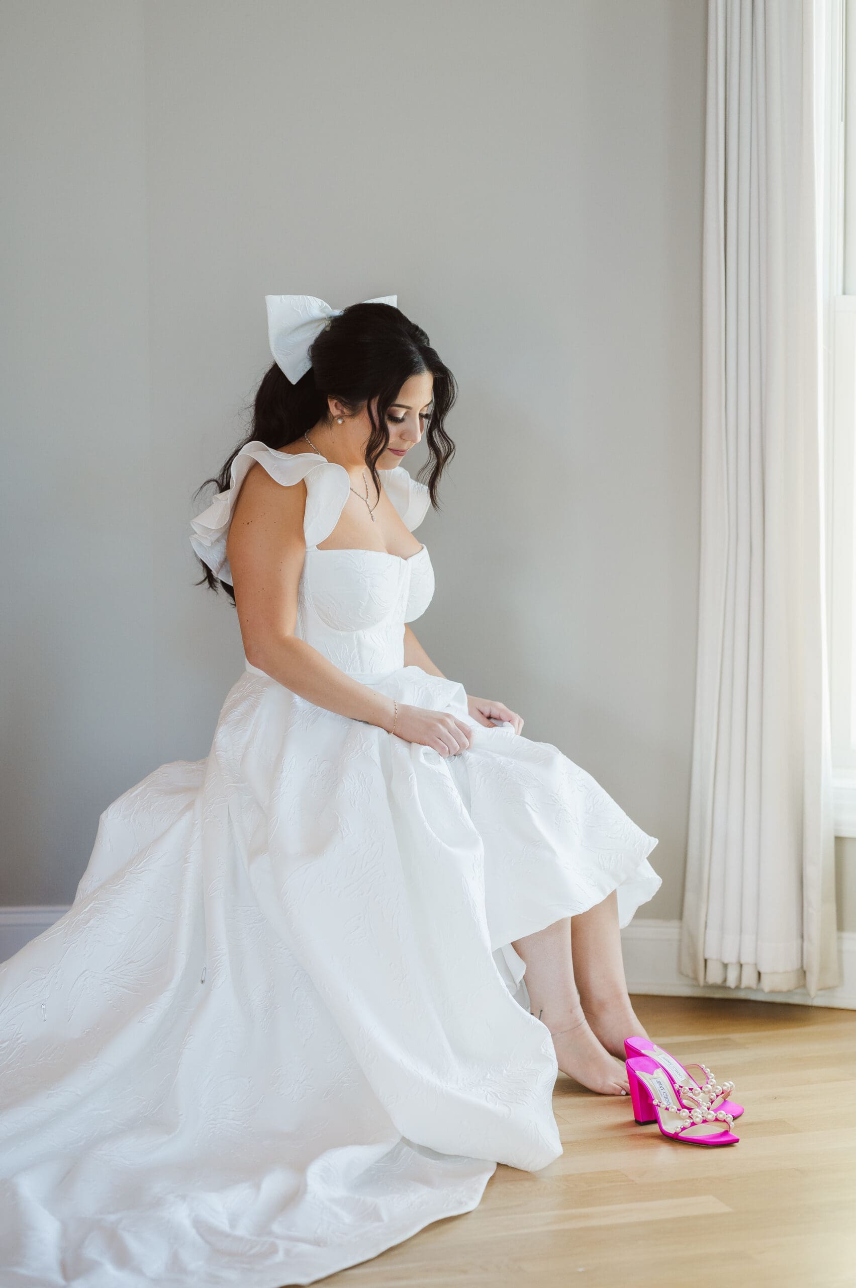 These getting ready or bridal prep photos are scheduled several hours before the ceremony and right after hair and makeup services are completed. Bridal prep photos typically include a shot list of moments such as:
