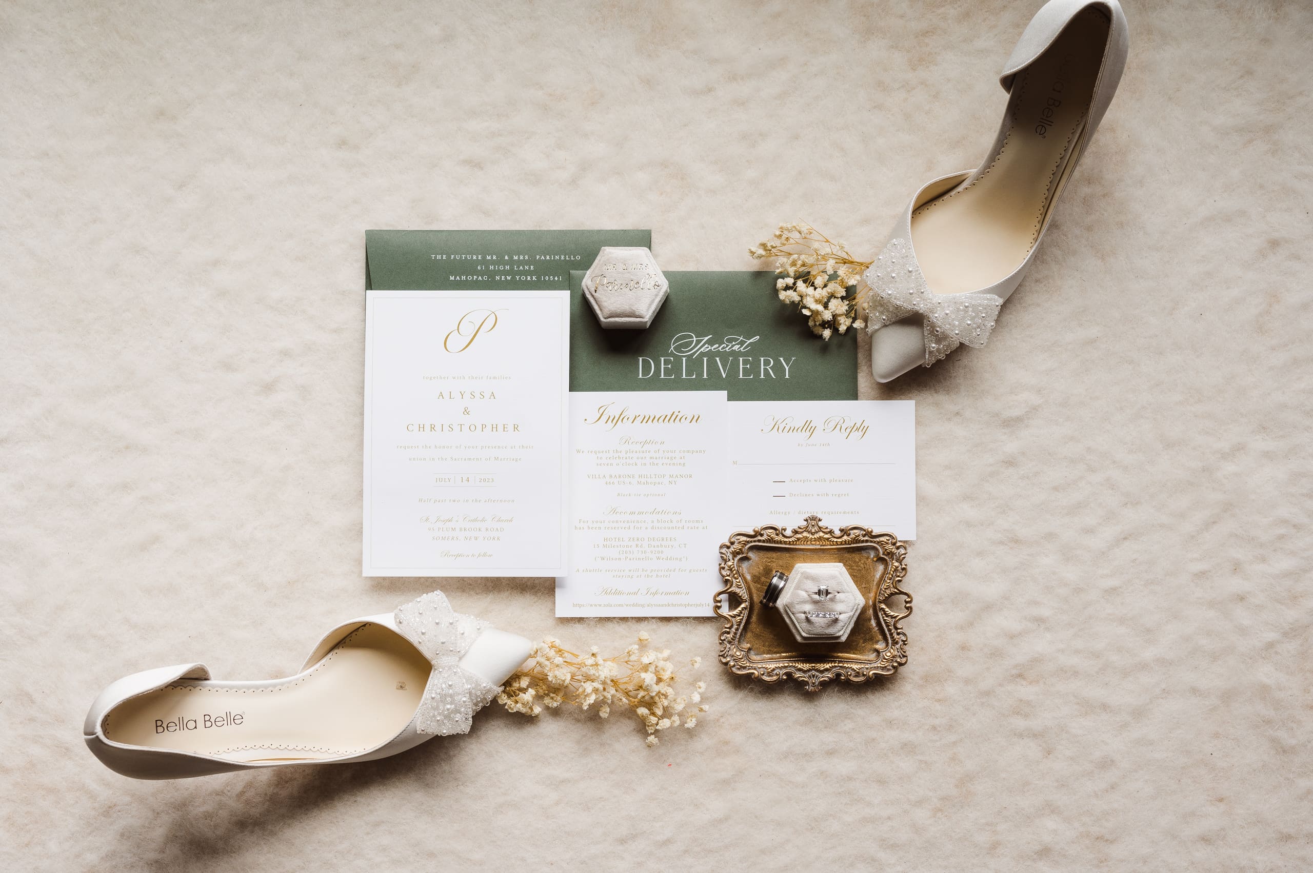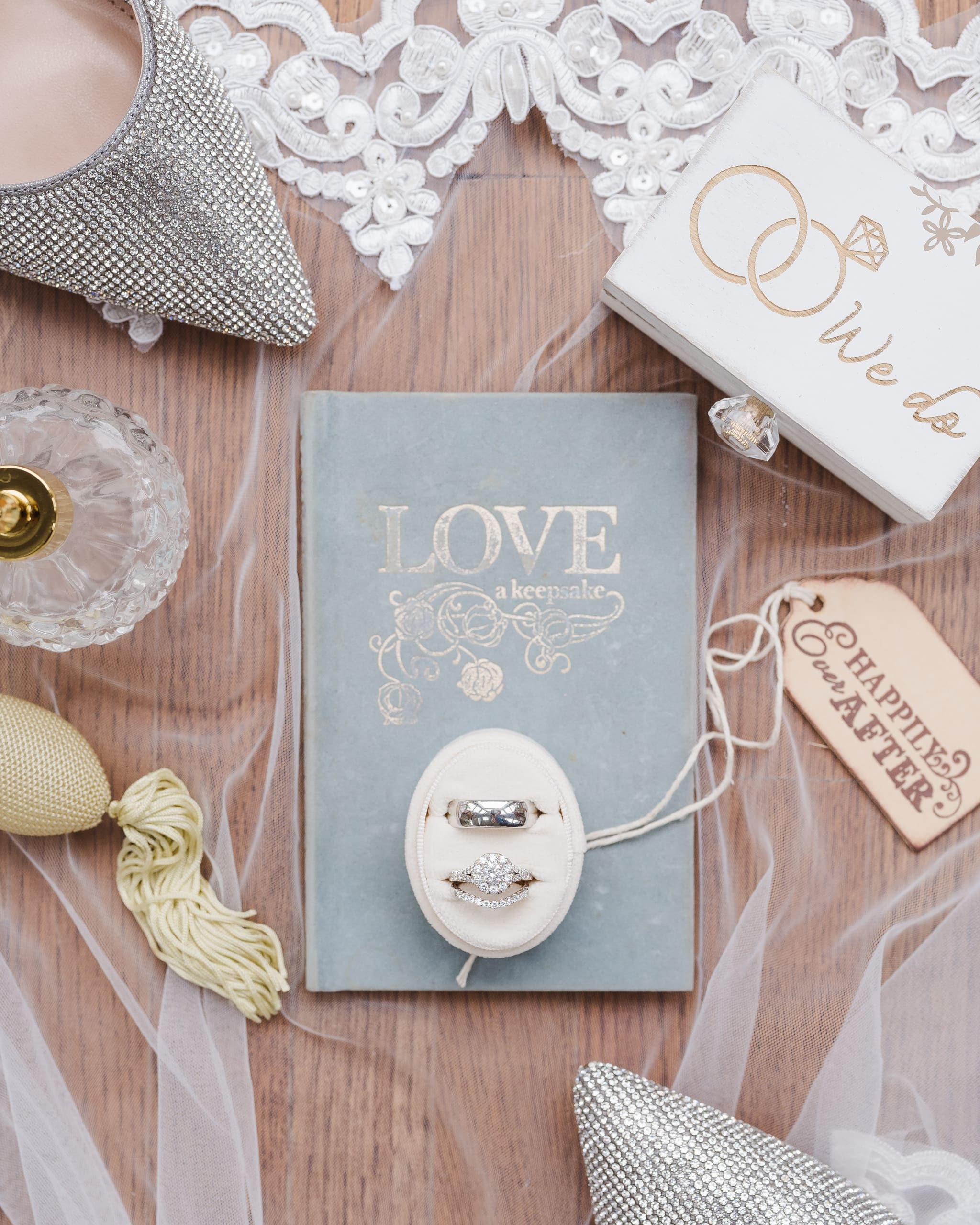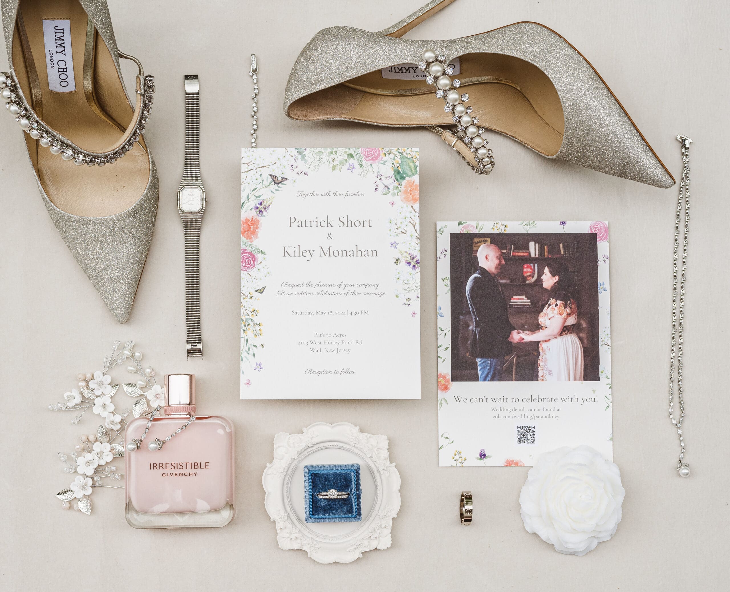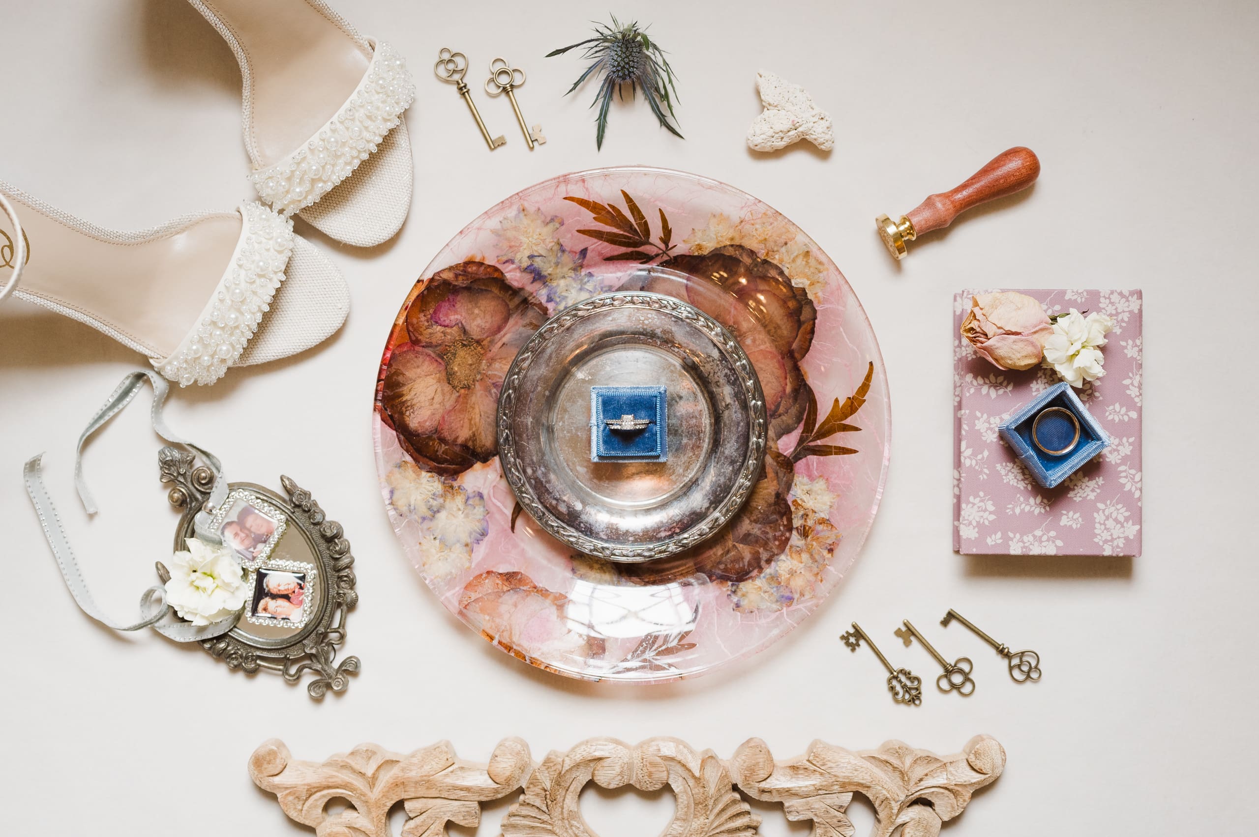 Photos of wedding flat lay details by Suess Moments photographer in New Jersey
