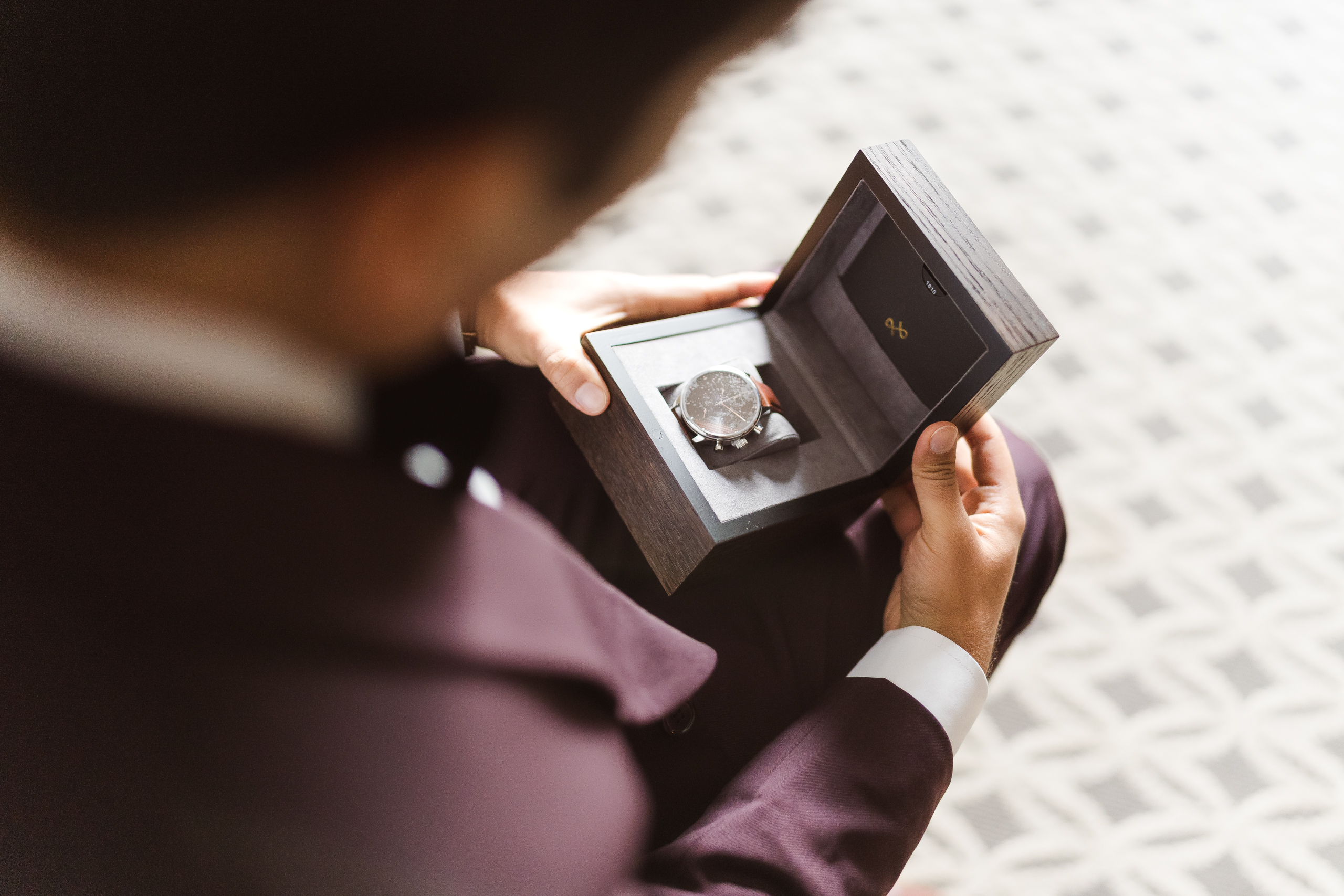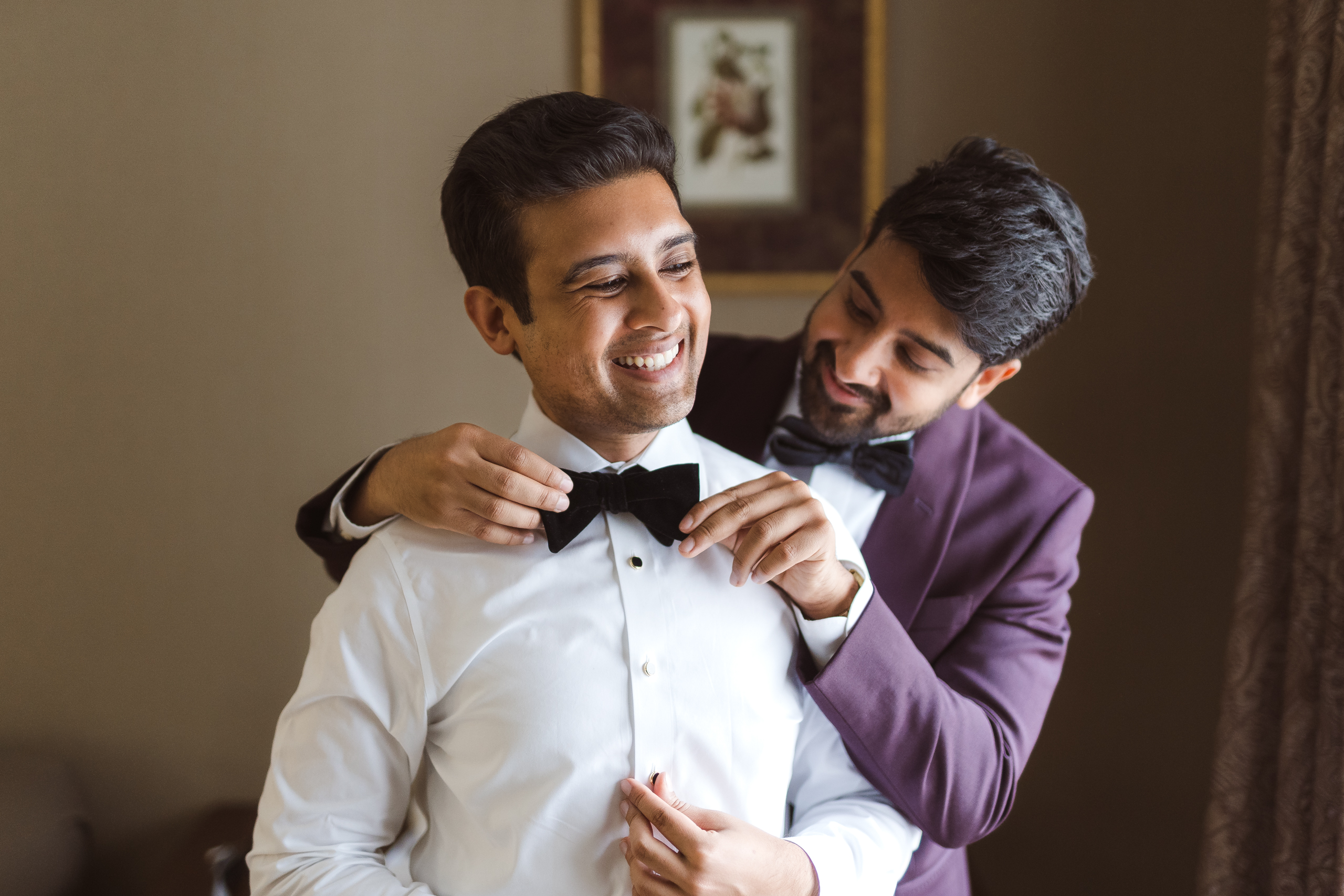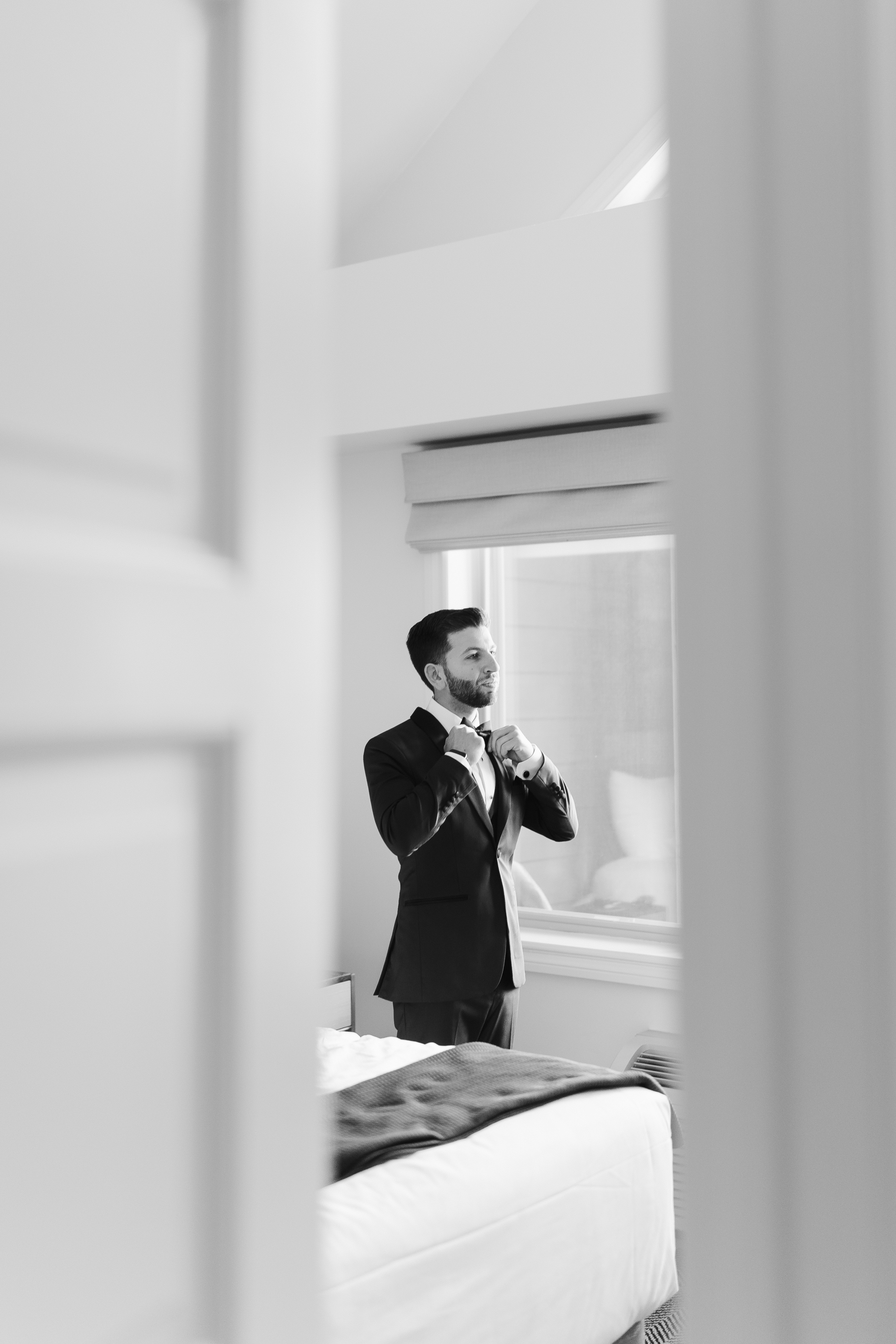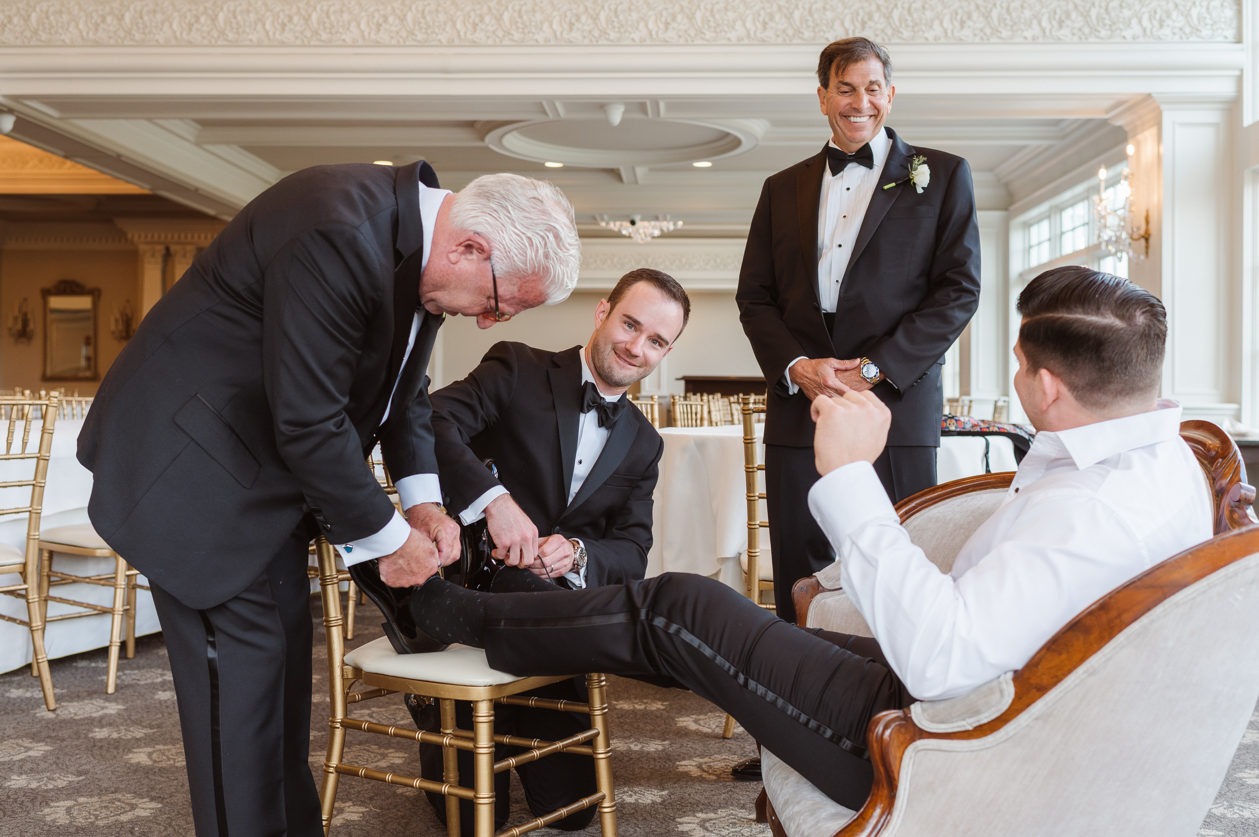 Getting ready photos of the groom are groom prep photos. These photos are typically scheduled several hours before the ceremony and take about 45 minutes or so. A second photographer normally shoots the groom prep photos as the main/lead photographer, Miranda, will photograph the bridal prep photos simultaneously.
