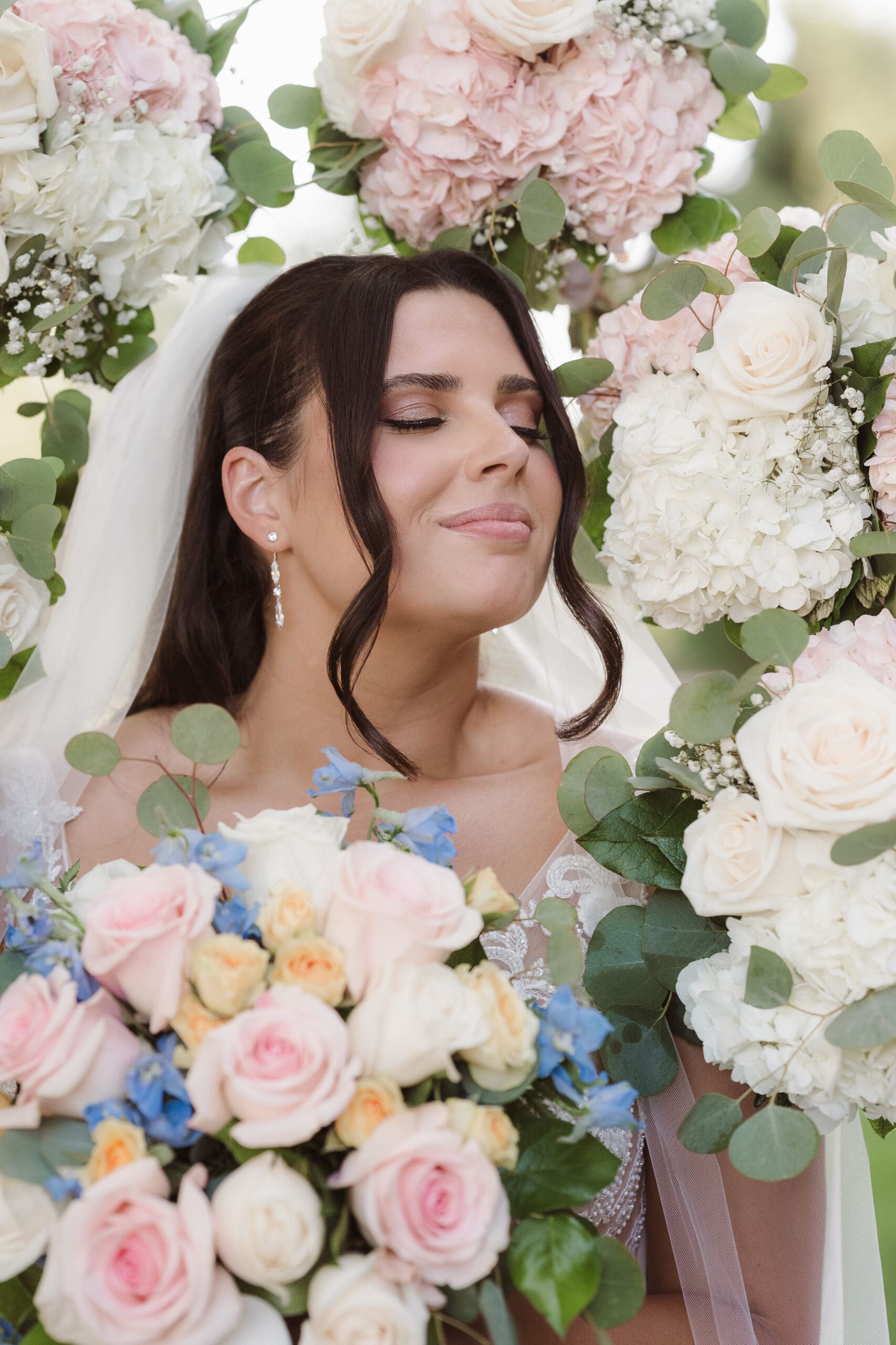 This whimsical portrait style is ideal for bridesmaids’ group photos, where all the ladies and gentlemen hold their bouquets, framing the bride’s face and making her feel like she’s surrounded by her favorite flowers and colors. Let’s be honest—these bouquets are often quite expensive and deserve a moment in the spotlight alongside the bride! I enjoy photographing bridal portraits with flower bouquets using my 50mm or 85mm lens.