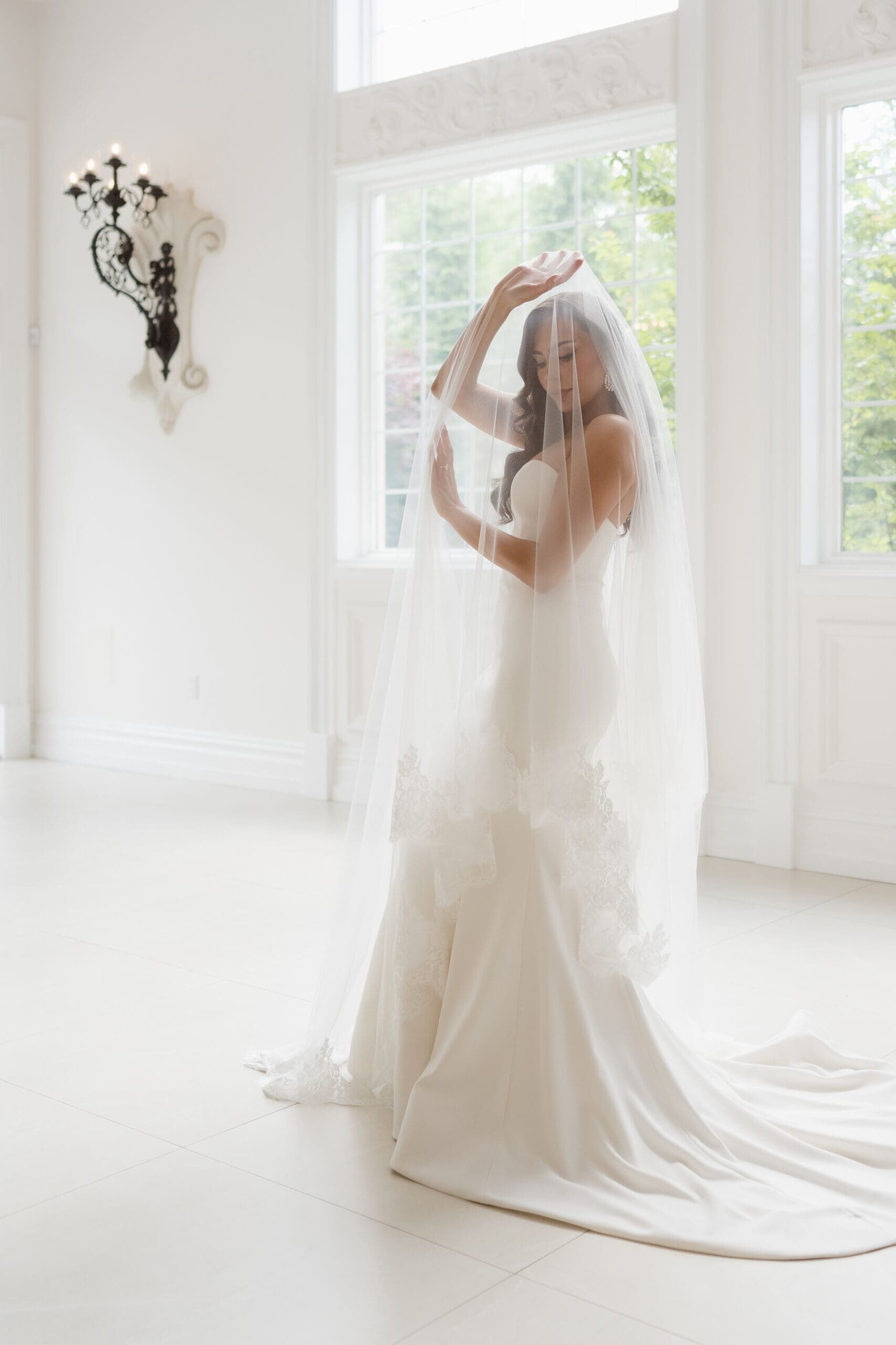 This pose requires assistance from two people to hold each curtain and bring them towards the camera, creating a flapping effect as if the wind is gusting through the windows. I have to stand at a low angle for a dramatic look and use an extra-wide lens. I prefer the light coming through the windows to be overexposed to create a heavenly, angelic vibe, as if the bride is being touched by an angel. There are many ways to pose the bride for this shot; I particularly like capturing her profile or having her play with her dress and veil during this moment.