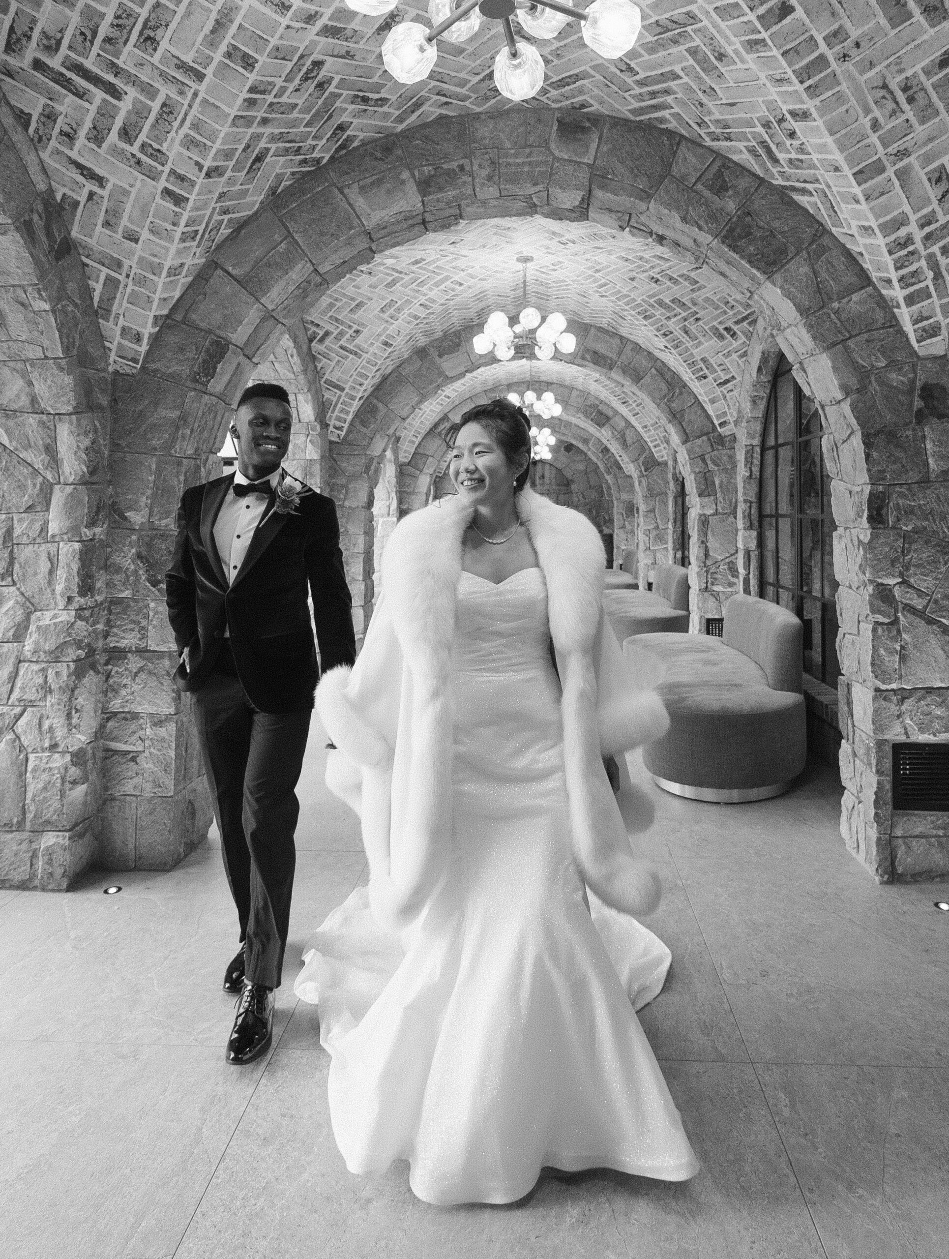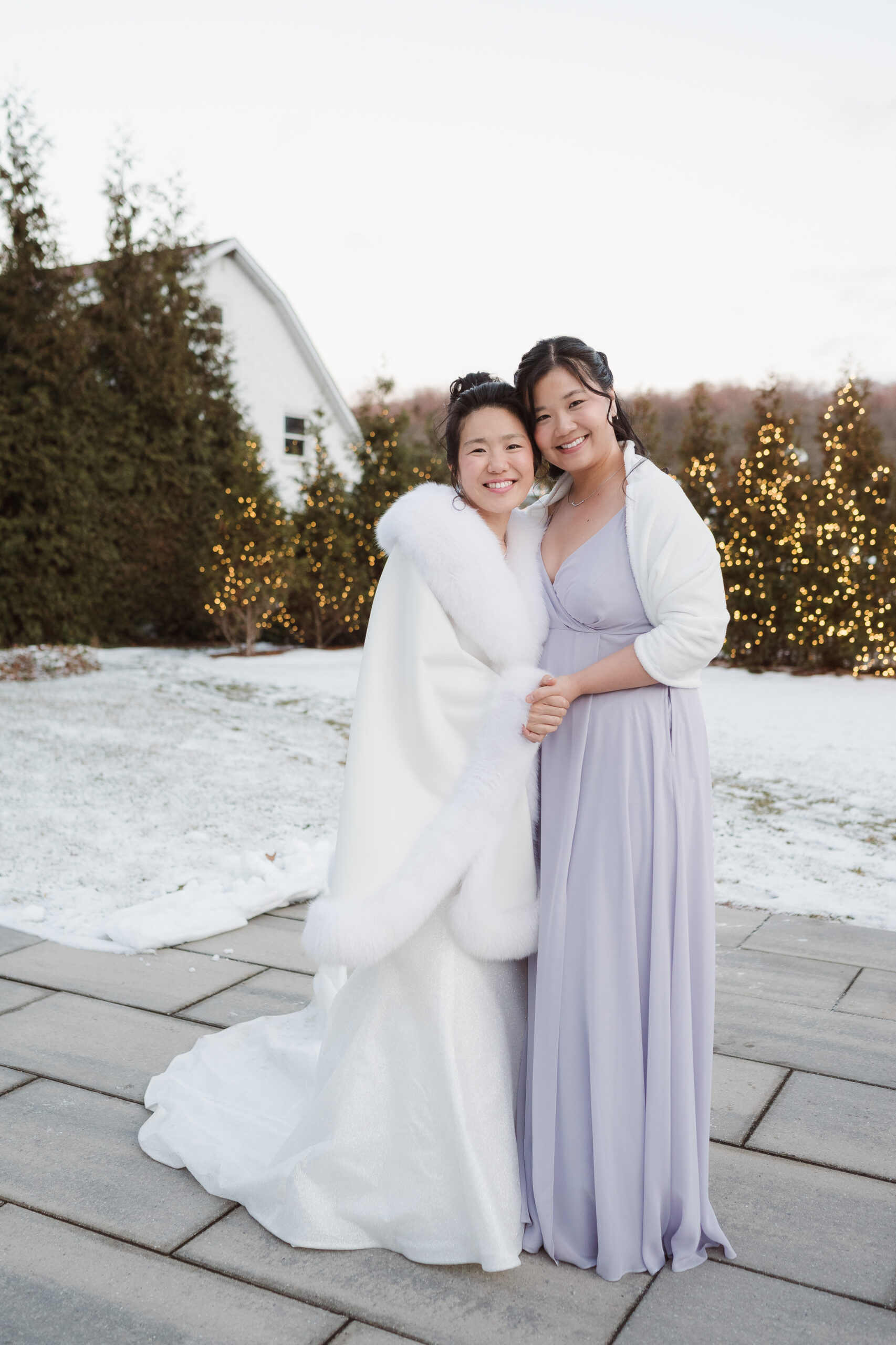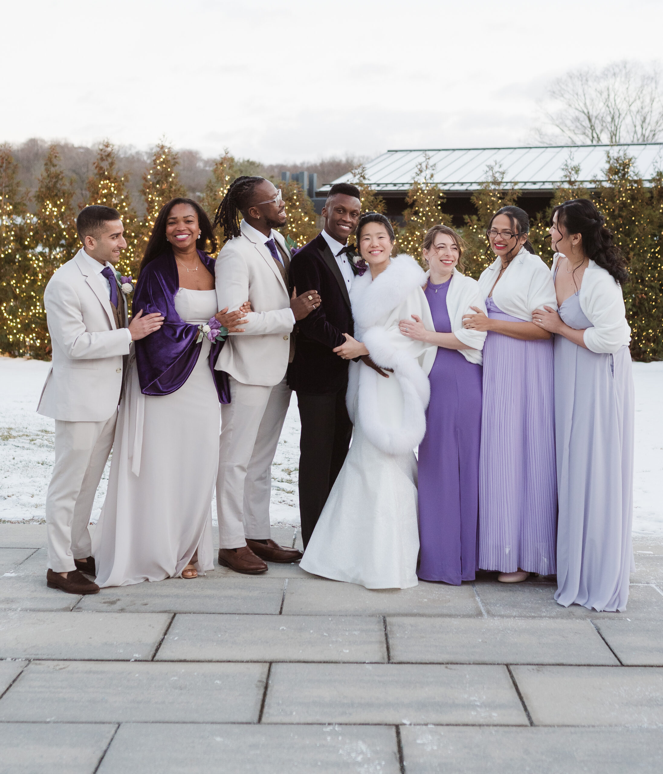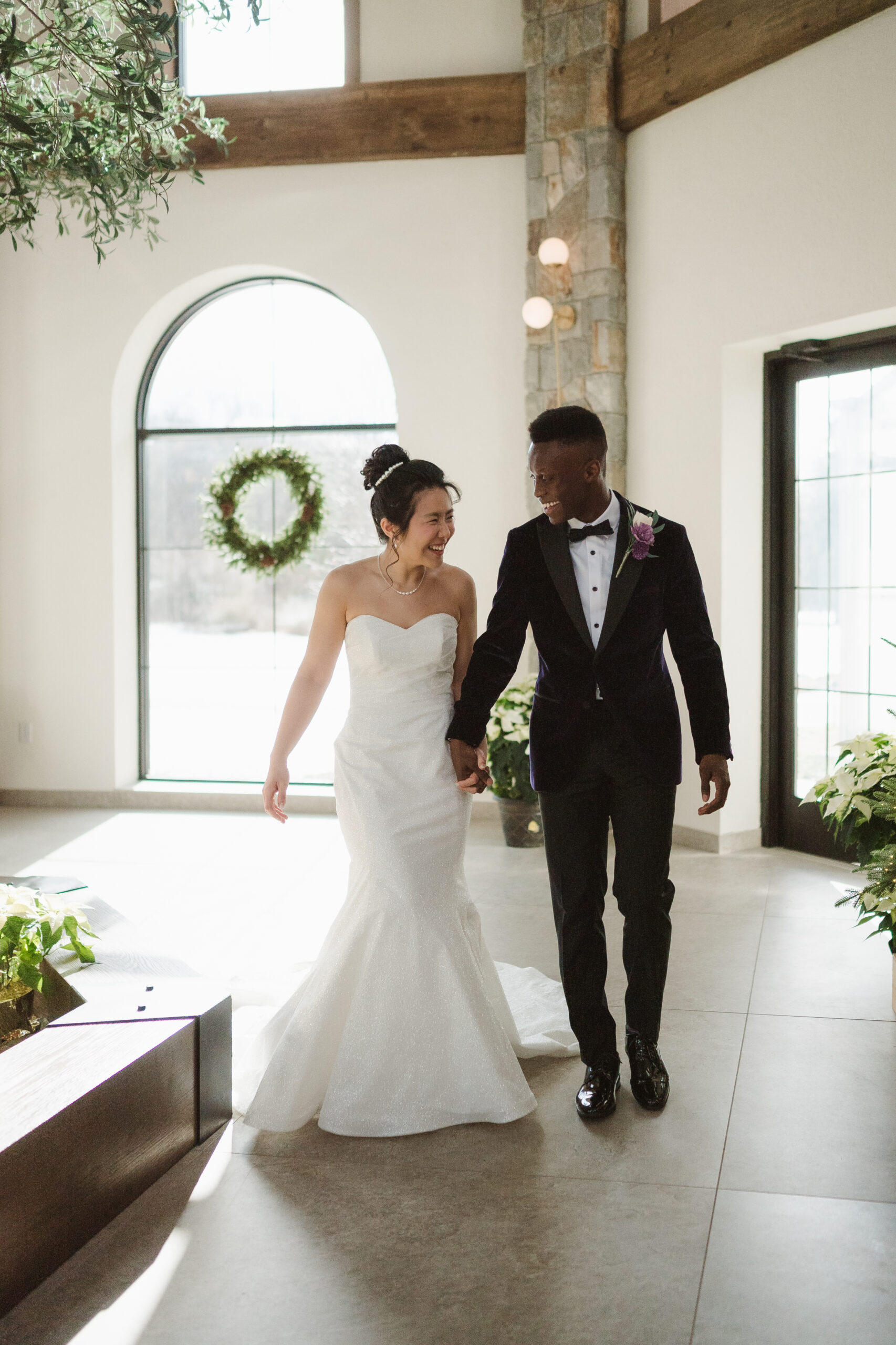 We started the photos at first look in the Reserve and portraits in the wine cellar and entrance lobby with the tree. It was December, so there were holiday decor giving the venue a winter wonderland aesthetic. After these photos at the Reserve, we went outside to the snow at the tree lined path and field. Then we met at the Reserve for portraits with the wedding party at the cocktail bar and outside area. The ceremony was indoors at night time and Perona Farms allowed the couple to bring their dog to witness the marriage. What made this wedding so unique was that they asked their maid of honor and best man to do speeches at the ceremony instead of at the Reception.