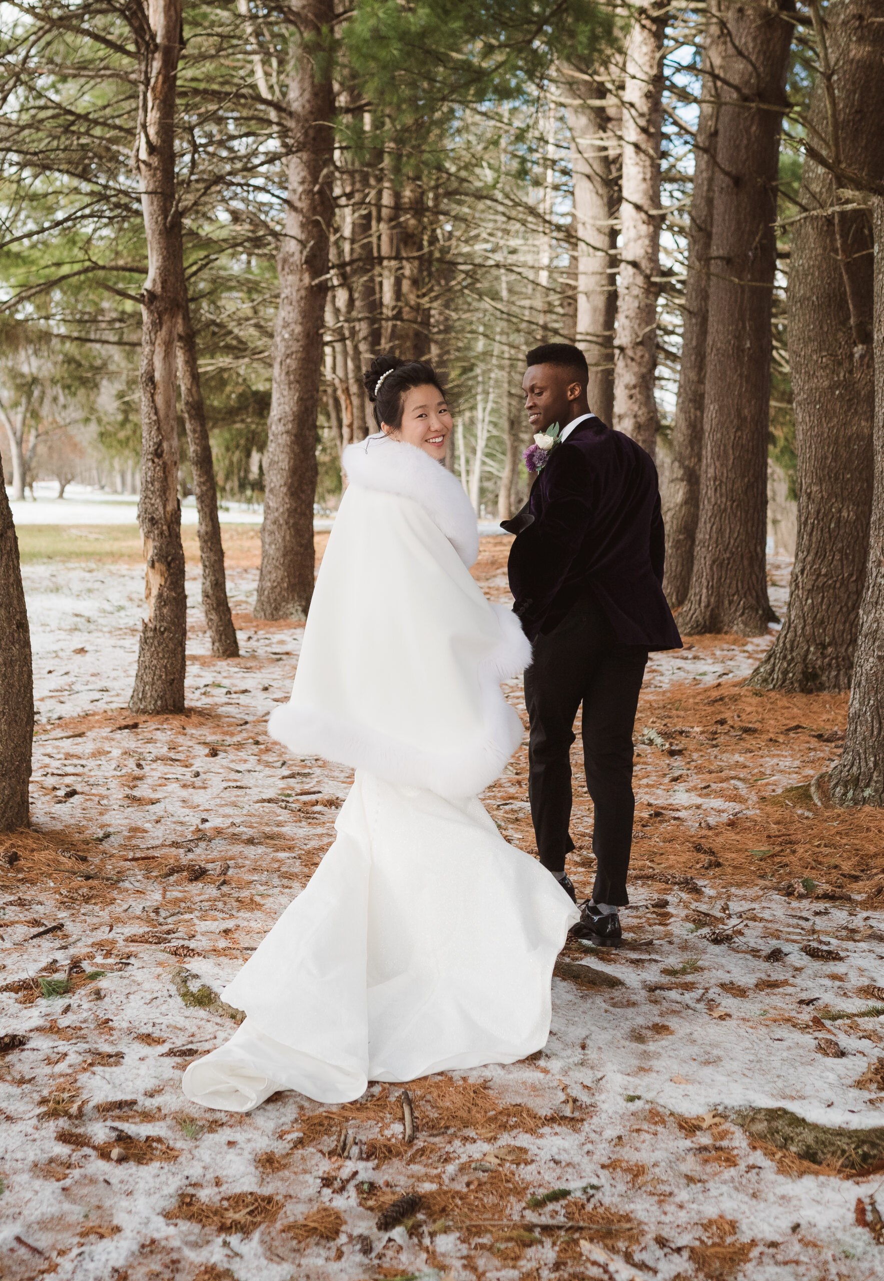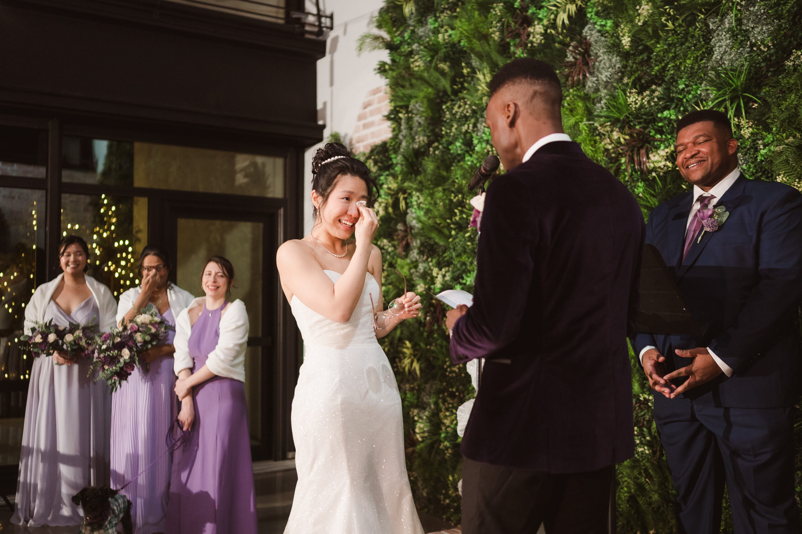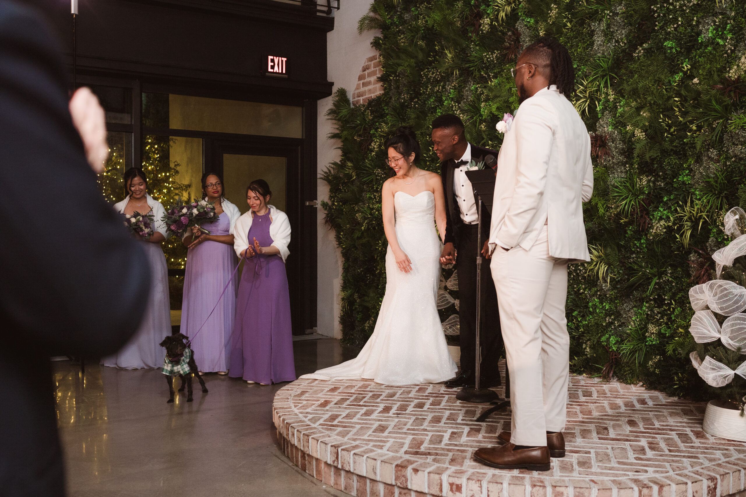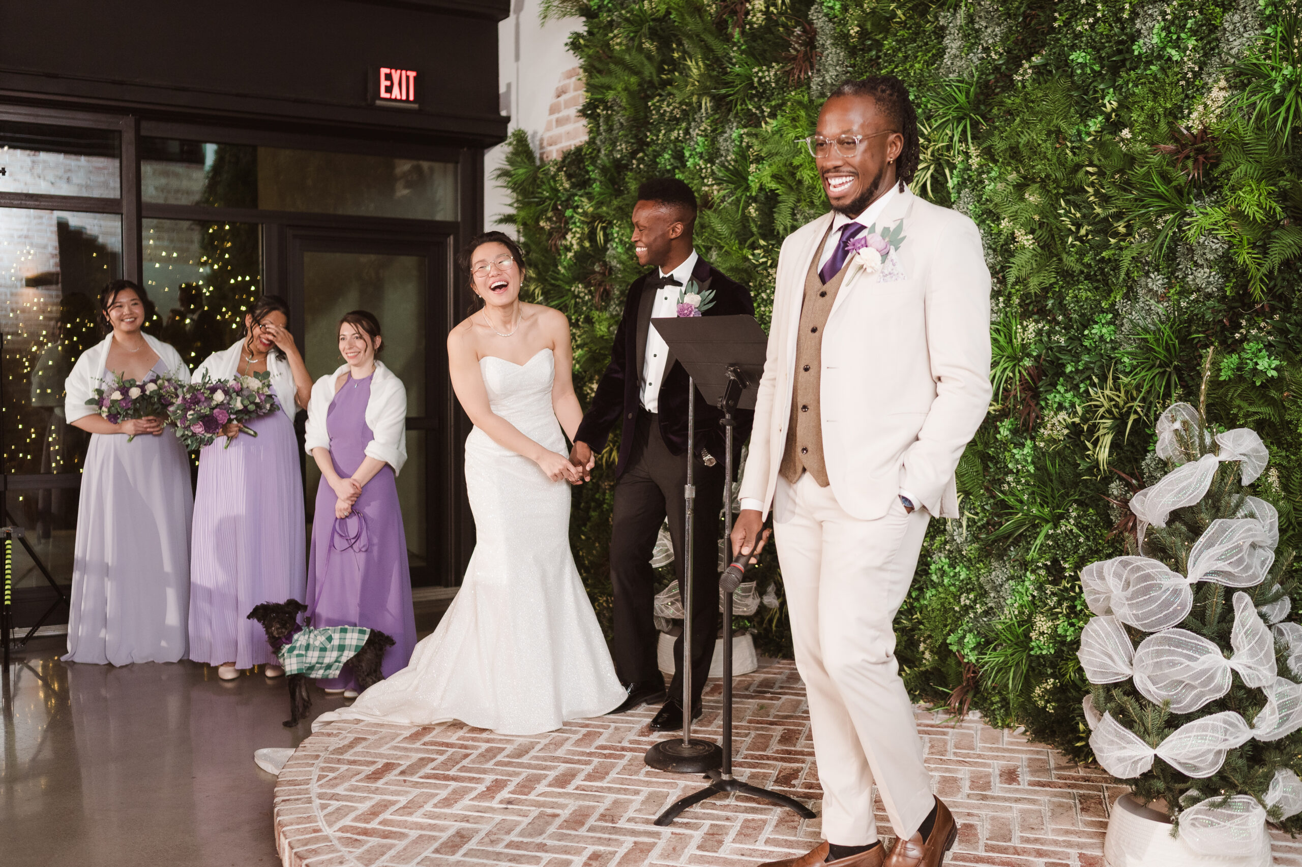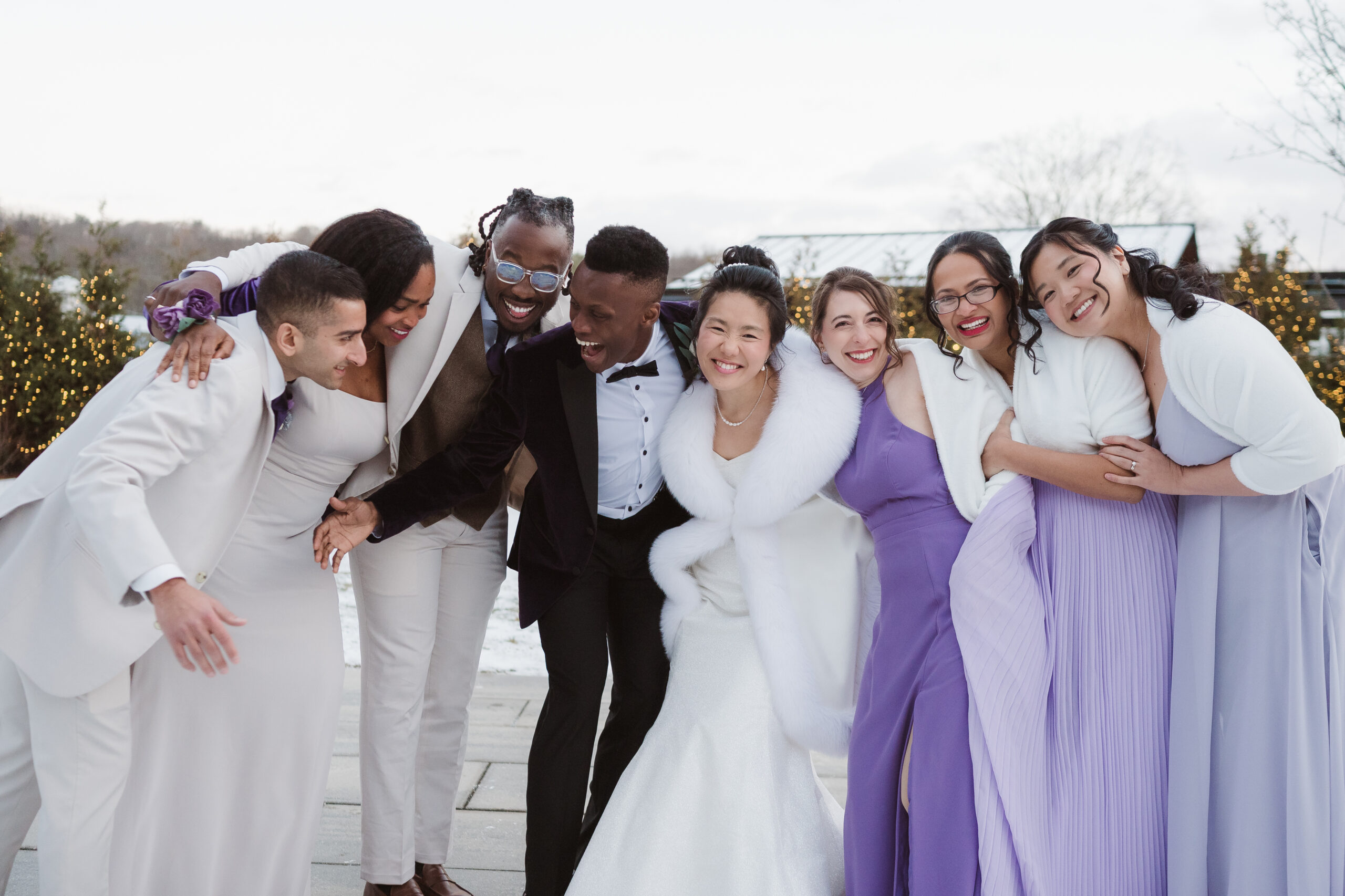 We started the photos at first look in the Reserve and portraits in the wine cellar and entrance lobby with the tree. It was December, so there were holiday decor giving the venue a winter wonderland aesthetic. After these photos at the Reserve, we went outside to the snow at the tree lined path and field. Then we met at the Reserve for portraits with the wedding party at the cocktail bar and outside area. The ceremony was indoors at night time and Perona Farms allowed the couple to bring their dog to witness the marriage. What made this wedding so unique was that they asked their maid of honor and best man to do speeches at the ceremony instead of at the Reception.