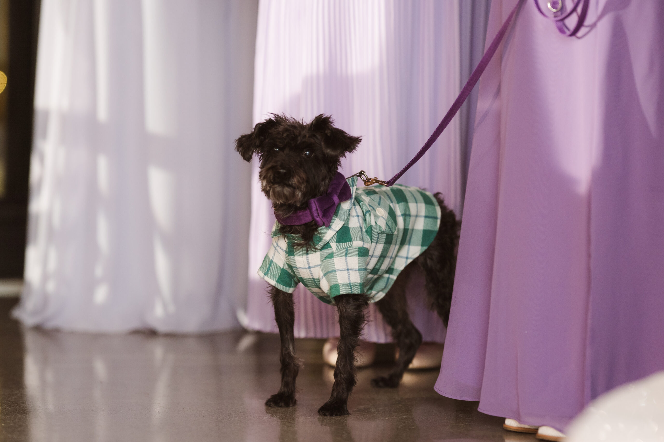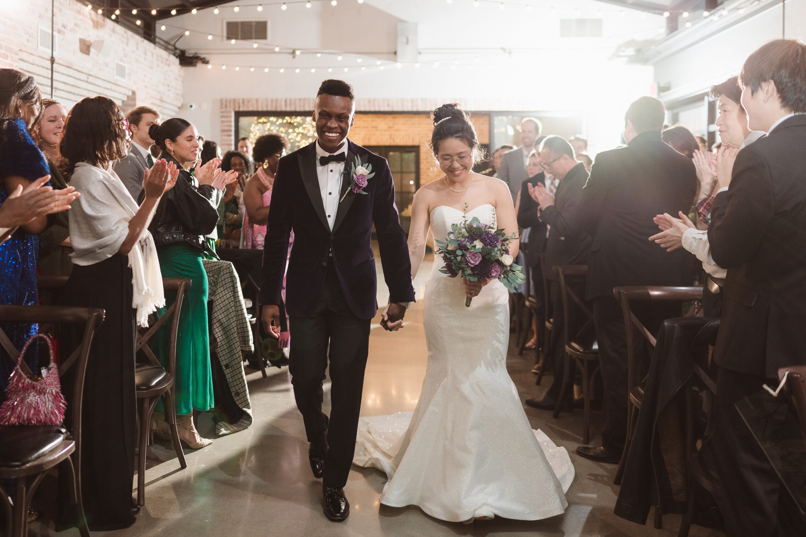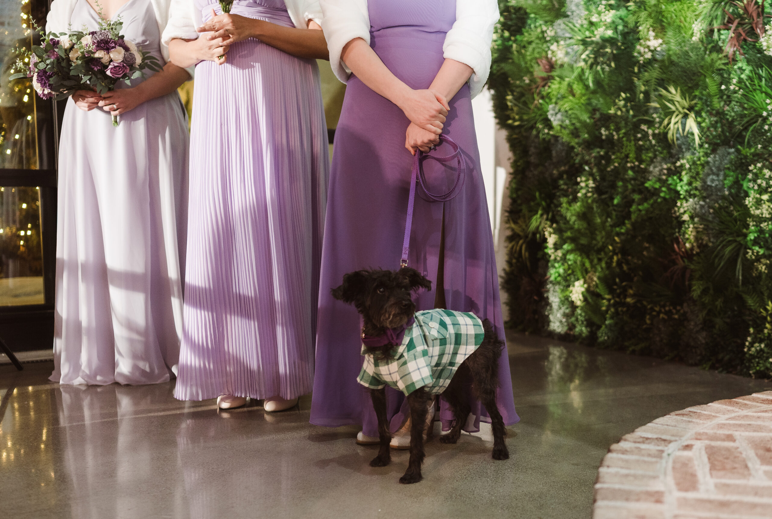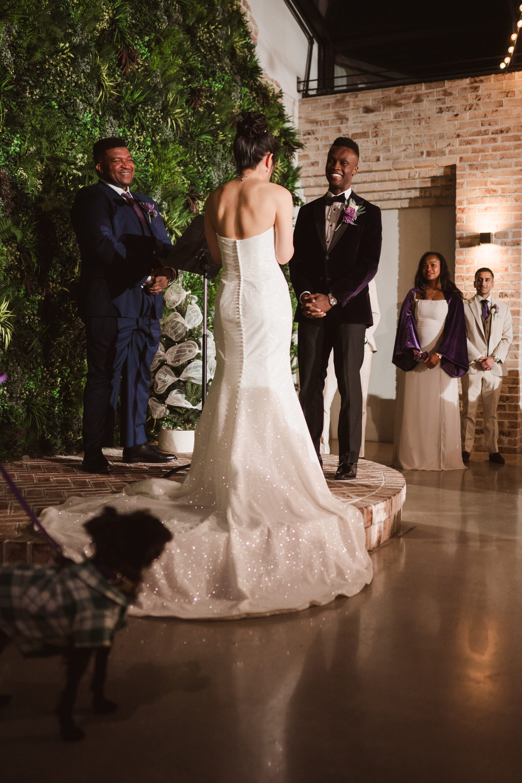 We started the photos at first look in the Reserve and portraits in the wine cellar and entrance lobby with the tree. It was December, so there were holiday decor giving the venue a winter wonderland aesthetic. After these photos at the Reserve, we went outside to the snow at the tree lined path and field. Then we met at the Reserve for portraits with the wedding party at the cocktail bar and outside area. The ceremony was indoors at night time and Perona Farms allowed the couple to bring their dog to witness the marriage. What made this wedding so unique was that they asked their maid of honor and best man to do speeches at the ceremony instead of at the Reception.