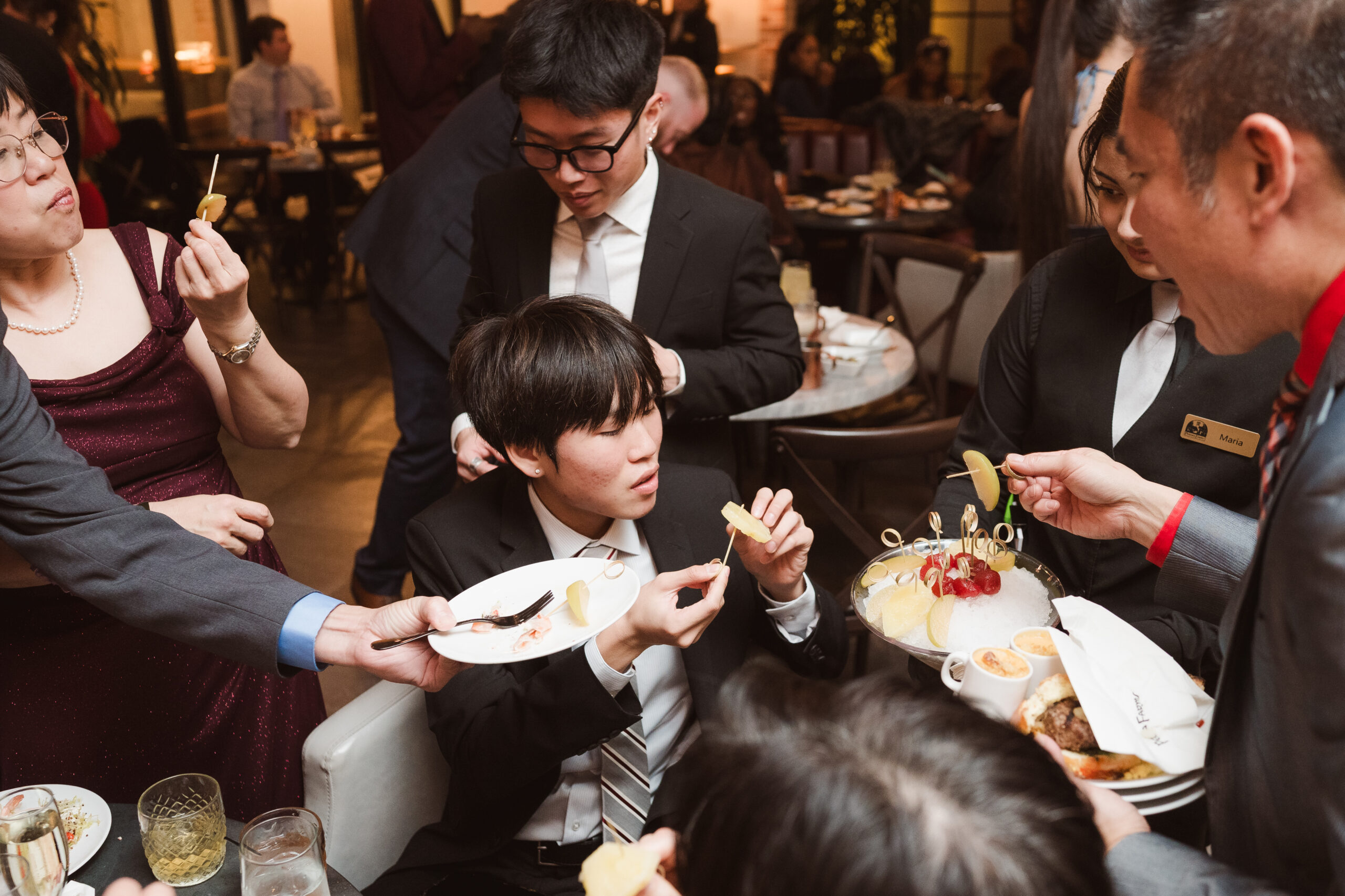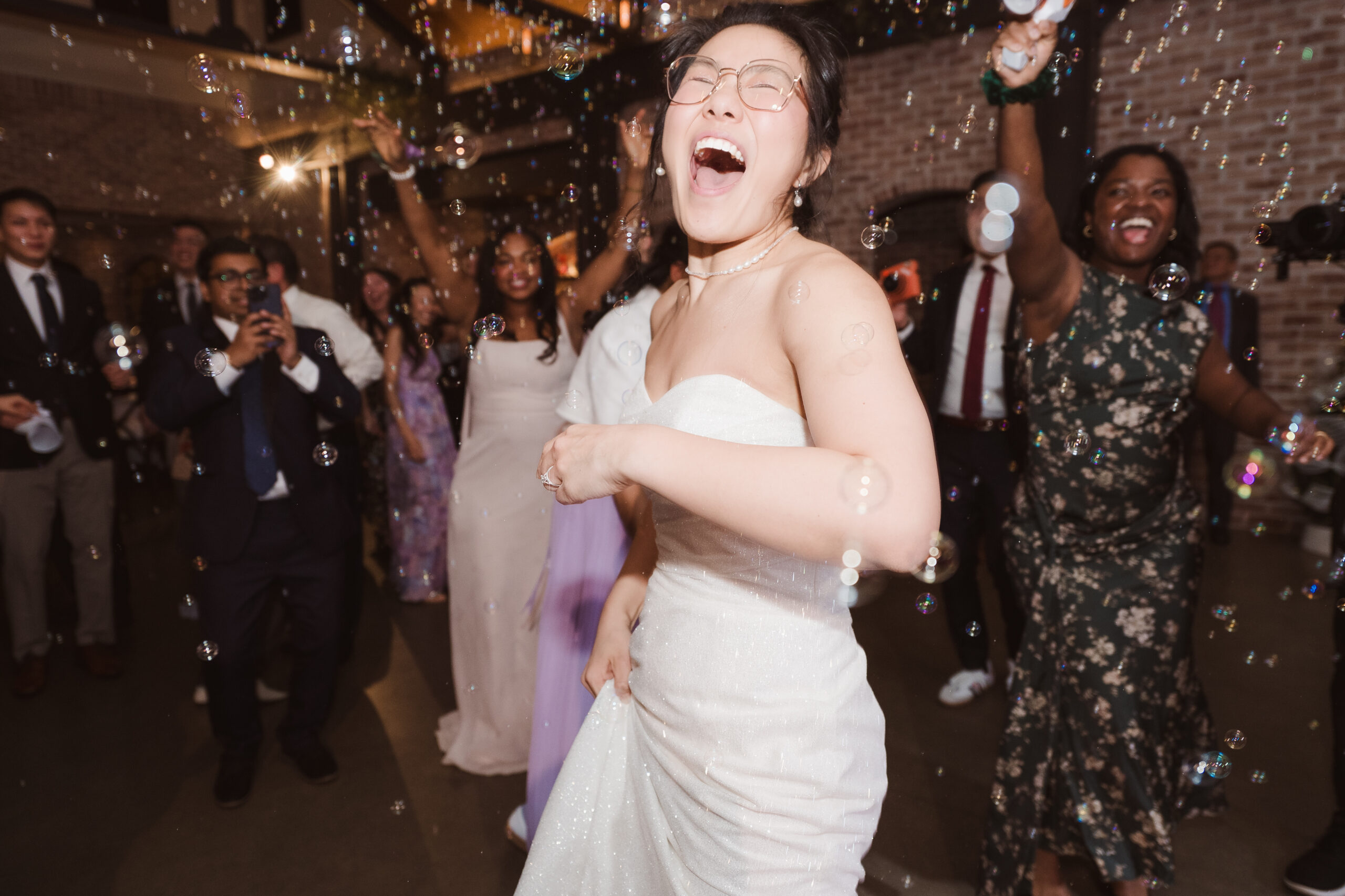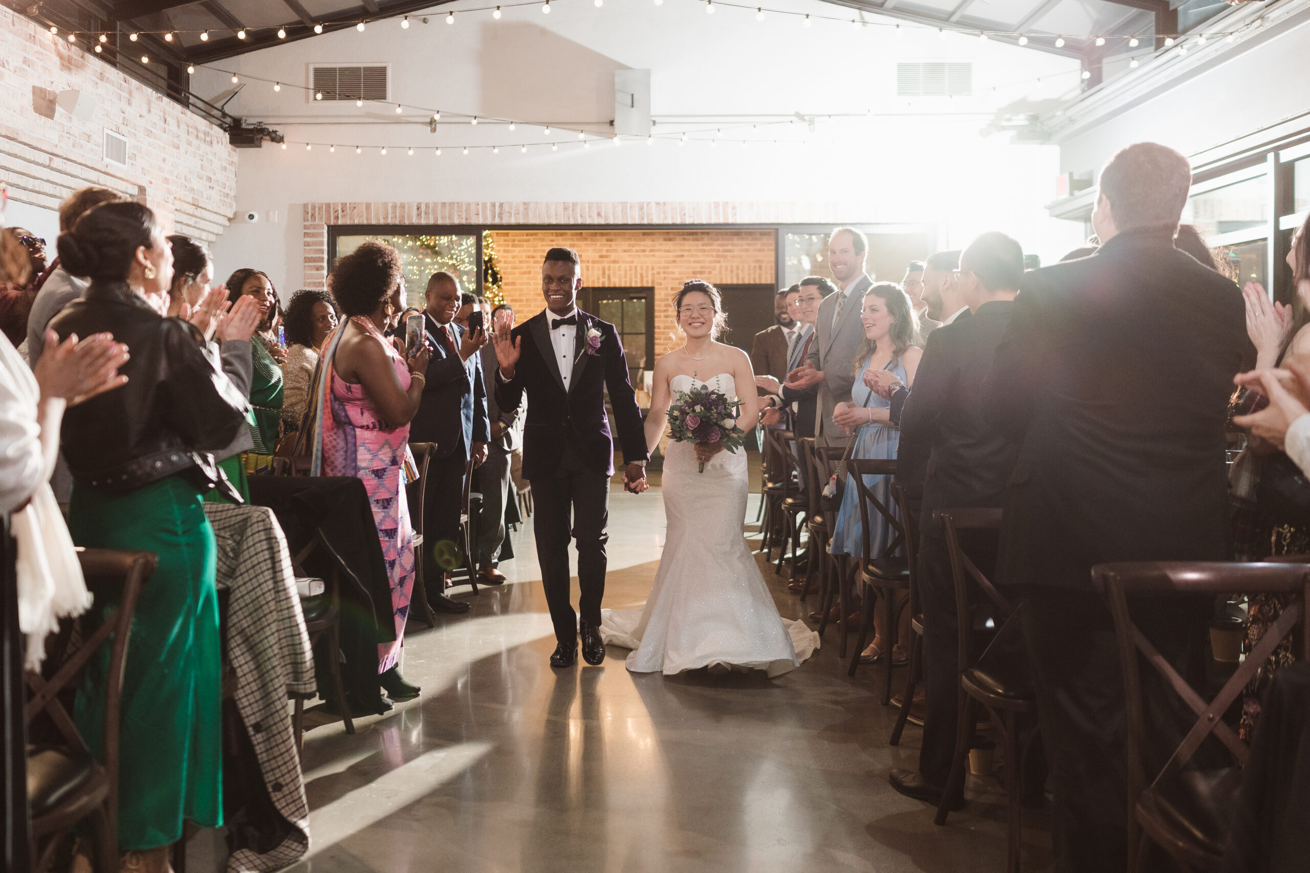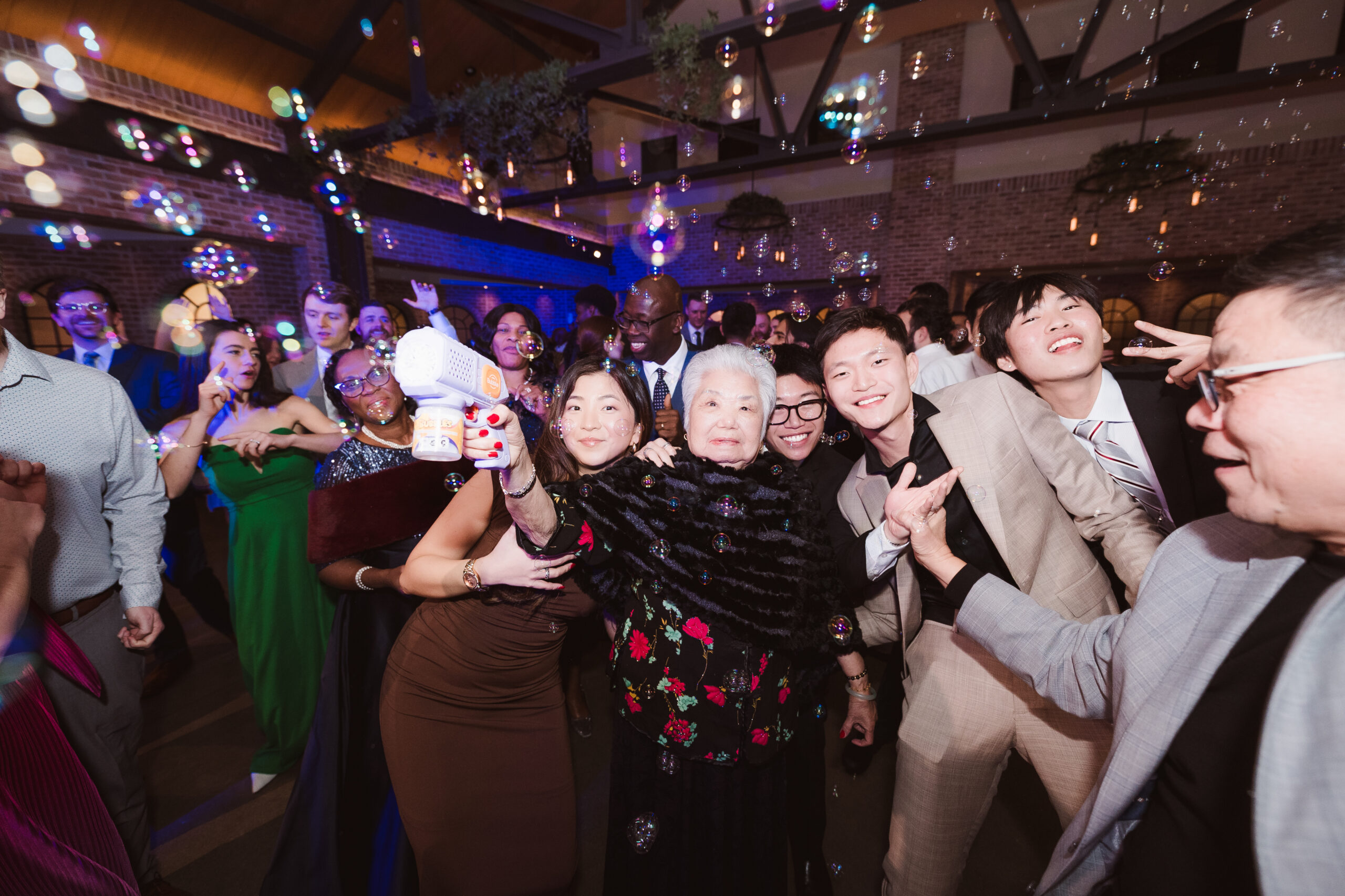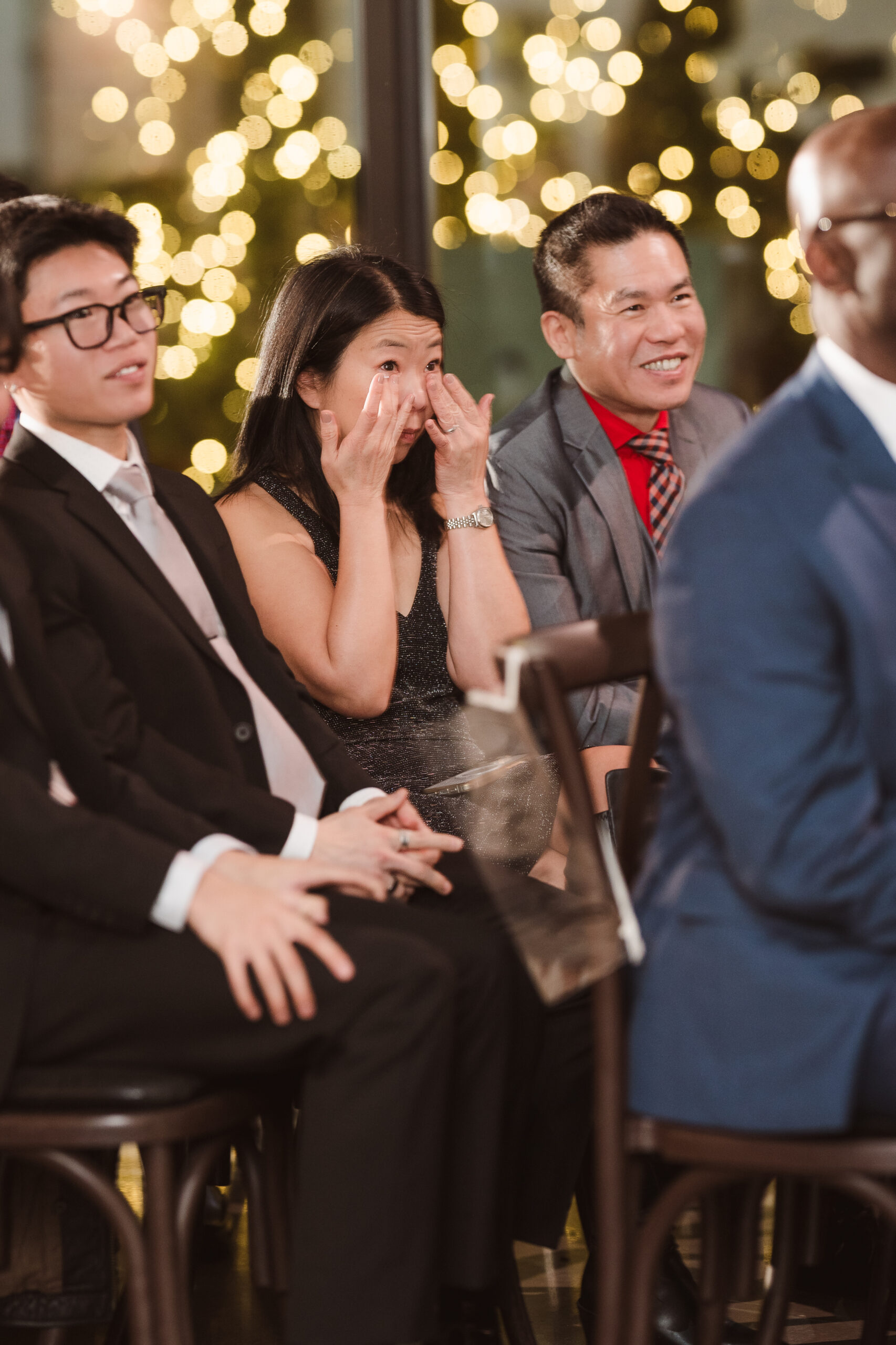 We started the photos at first look in the Reserve and portraits in the wine cellar and entrance lobby with the tree. It was December, so there were holiday decor giving the venue a winter wonderland aesthetic. After these photos at the Reserve, we went outside to the snow at the tree lined path and field. Then we met at the Reserve for portraits with the wedding party at the cocktail bar and outside area. The ceremony was indoors at night time and Perona Farms allowed the couple to bring their dog to witness the marriage. What made this wedding so unique was that they asked their maid of honor and best man to do speeches at the ceremony instead of at the Reception.