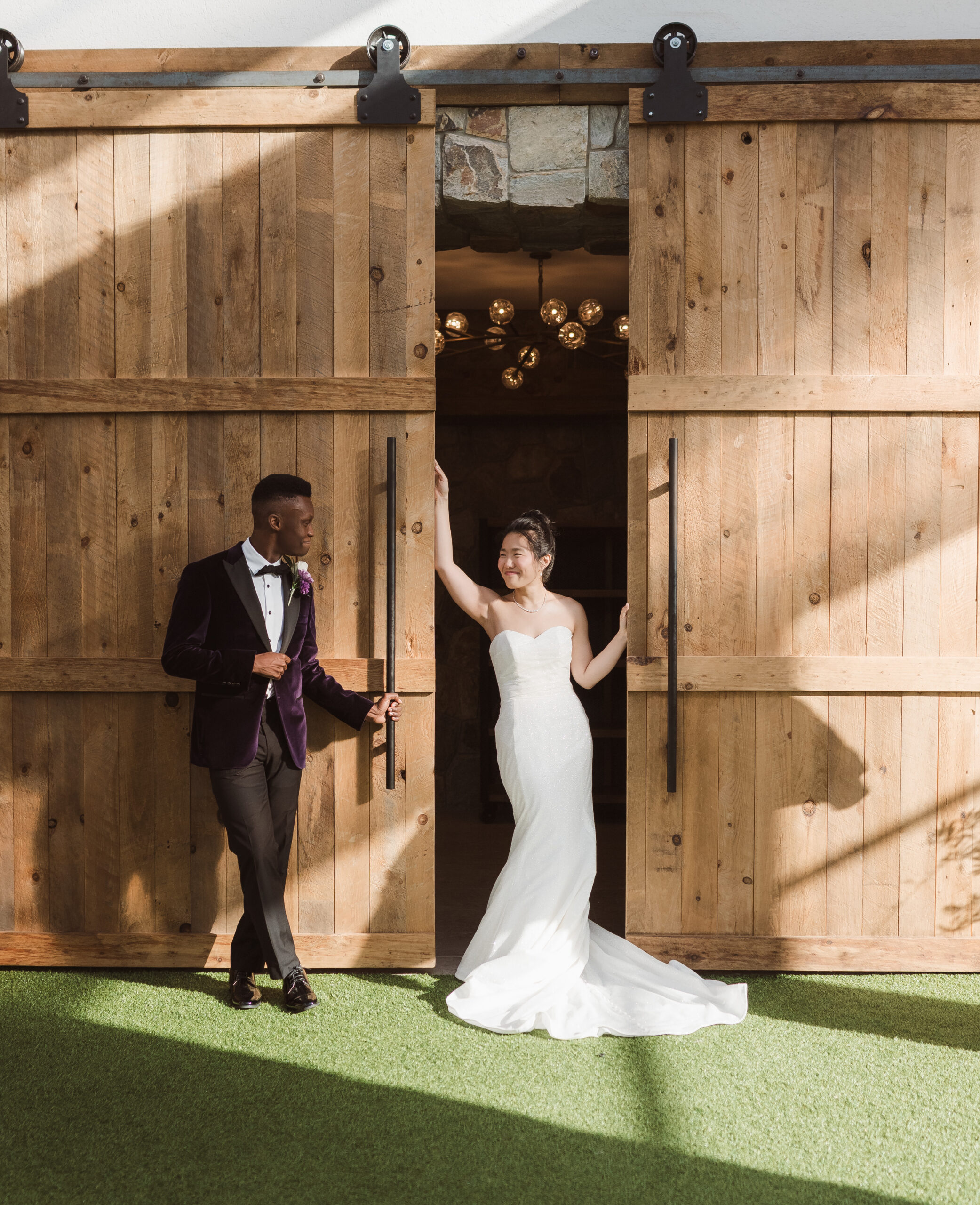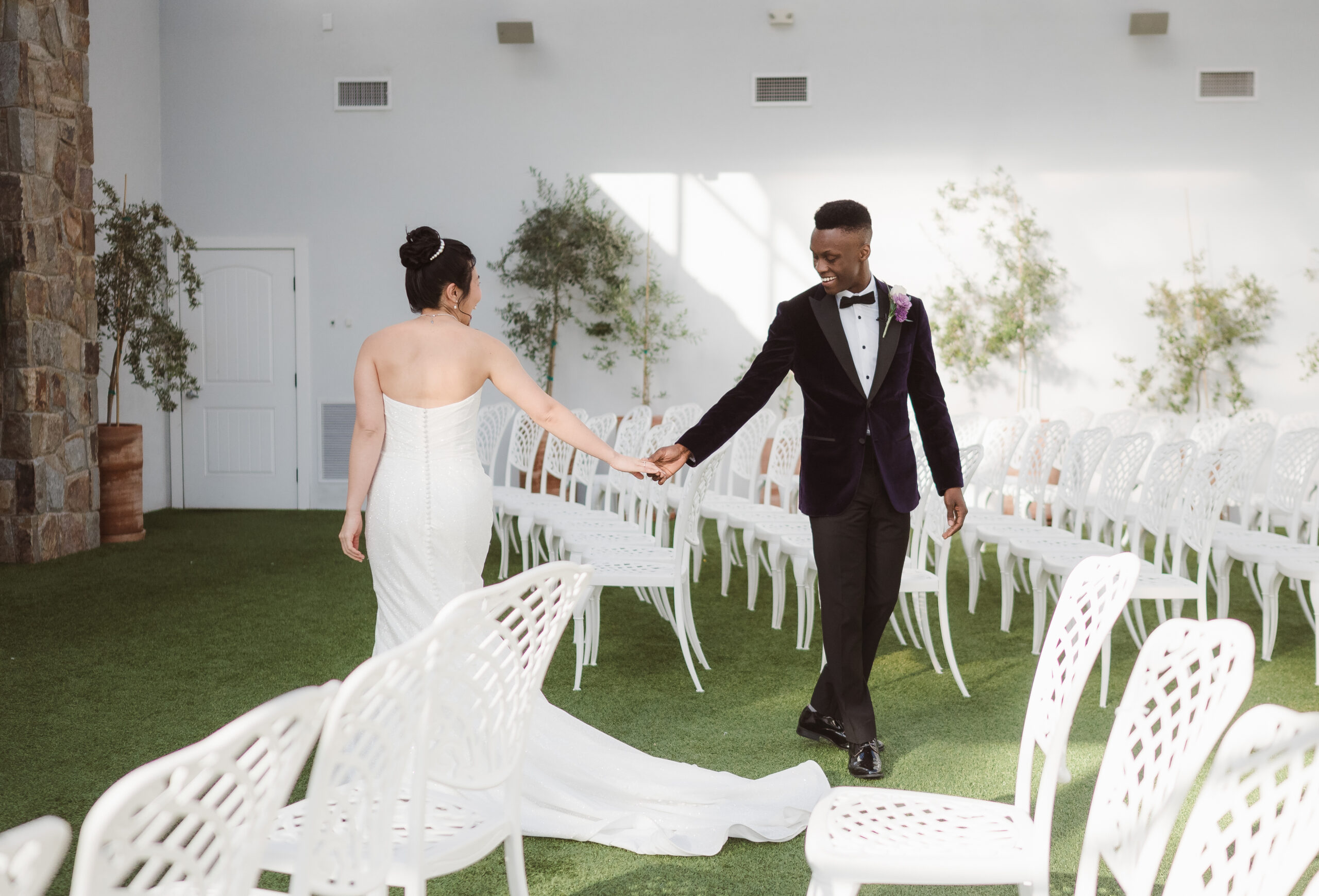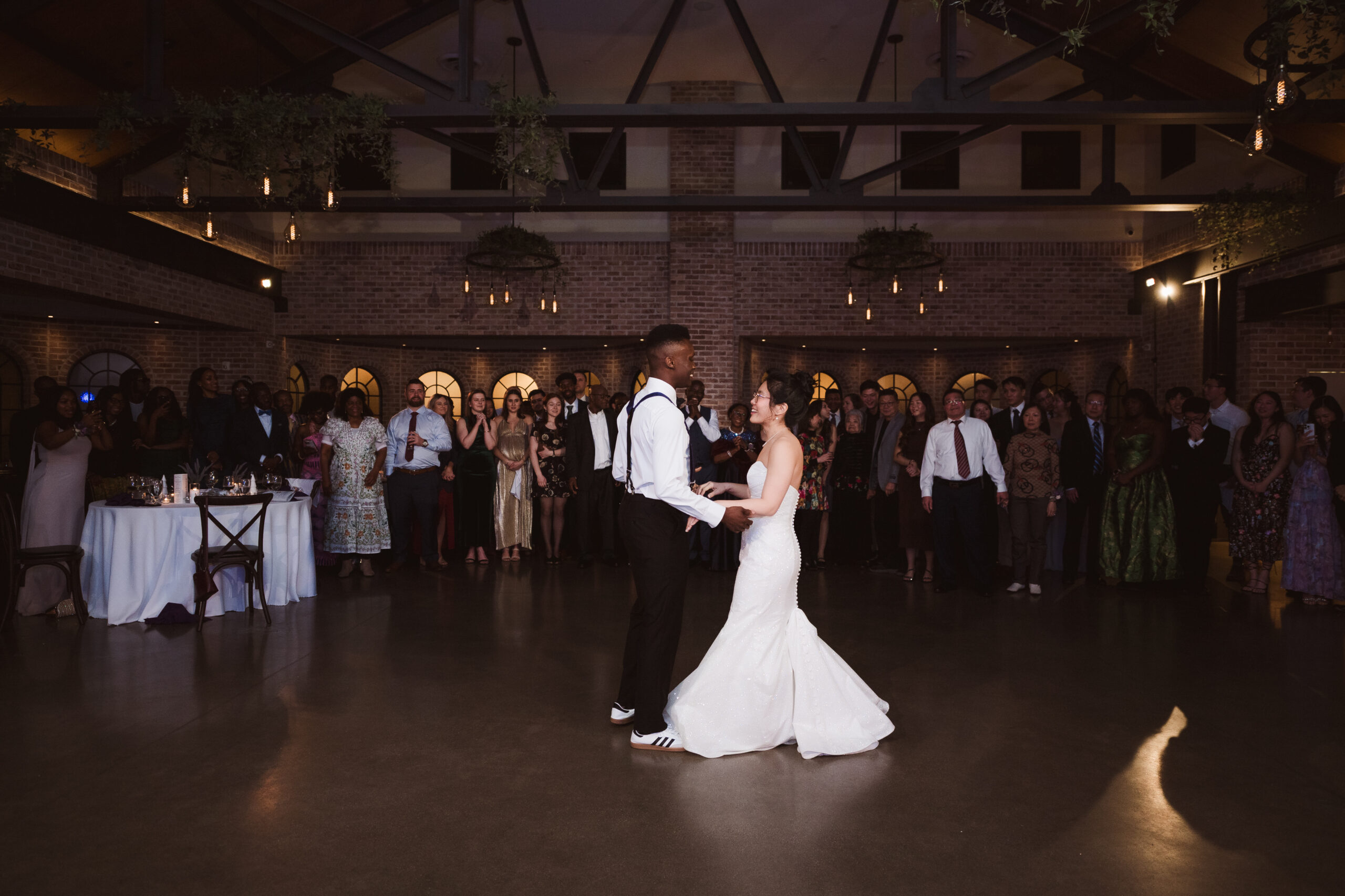 The Refinery offers a completely different aesthetic with industrial architecture, modern finishes, and rich dark accents. A hidden speakeasy-style door concealed behind a mirror connects cocktail hour to the getting ready spaces, which sit side by side for the bride and groom. These suites are far more photogenic, making The Refinery the stronger choice if getting-in-the-dress portraits are important to your wedding story.