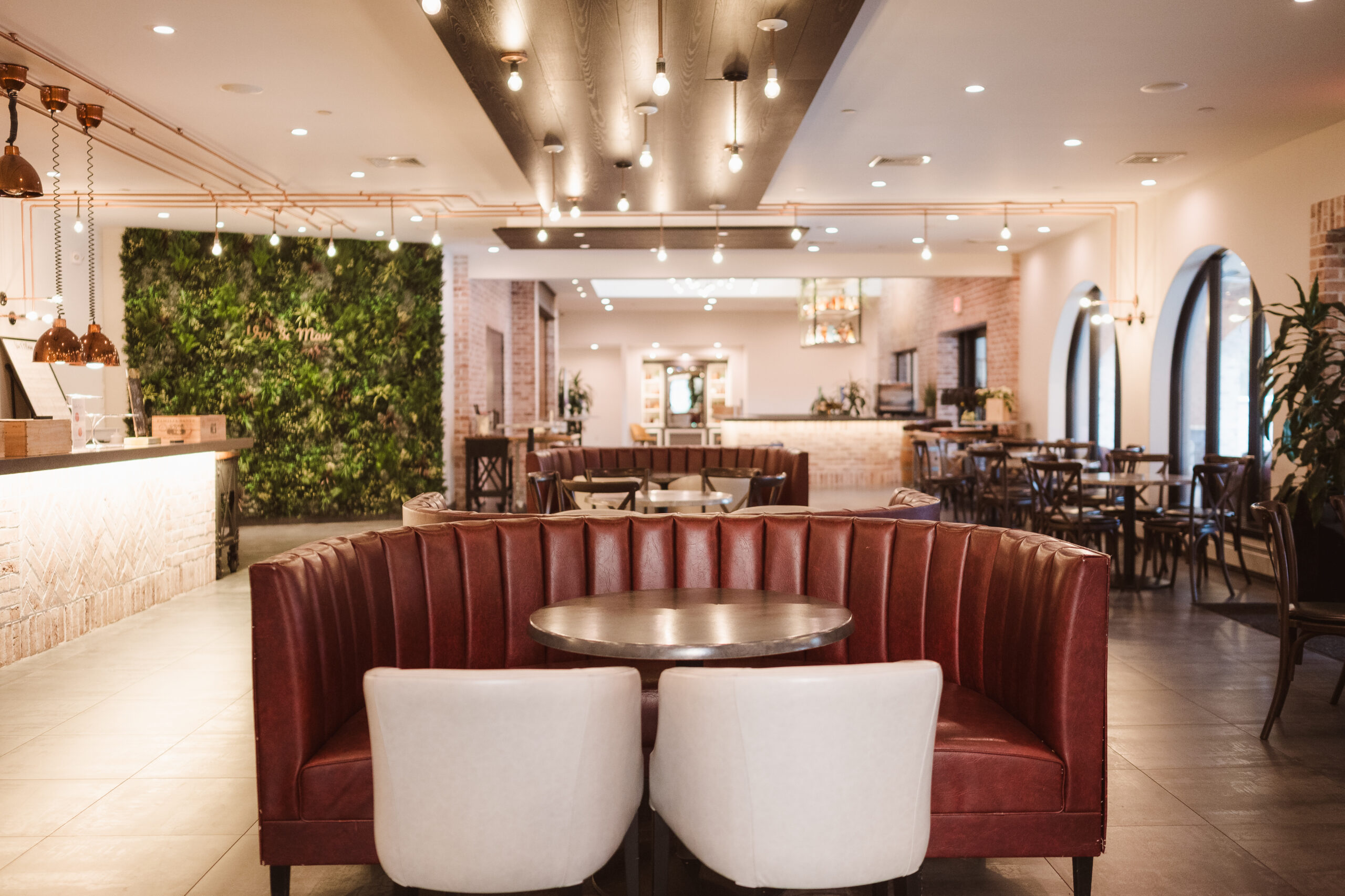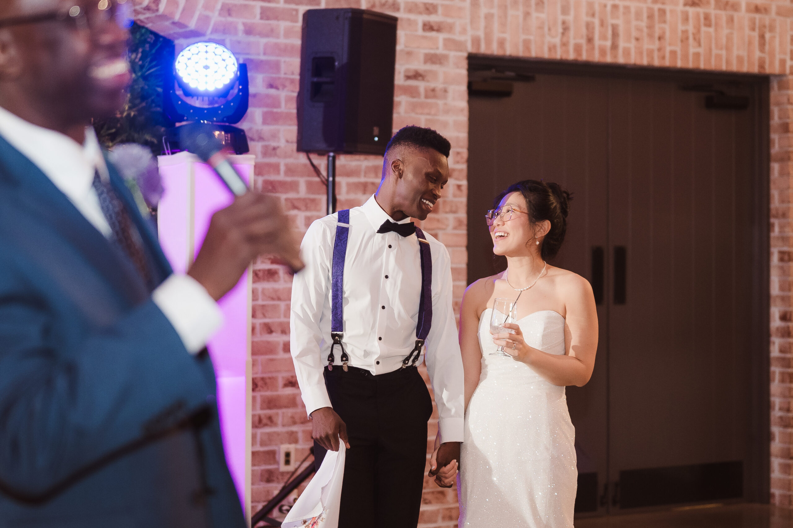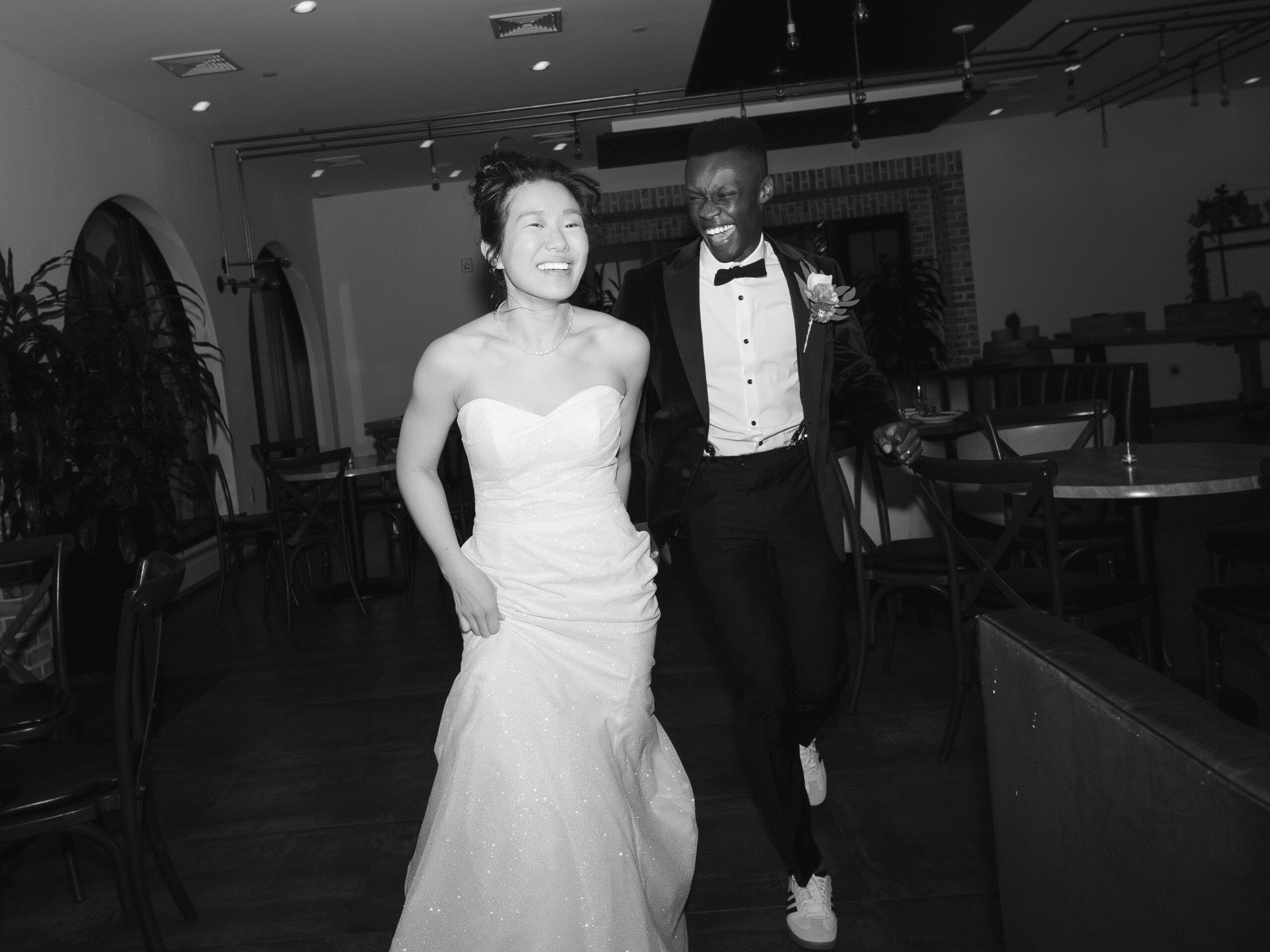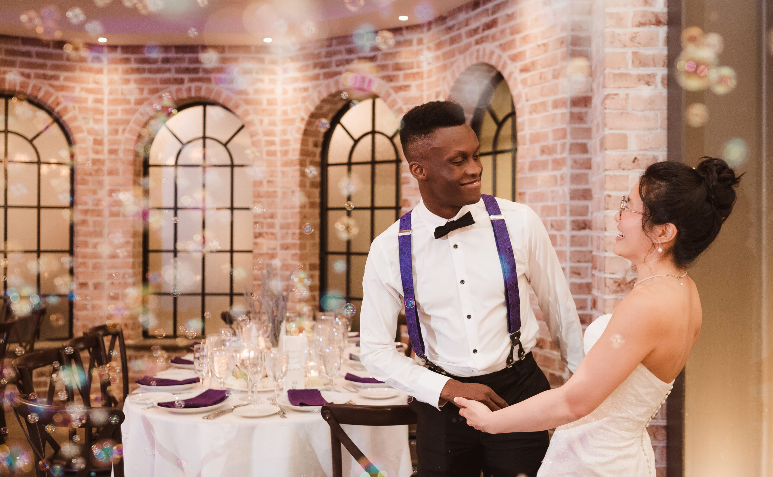 The Refinery offers a completely different aesthetic with industrial architecture, modern finishes, and rich dark accents. A hidden speakeasy-style door concealed behind a mirror connects cocktail hour to the getting ready spaces, which sit side by side for the bride and groom. These suites are far more photogenic, making The Refinery the stronger choice if getting-in-the-dress portraits are important to your wedding story.