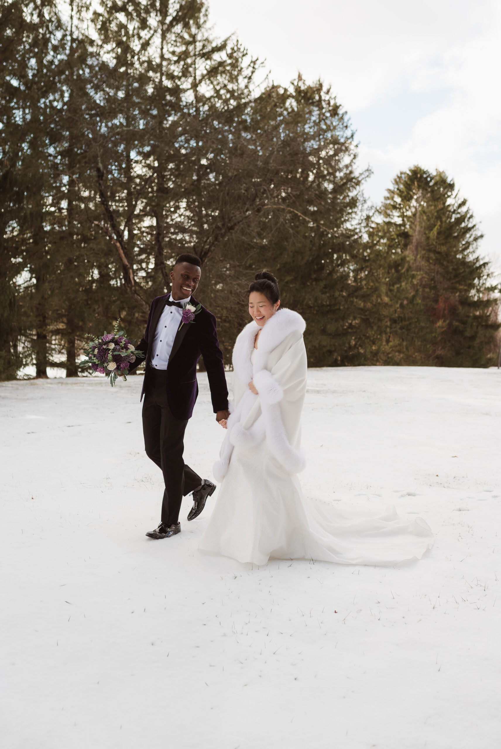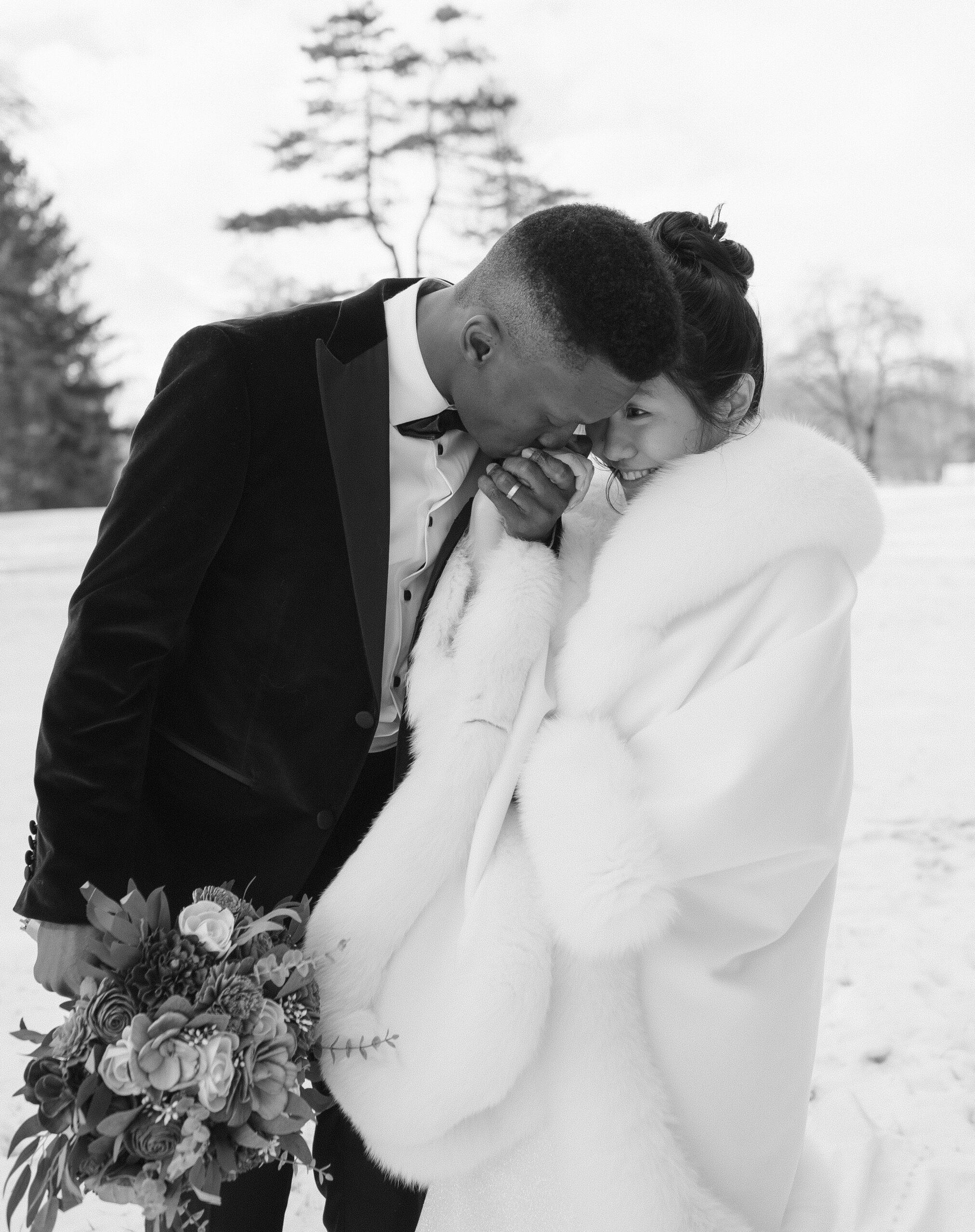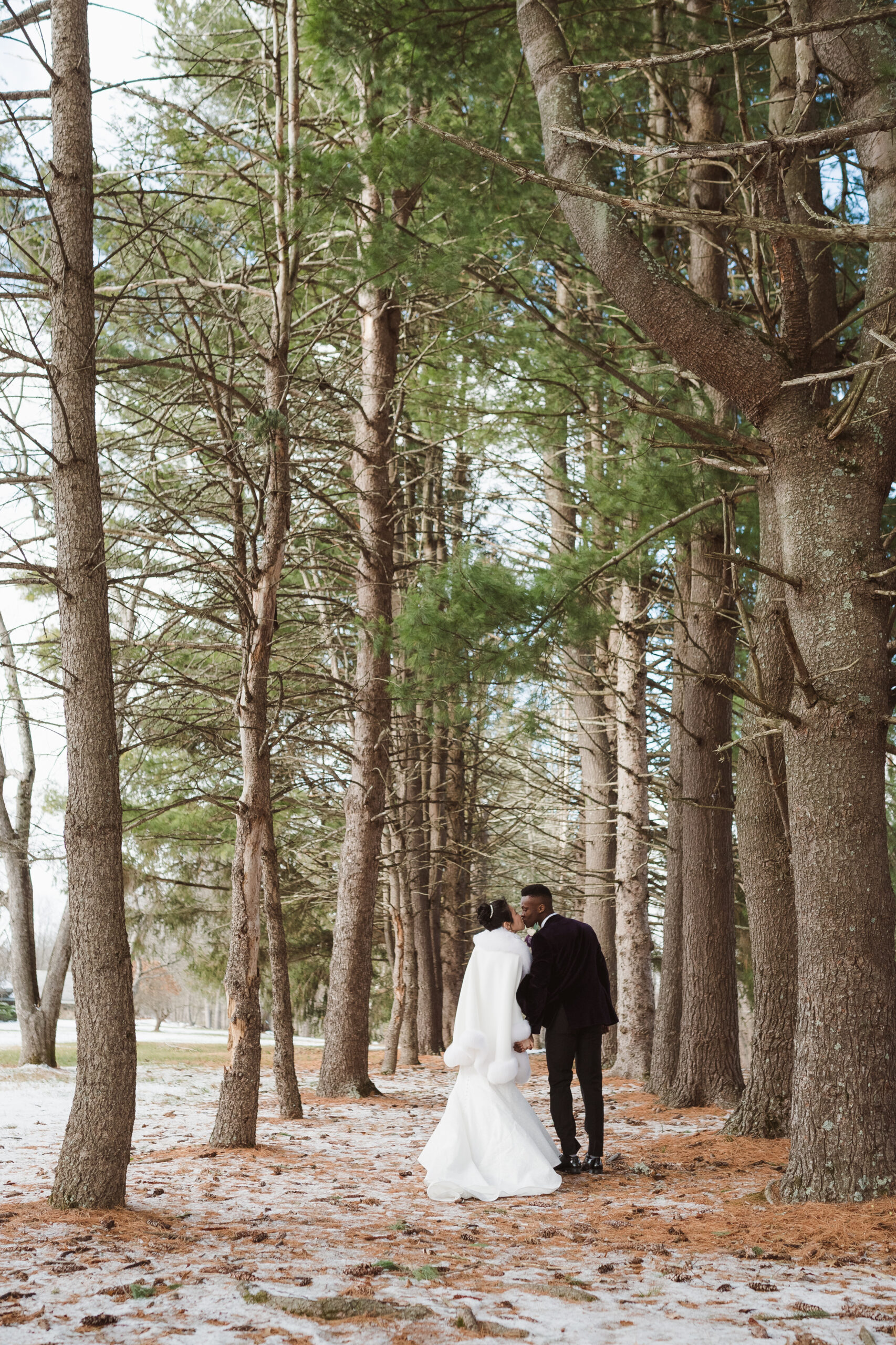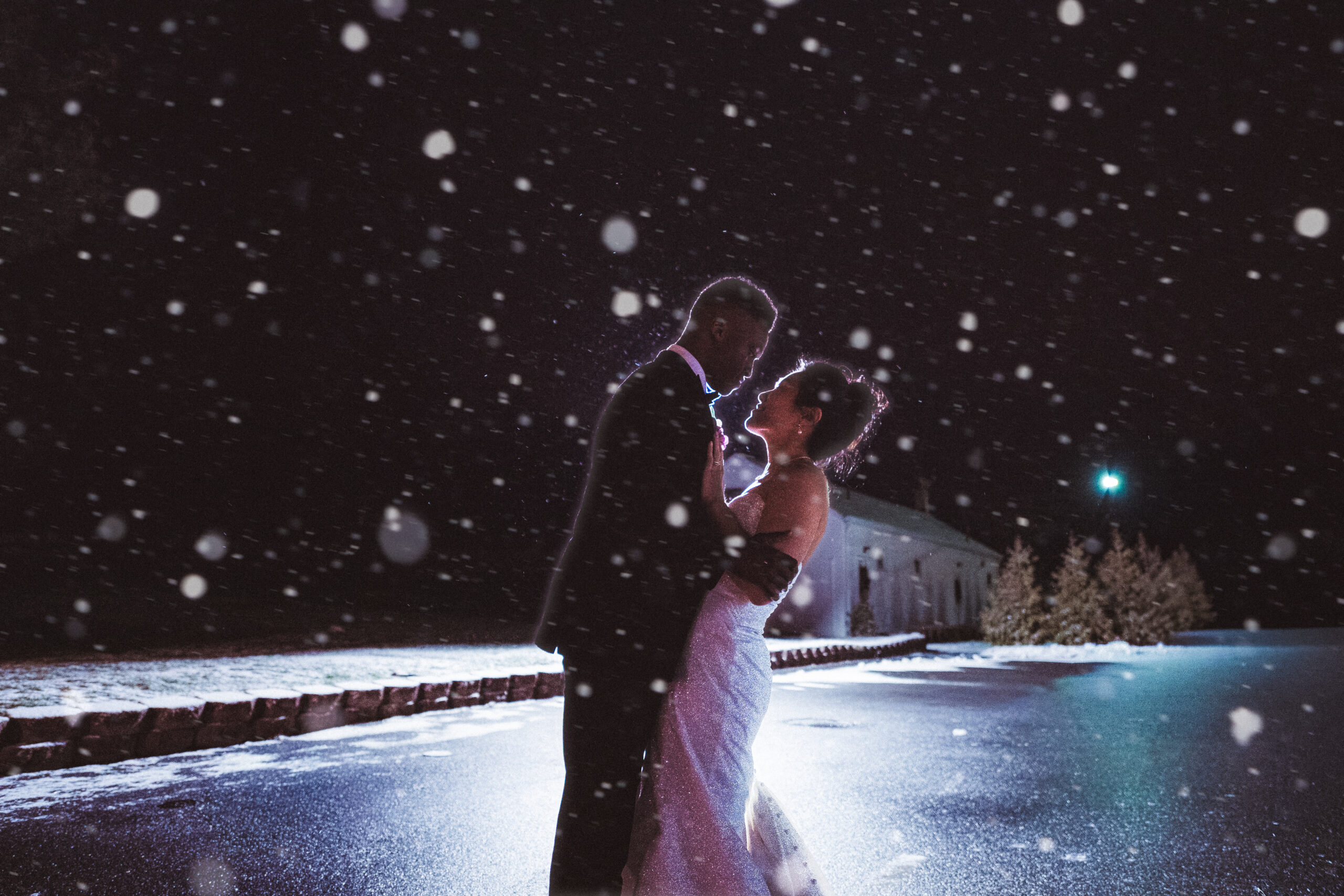 This couple was blessed with the dreamiest winter snowfall wedding at Perona Farms New Jersey, with access to both the Refinery and the Reserve for portraits throughout the day. Even though one space would have been more than enough for cozy indoor photos on a freezing cold afternoon, they fully embraced the magic of the season. We wandered through snow-covered, tree-lined paths for romantic outdoor portraits, stepped into the Reserve’s cocktail hour space for warm and intimate moments, and even snuck out at night for cinematic snowfall photos in the parking lot under glowing lights. The cold did not stand a chance against that kind of joy. It felt like a real life snow globe and they leaned all the way in.