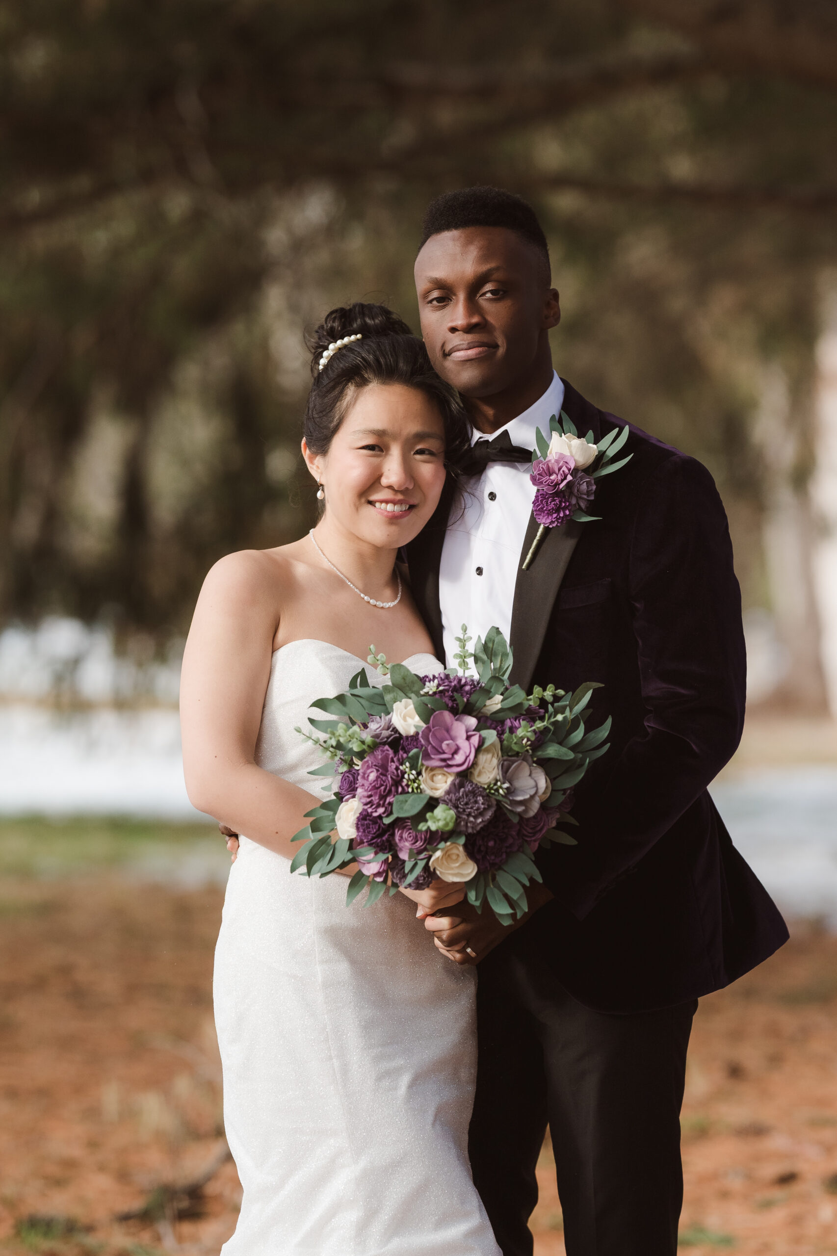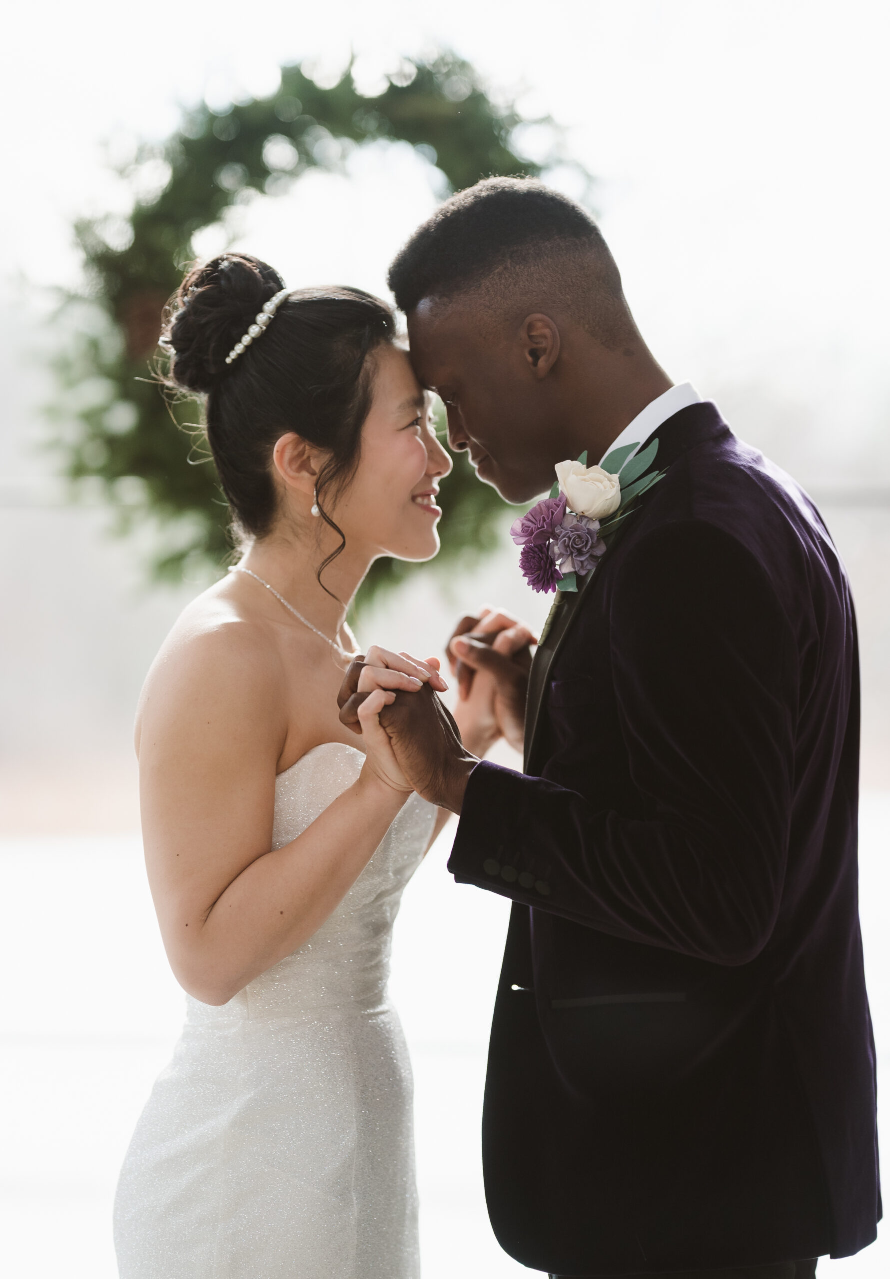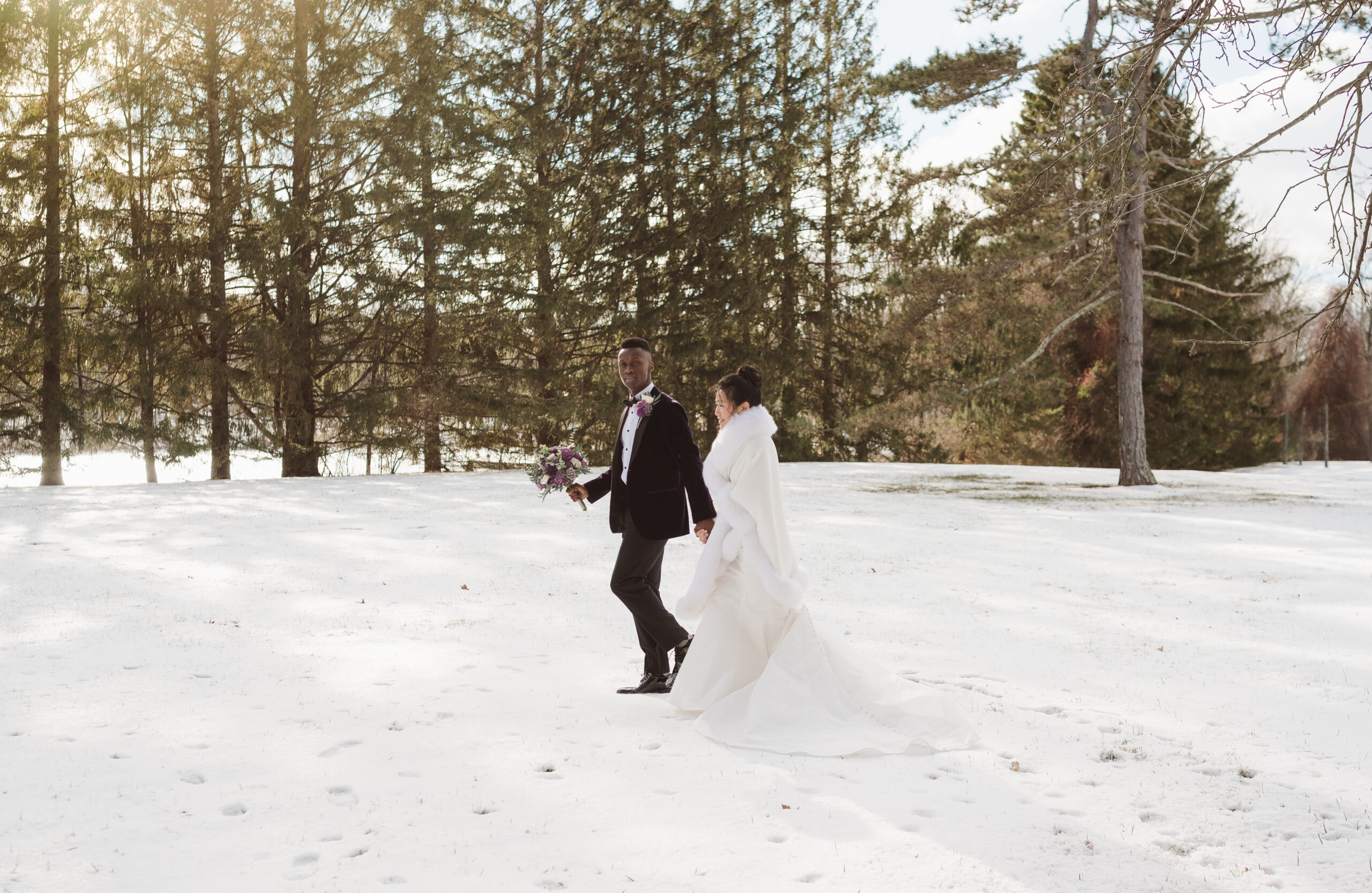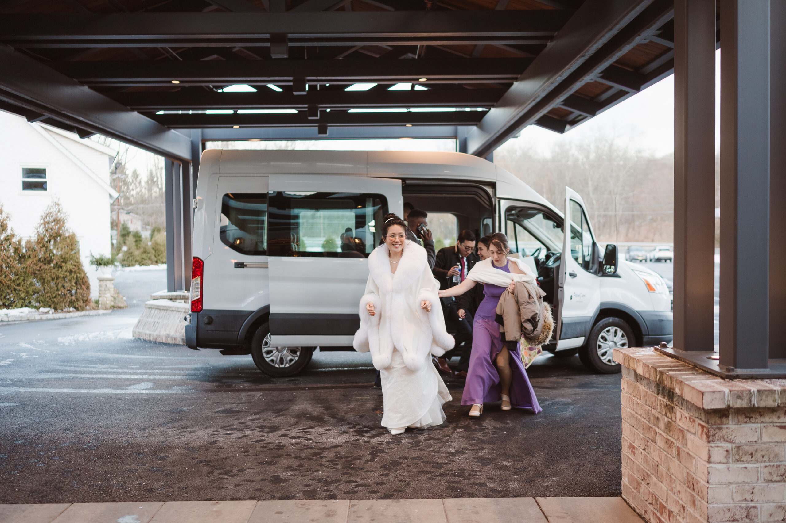 This couple was blessed with the dreamiest winter snowfall wedding at Perona Farms New Jersey, with access to both the Refinery and the Reserve for portraits throughout the day. Even though one space would have been more than enough for cozy indoor photos on a freezing cold afternoon, they fully embraced the magic of the season. We wandered through snow-covered, tree-lined paths for romantic outdoor portraits, stepped into the Reserve’s cocktail hour space for warm and intimate moments, and even snuck out at night for cinematic snowfall photos in the parking lot under glowing lights. The cold did not stand a chance against that kind of joy. It felt like a real life snow globe and they leaned all the way in.